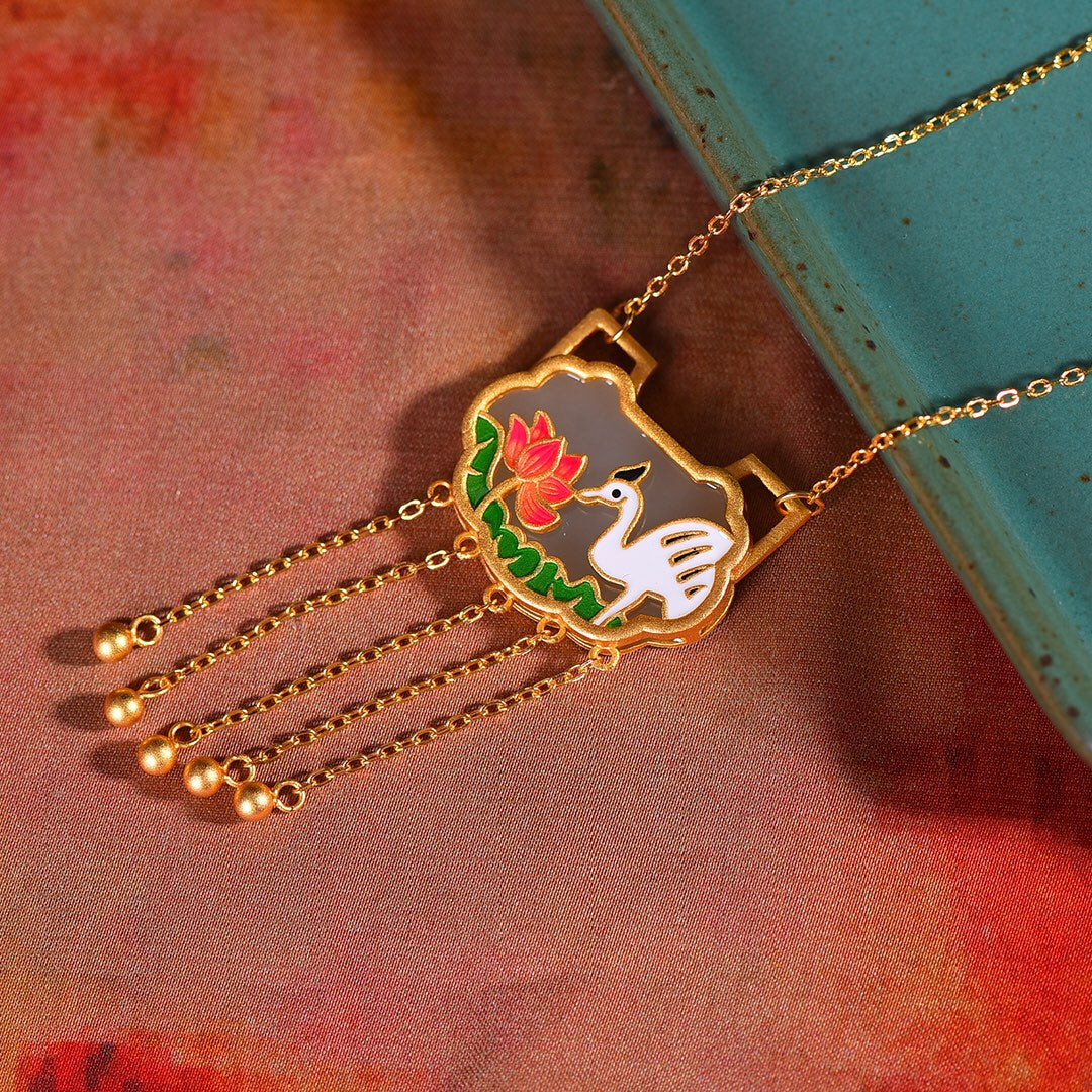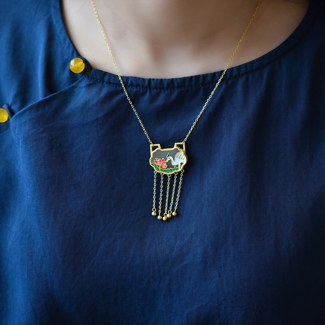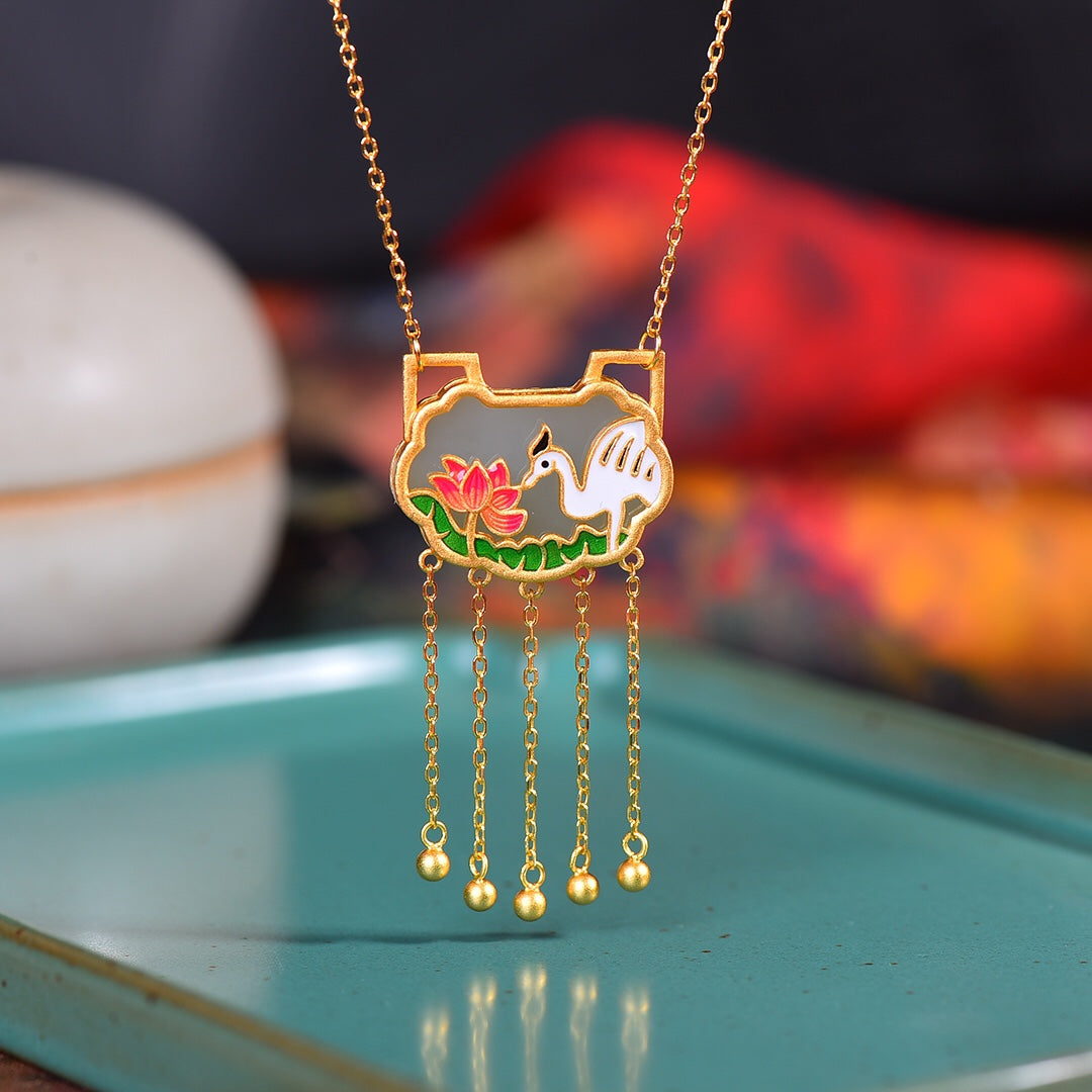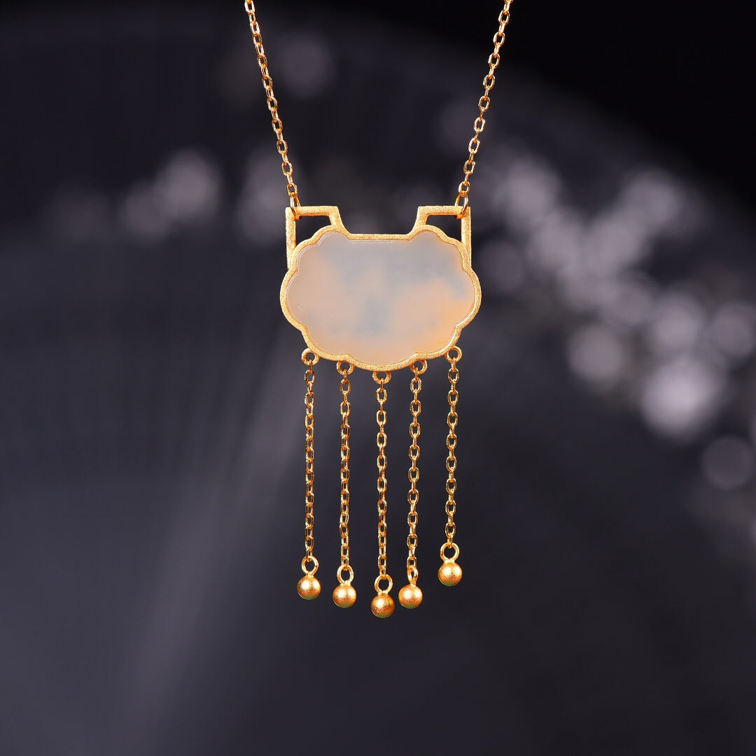 Silver gilt inlaid Hetian jade enamel Ruyi lock pendant