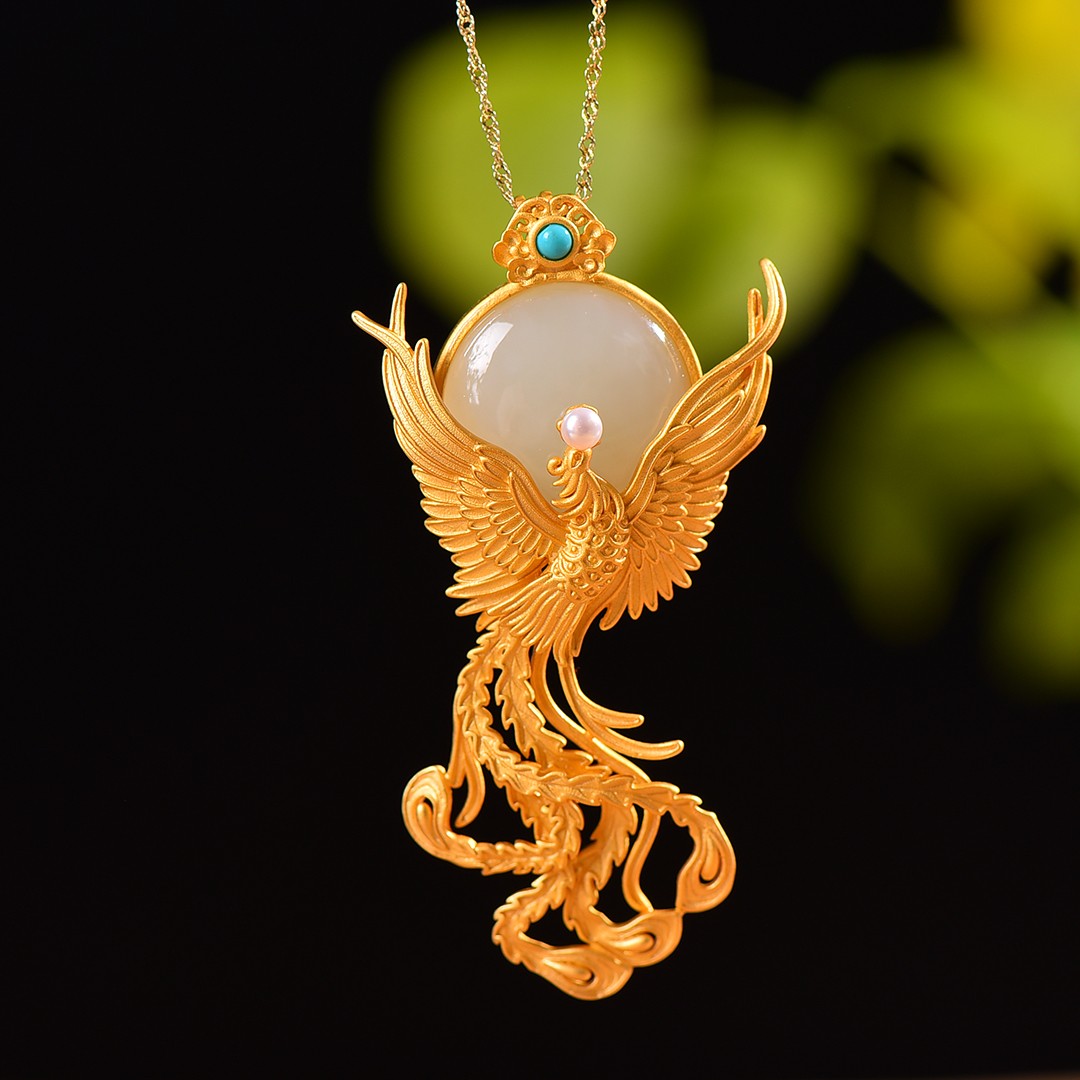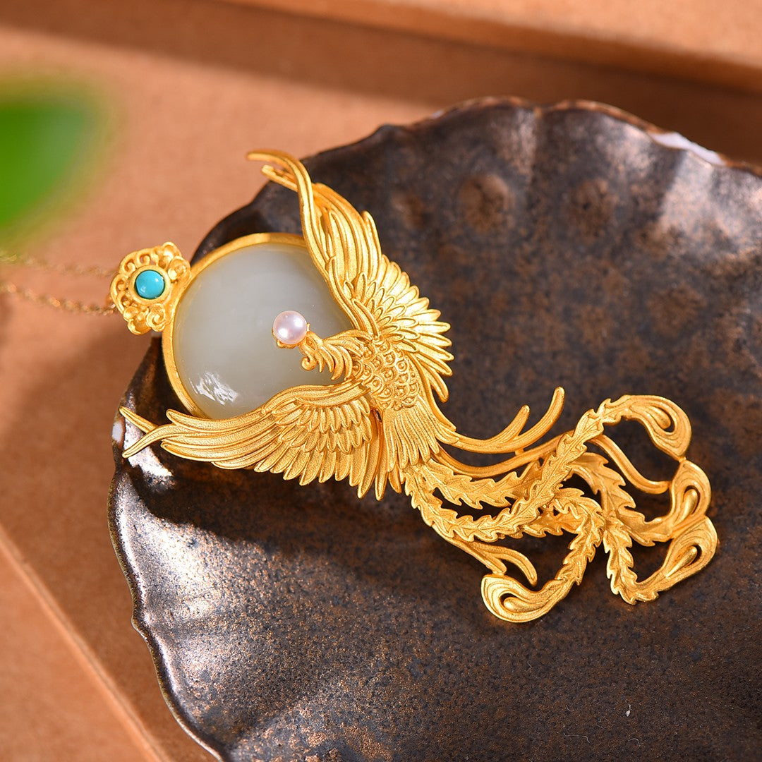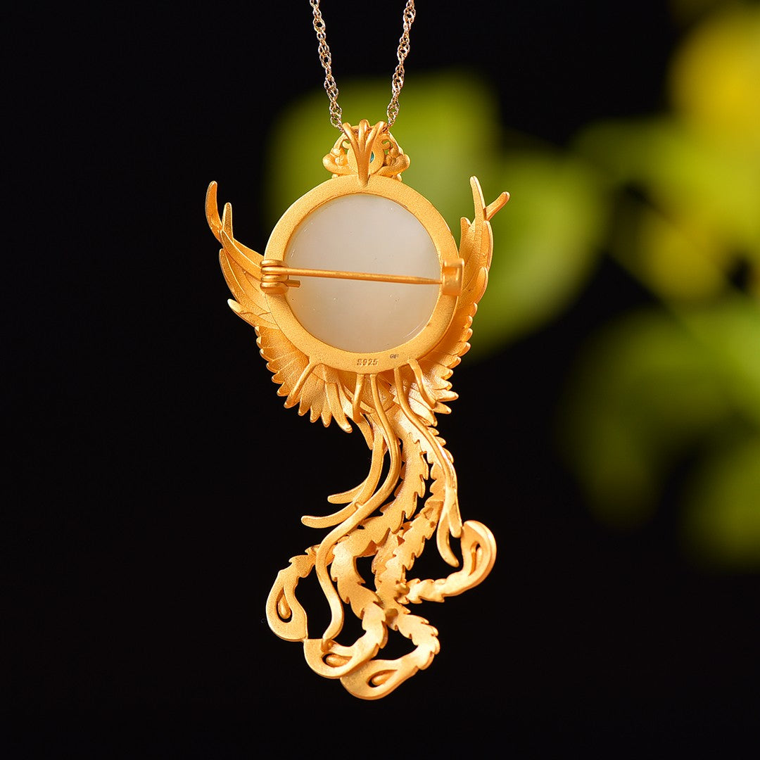 Silver gilt inlaid Hetian jade phoenix dance nine days brooch pendant dual use