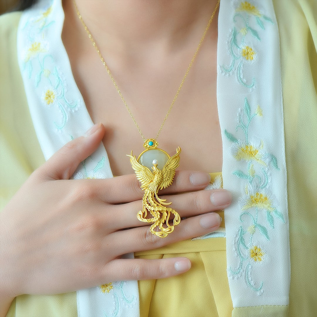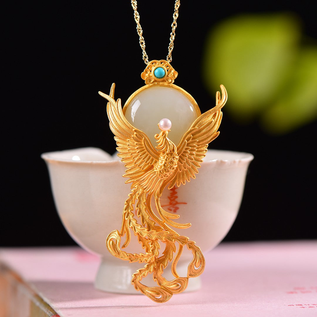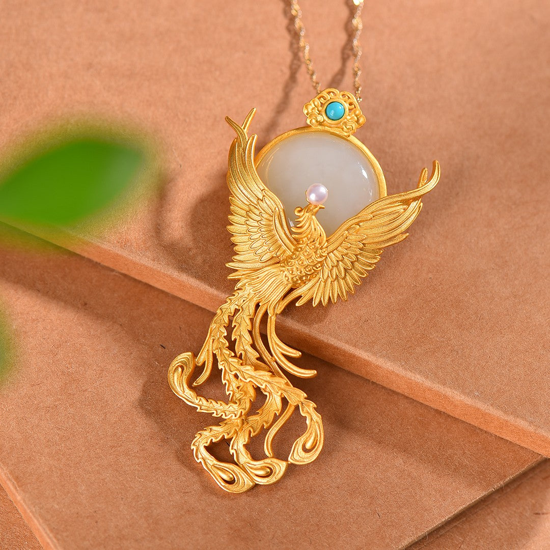 Silver gilt inlaid Hetian jade phoenix dance nine days brooch pendant dual use