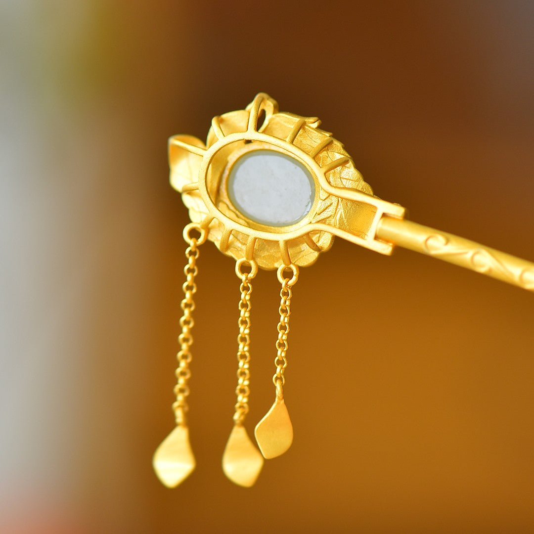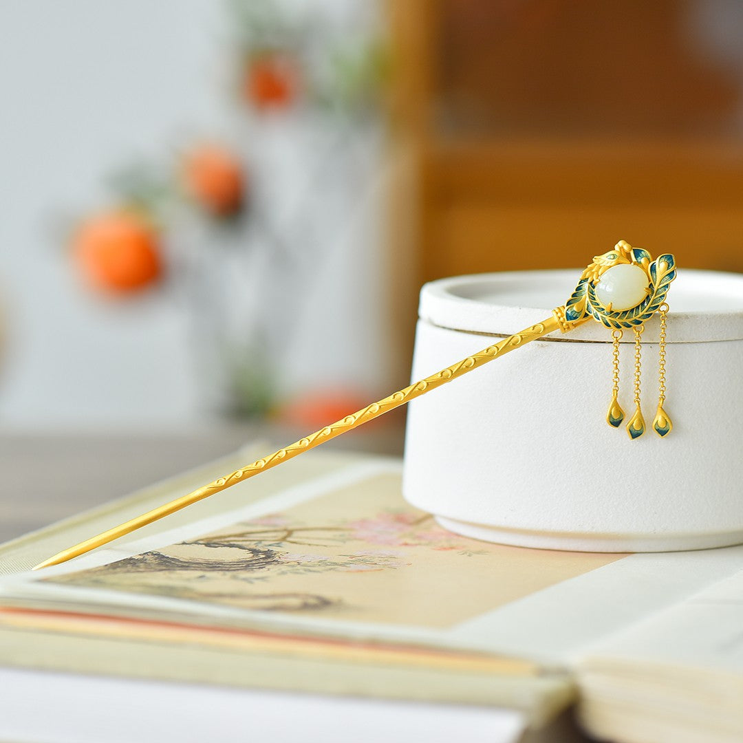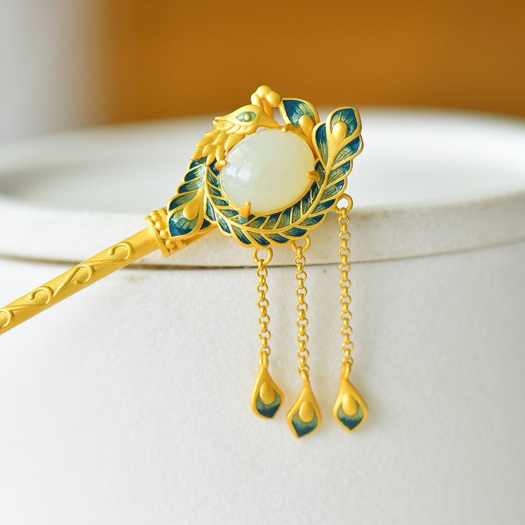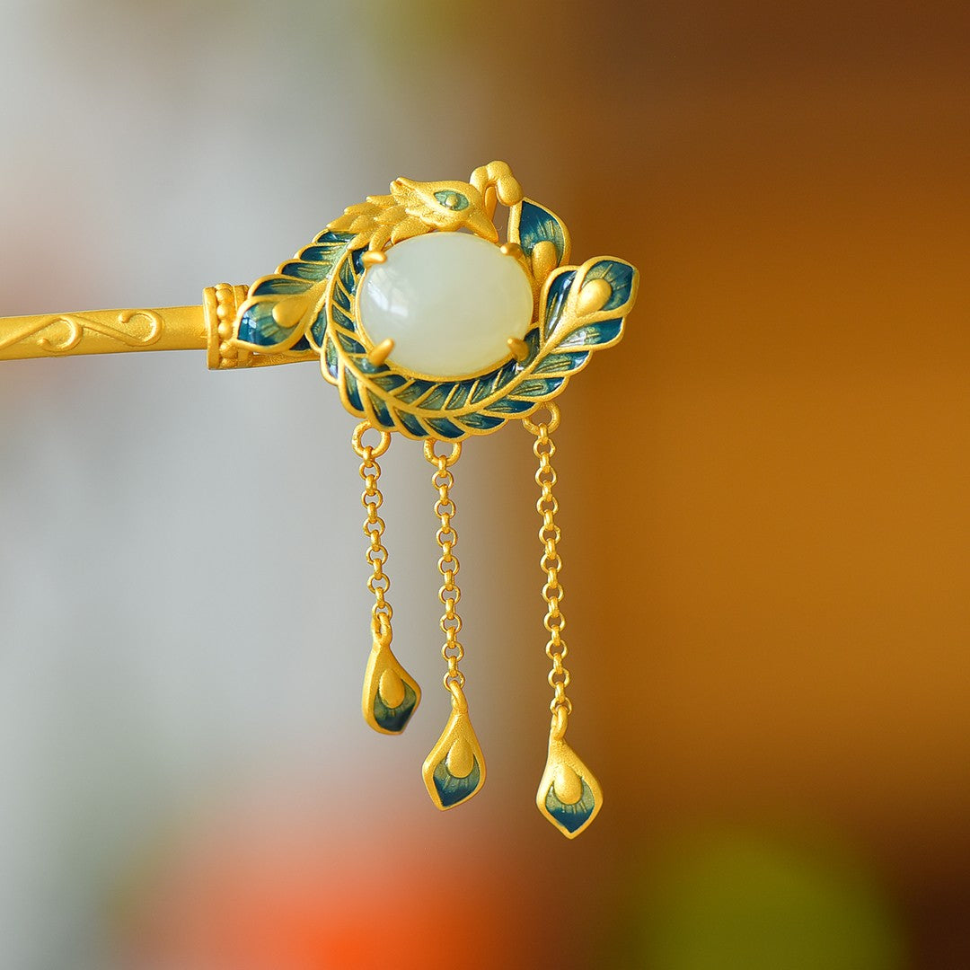Silver gilt inlaid Hetian jade Phoenix Nirvana tassel hairpin