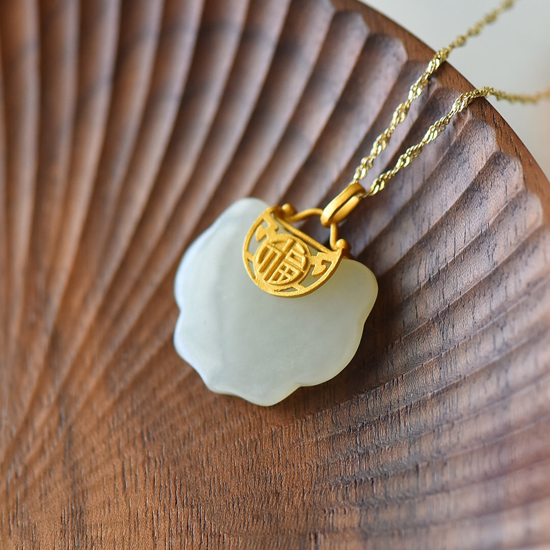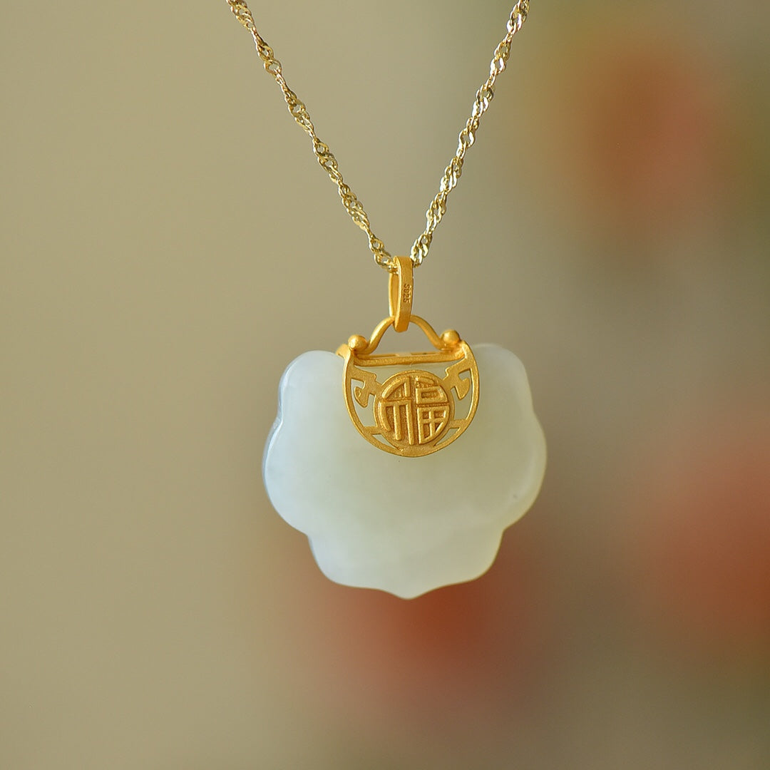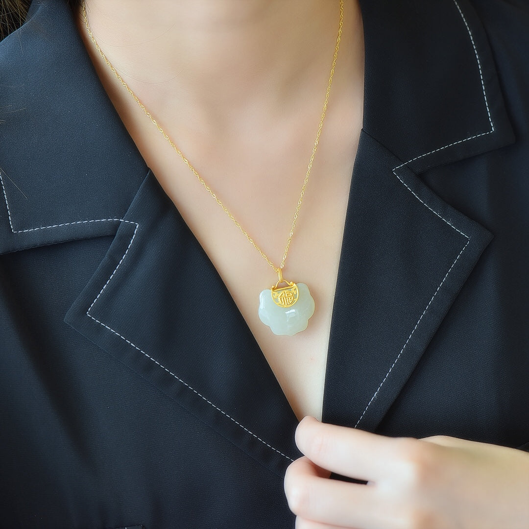 Silver gilt inlaid Hetian jade Ruyi lock pendant with the word "Fu"