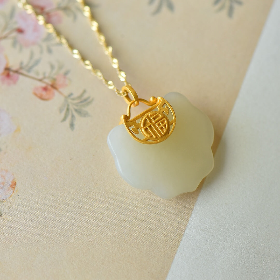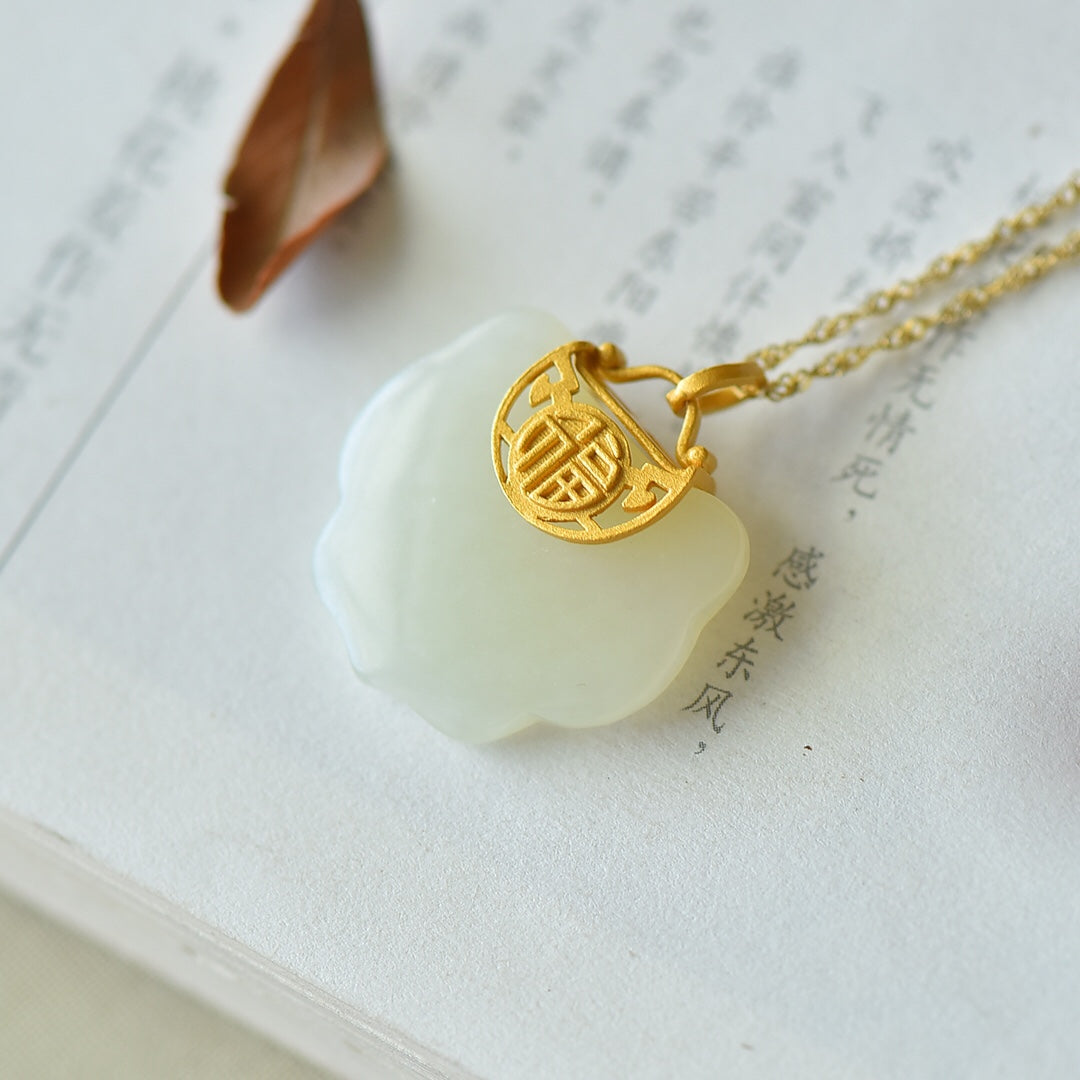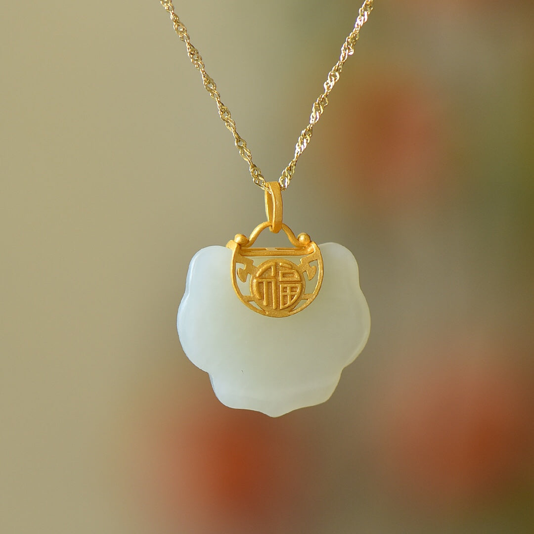 Silver gilt inlaid Hetian jade Ruyi lock pendant with the word "Fu"