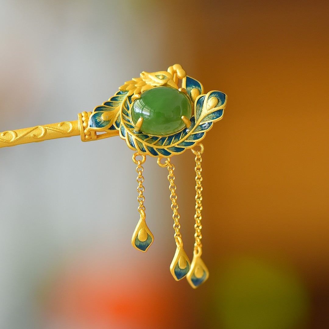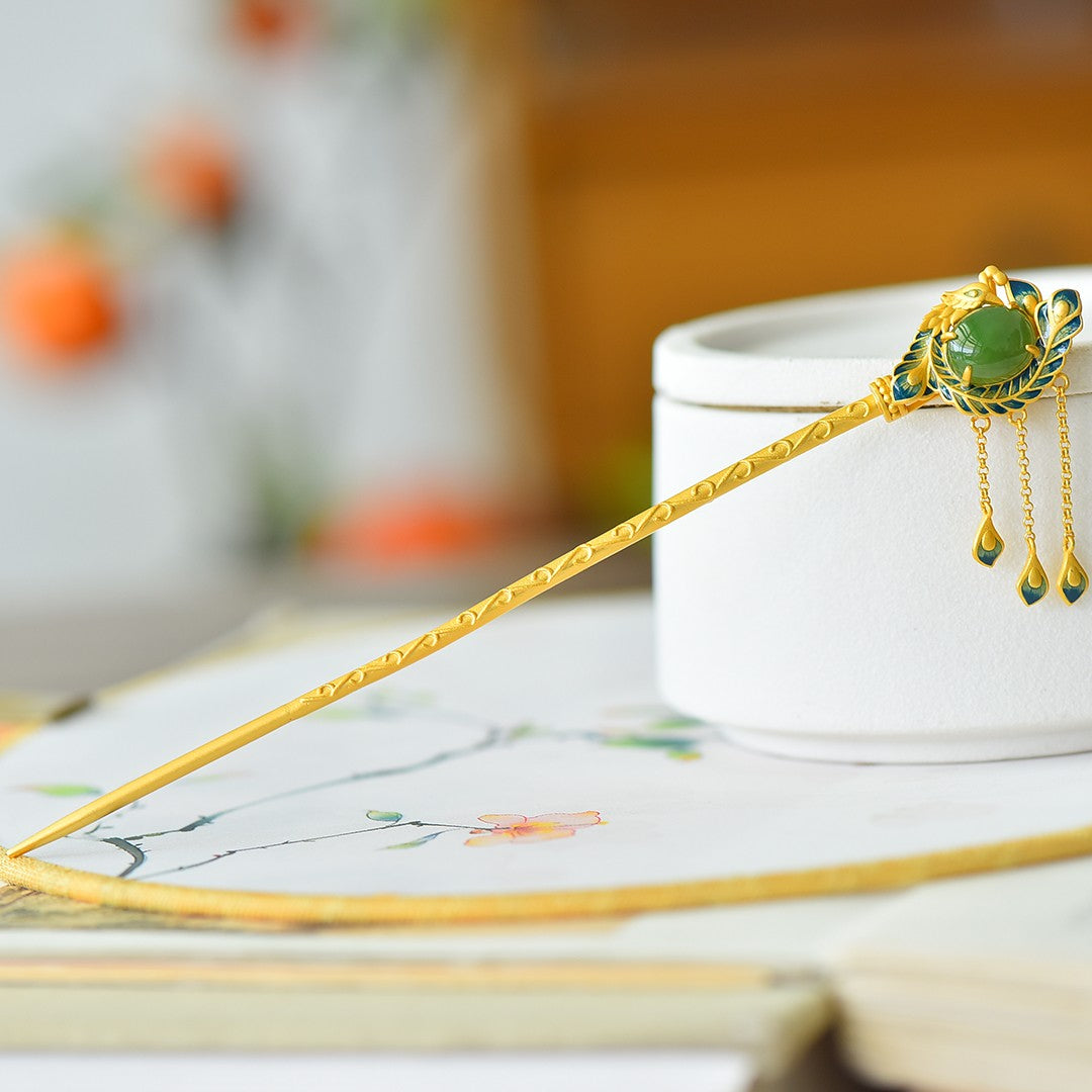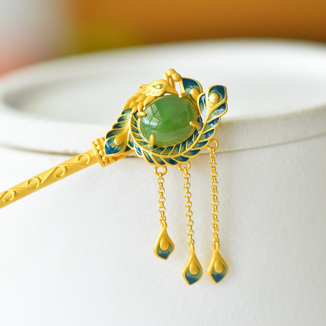 Silver gilt inlaid Hotan Jasper Phoenix Nirvana tassel hairpin