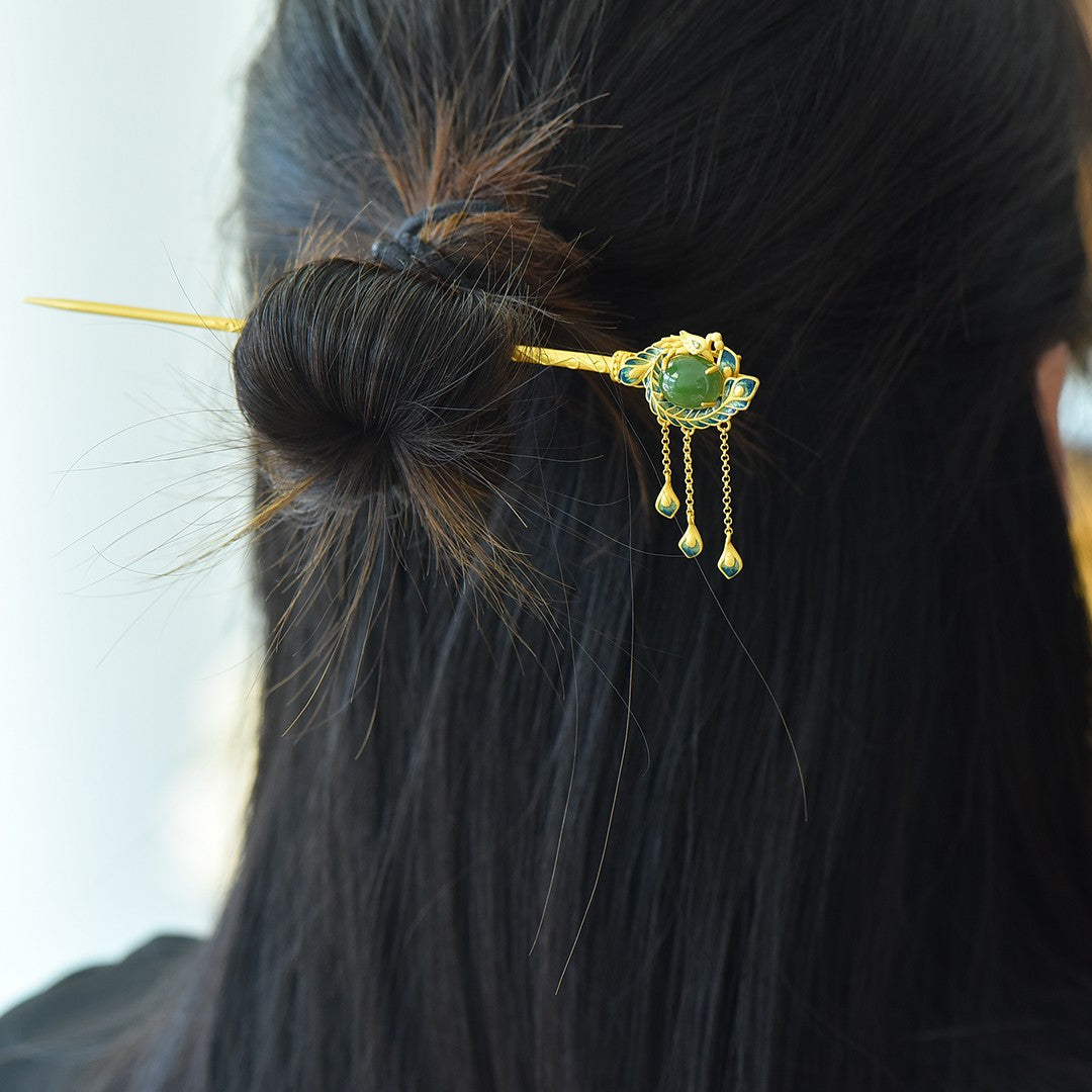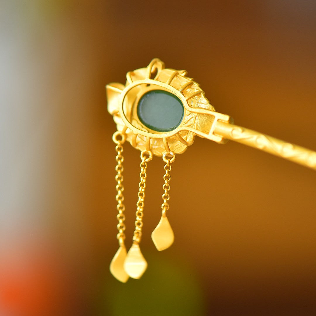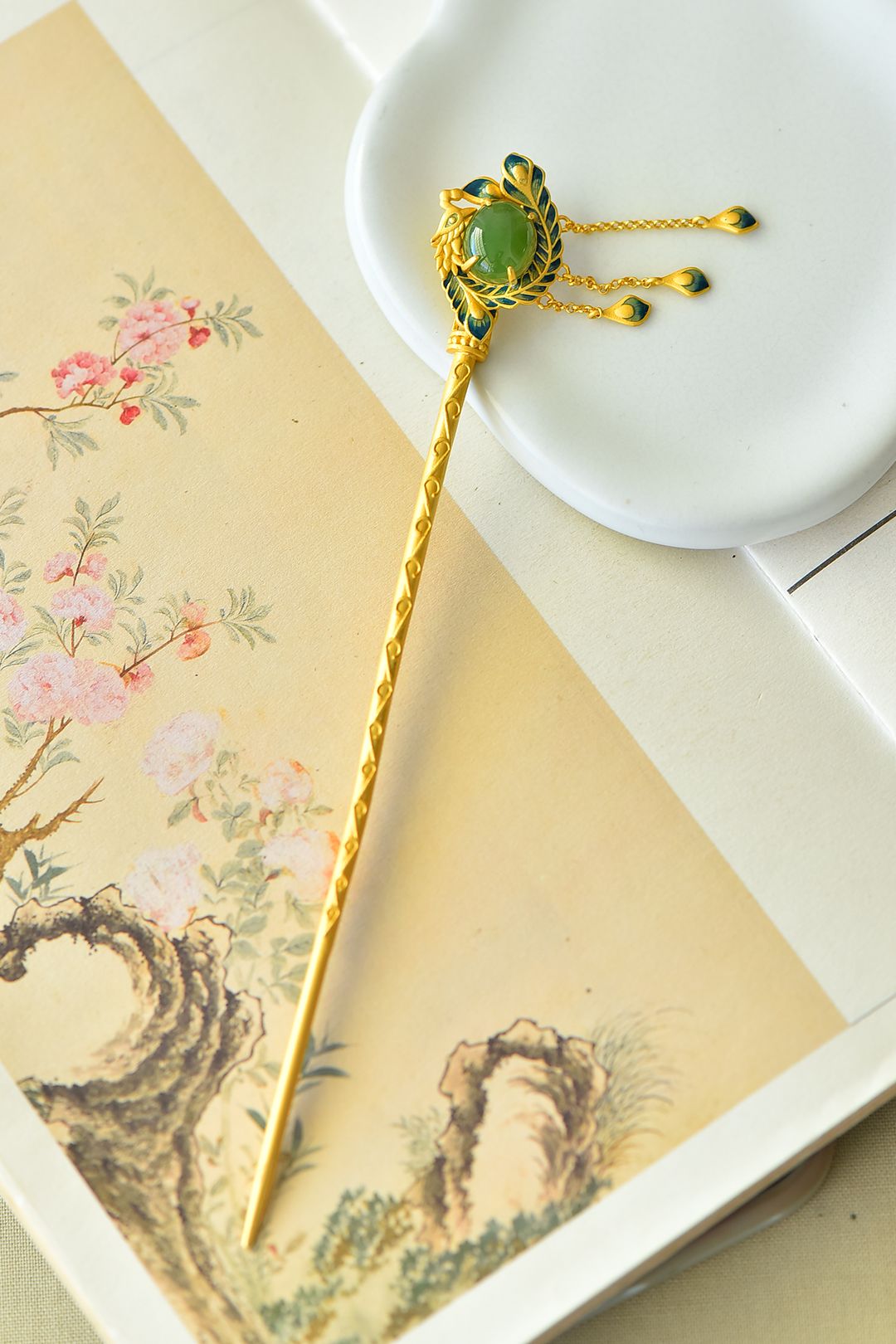 Silver gilt inlaid Hotan Jasper Phoenix Nirvana tassel hairpin