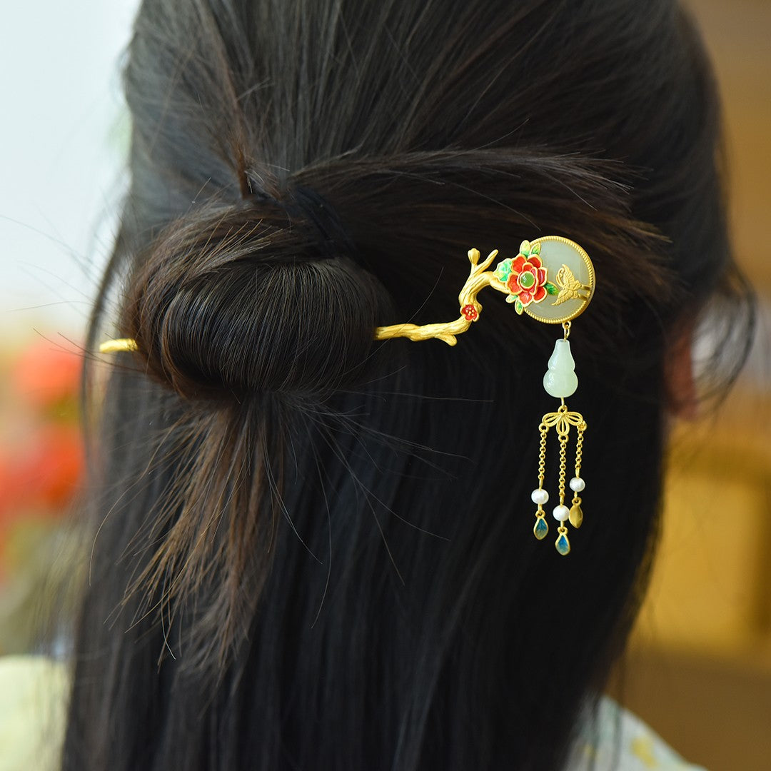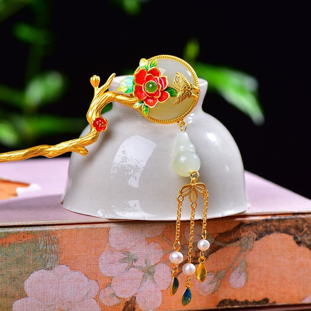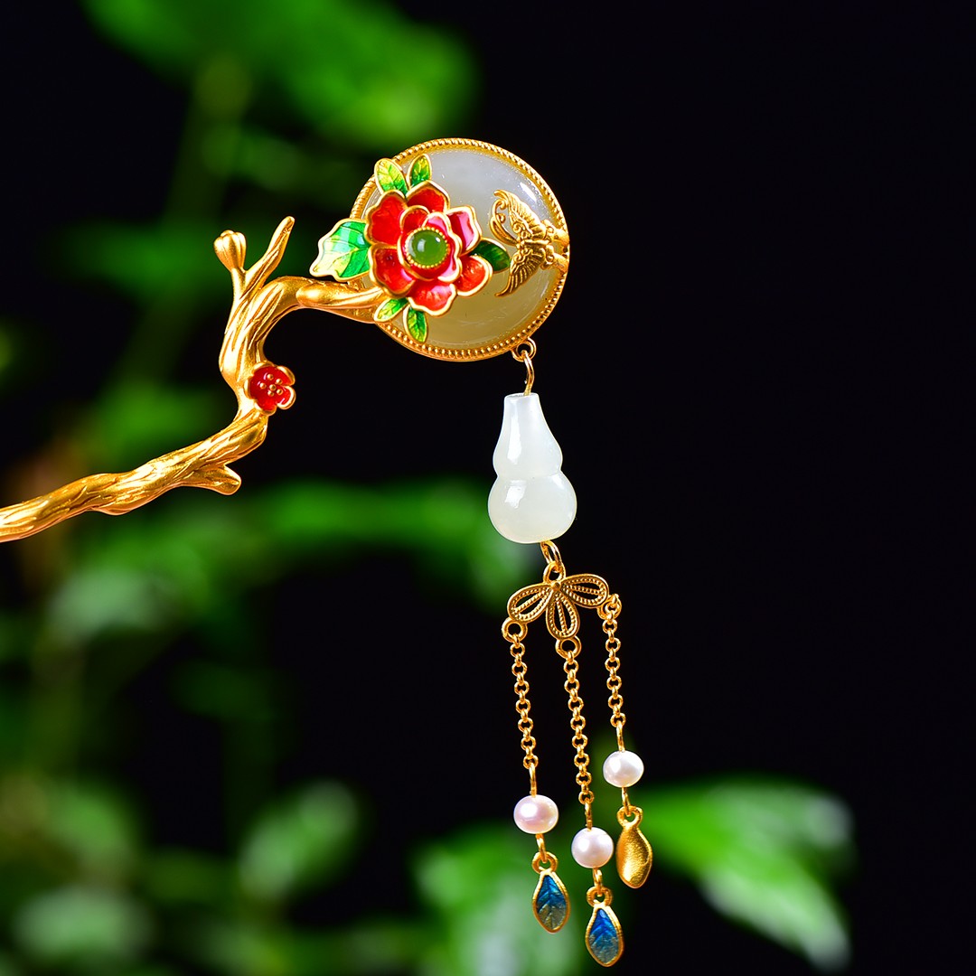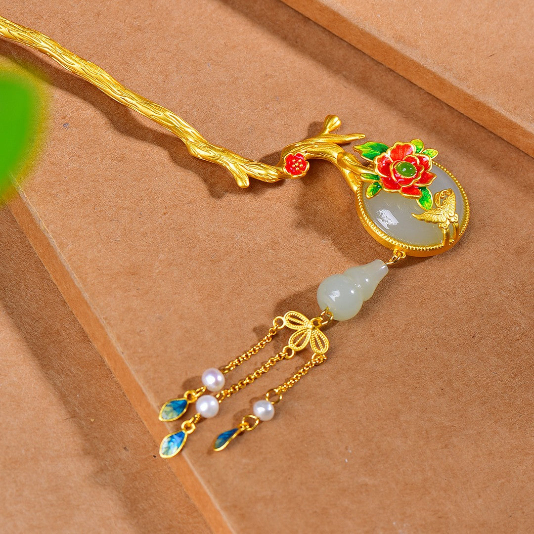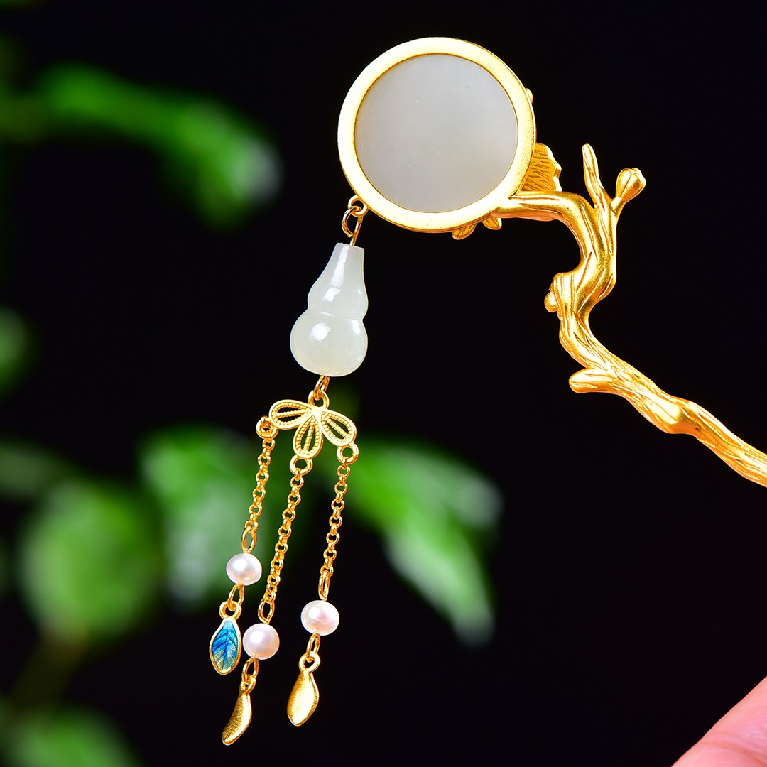 Silver-plated gold-plated Hetian white jade egg-faced flower blooming rich gourd tassel hairpin, jade size: 20mmx20mm     银镀金镶和田白玉蛋面花开富贵葫芦流苏发簪