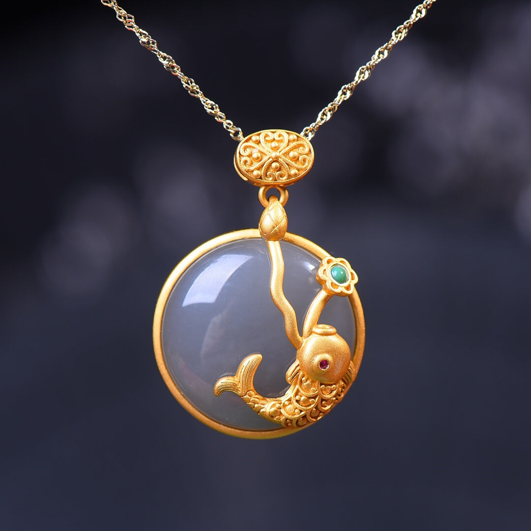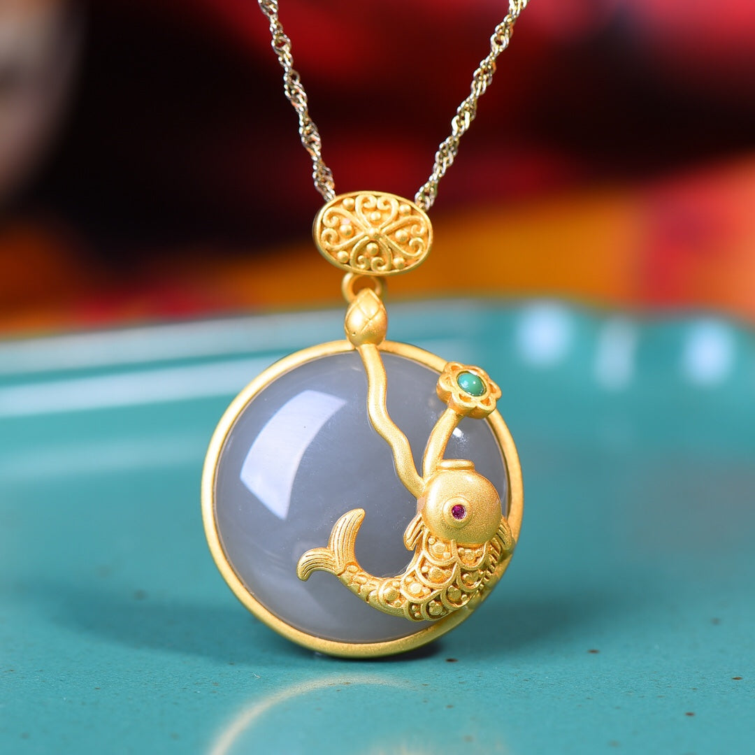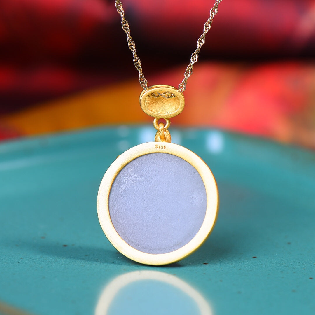 Silver gold-plated Hetian jade smoky blue egg pendant, jade size: 22mmx22mm      银镀金镶和田玉烟青色蛋面吊坠