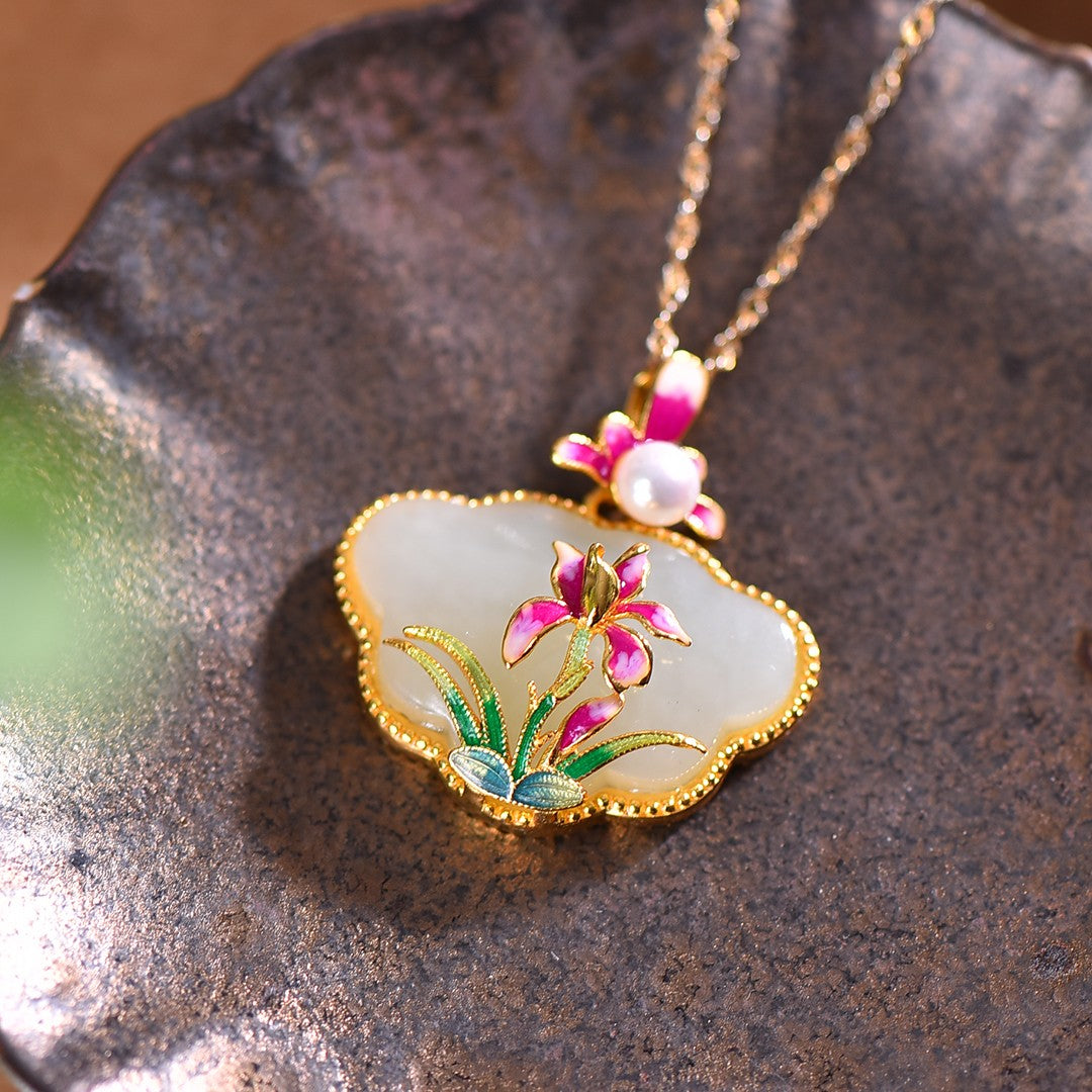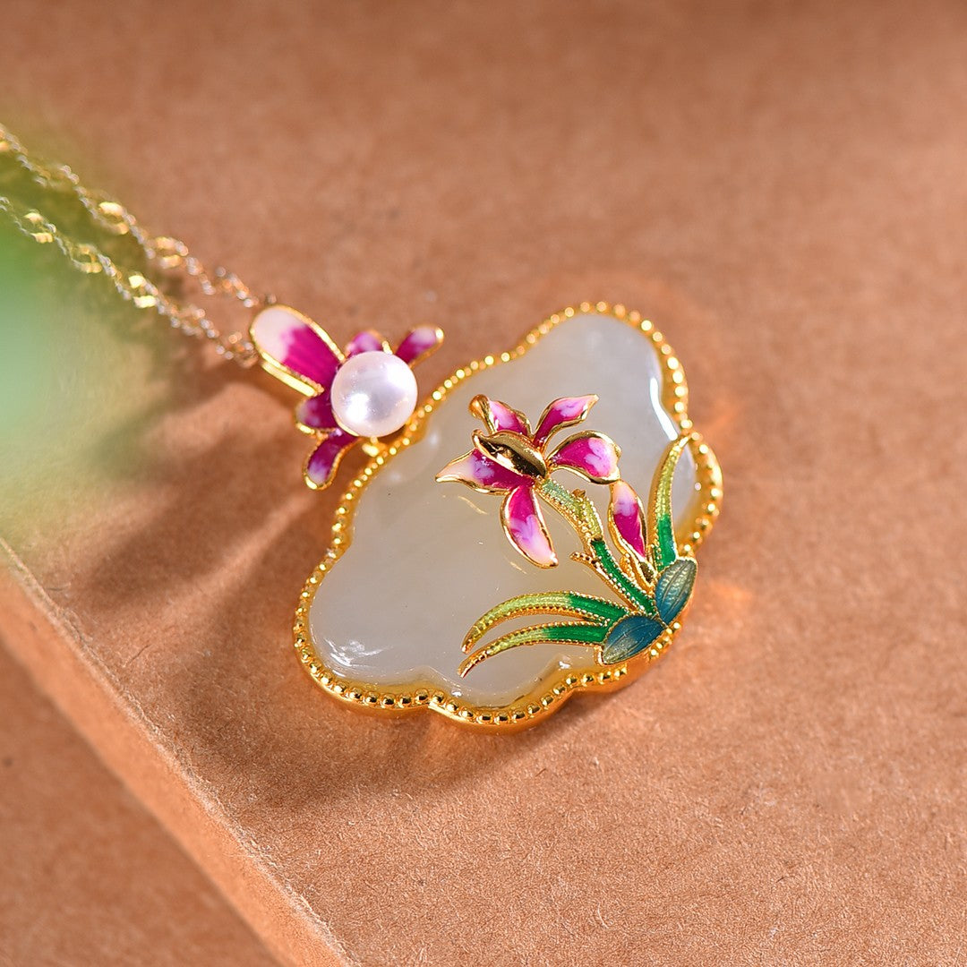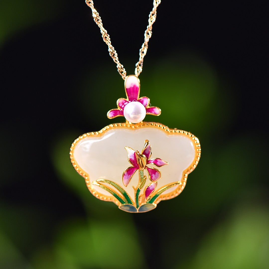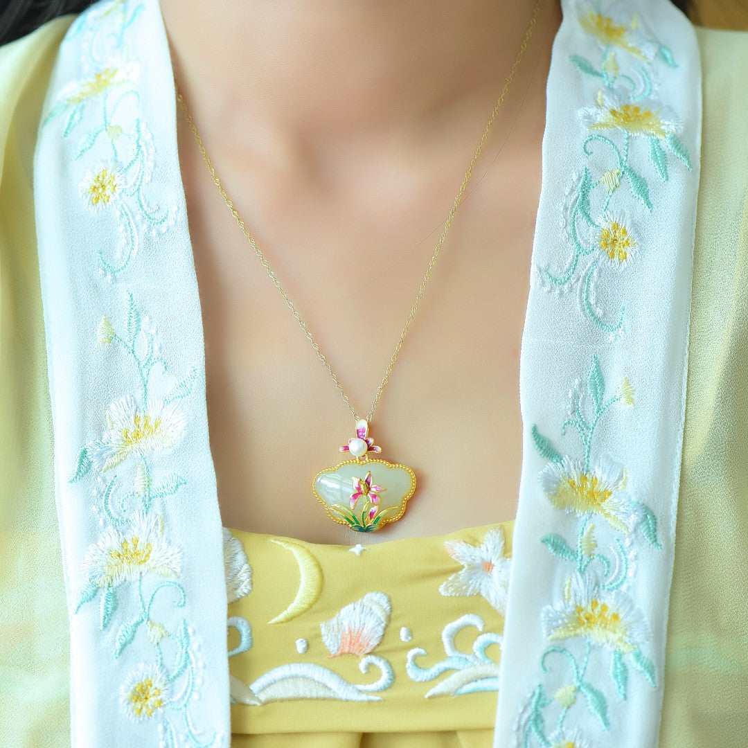 Silver gold plated Hetian jade Ruyi lock with pearl enamel pendant, jade size: 17mmx26mm    银镀金镶和田玉如意锁配珍珠珐琅吊坠