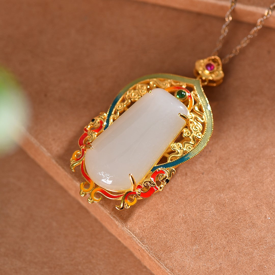Silver gold-plated Hetian jade Ping An enamel double phoenix pendant, jade size: 15mmx30mm    银镀金镶和田玉平安牌珐琅配彩双凤吊坠