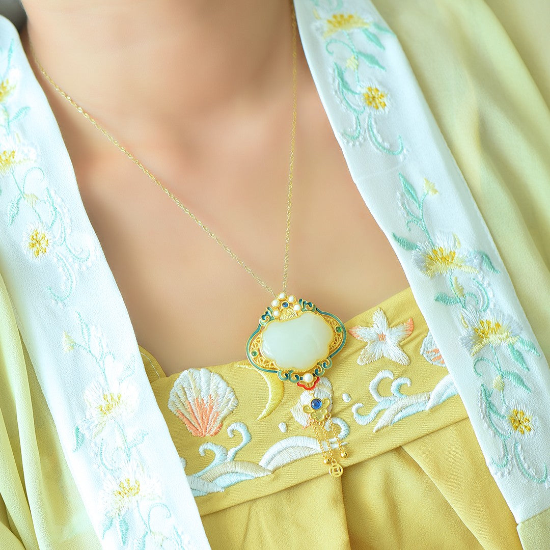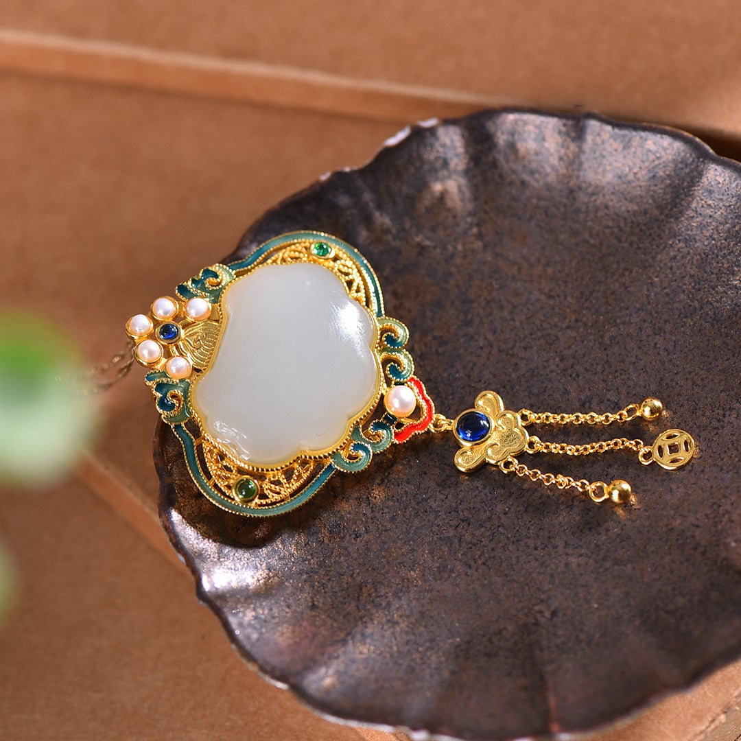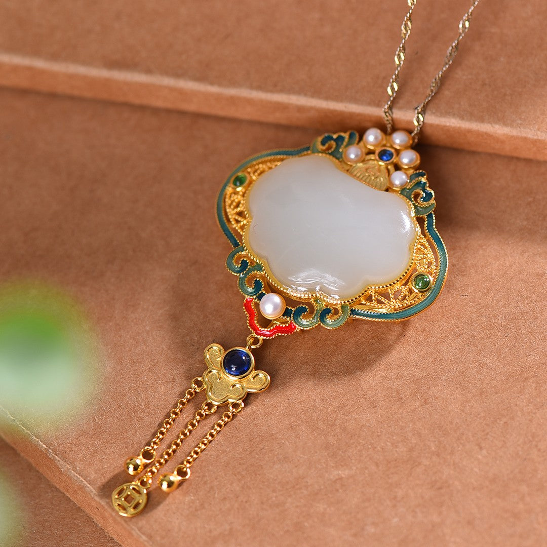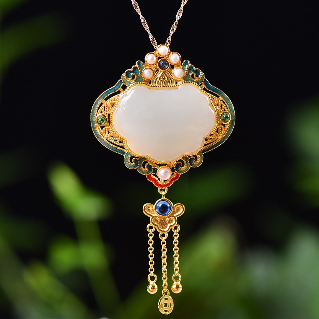 Silver gold-plated Hetian jade Ruyi lock with multi-treasure enamel tassel pendant, jade size: 22mmx27mm    银镀金镶和田玉如意锁配多宝珐琅流苏吊坠