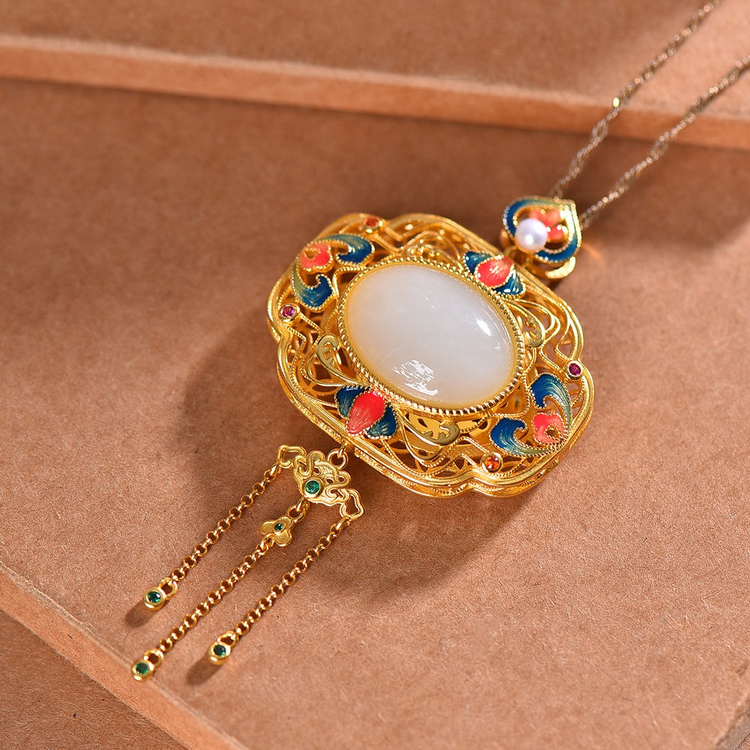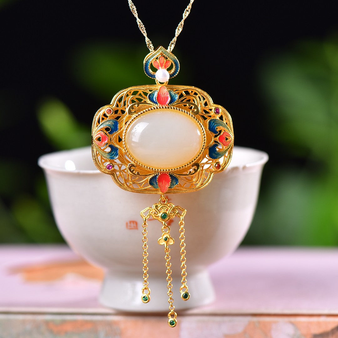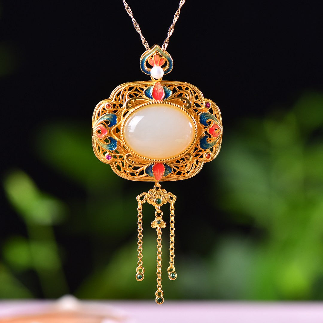 Silver-plated gold-plated Hetian jade egg-faced enamel with multi-treasure sachet tassel pendant., jade size: 15mmx20mm       银镀金镶和田玉蛋面珐琅配多宝香囊流苏吊坠