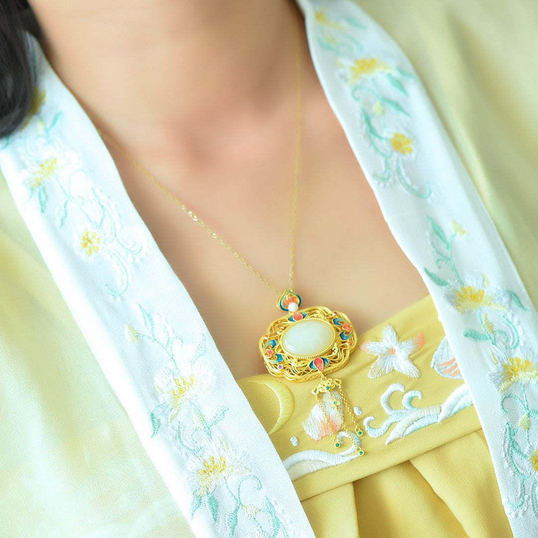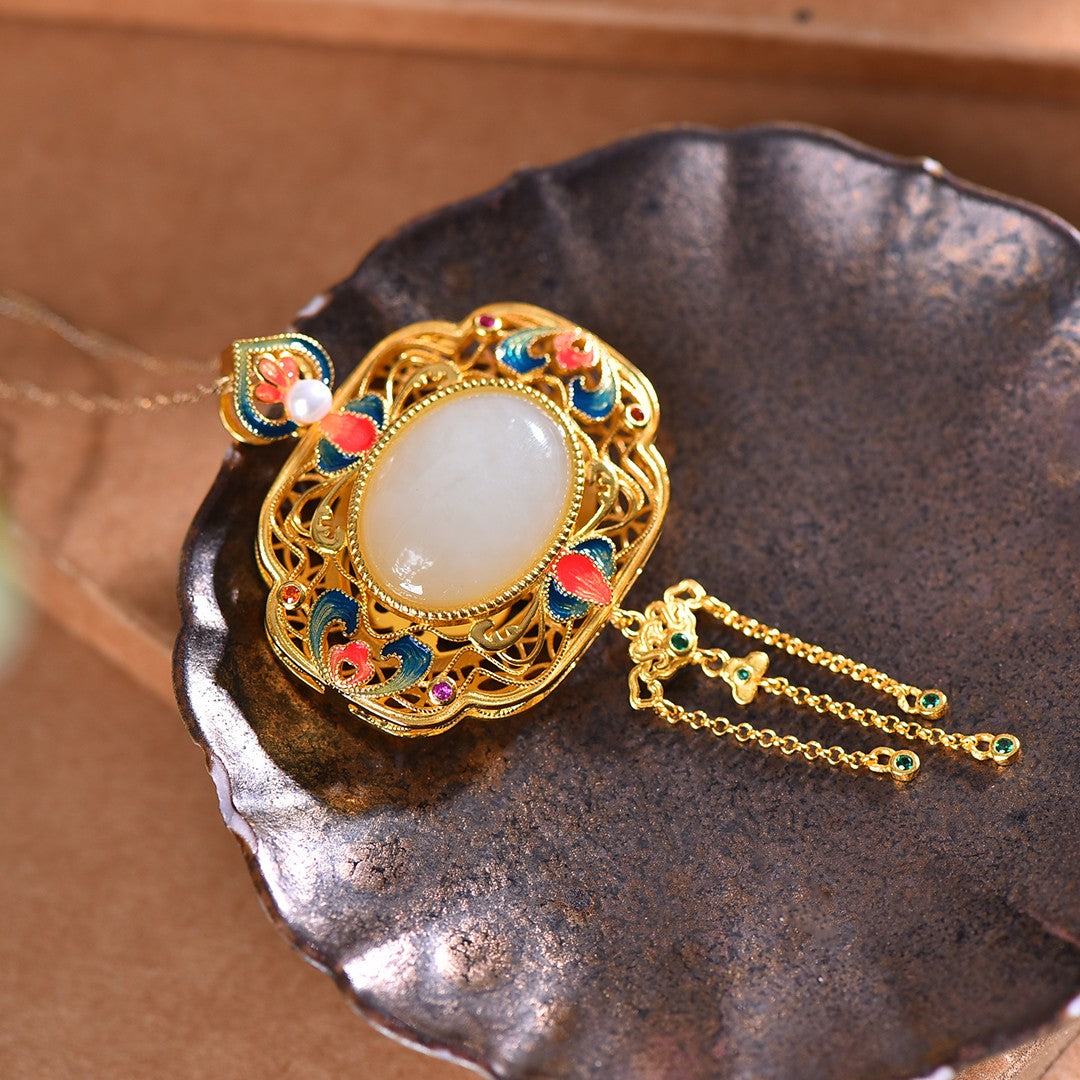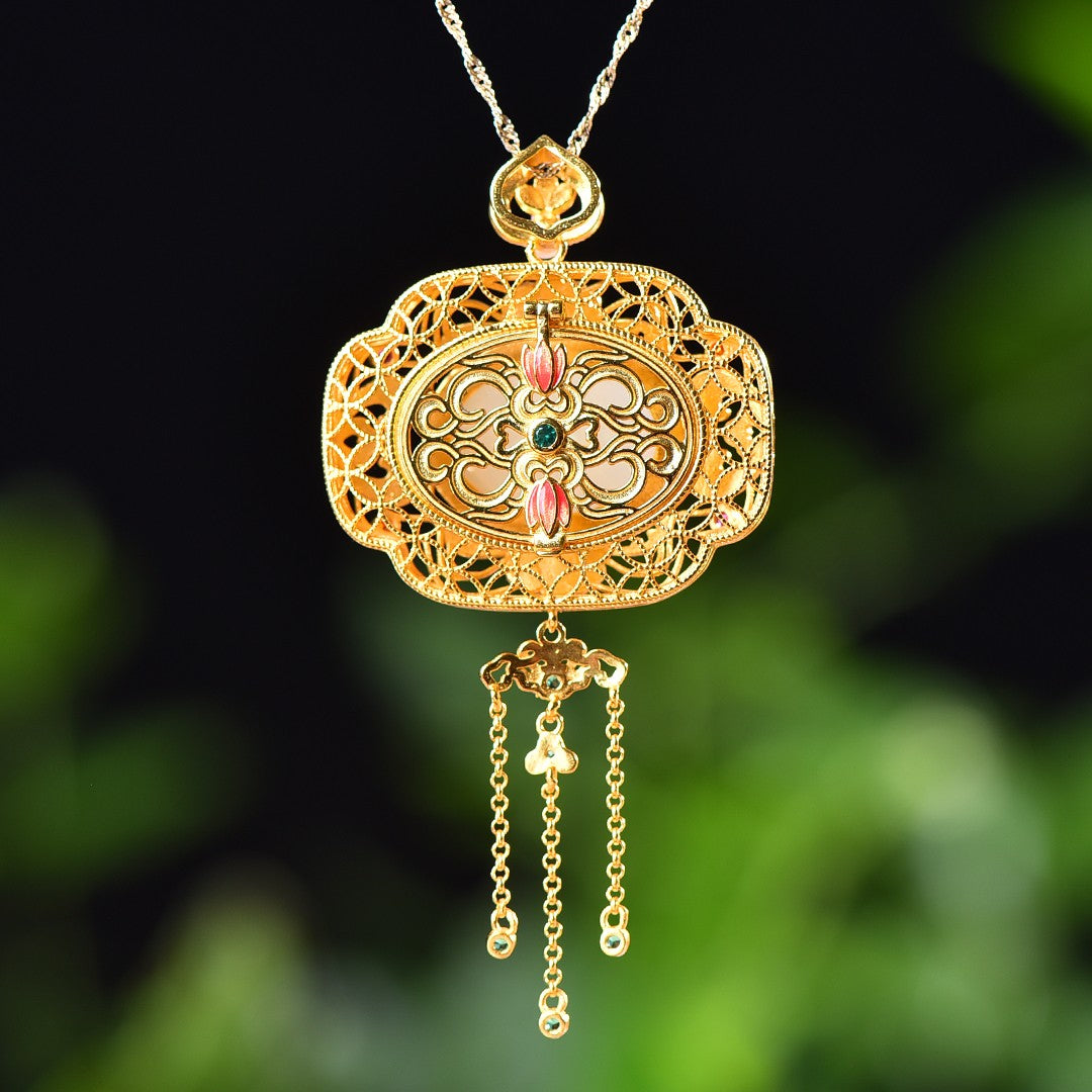 Silver-plated gold-plated Hetian jade egg-faced enamel with multi-treasure sachet tassel pendant., jade size: 15mmx20mm       银镀金镶和田玉蛋面珐琅配多宝香囊流苏吊坠