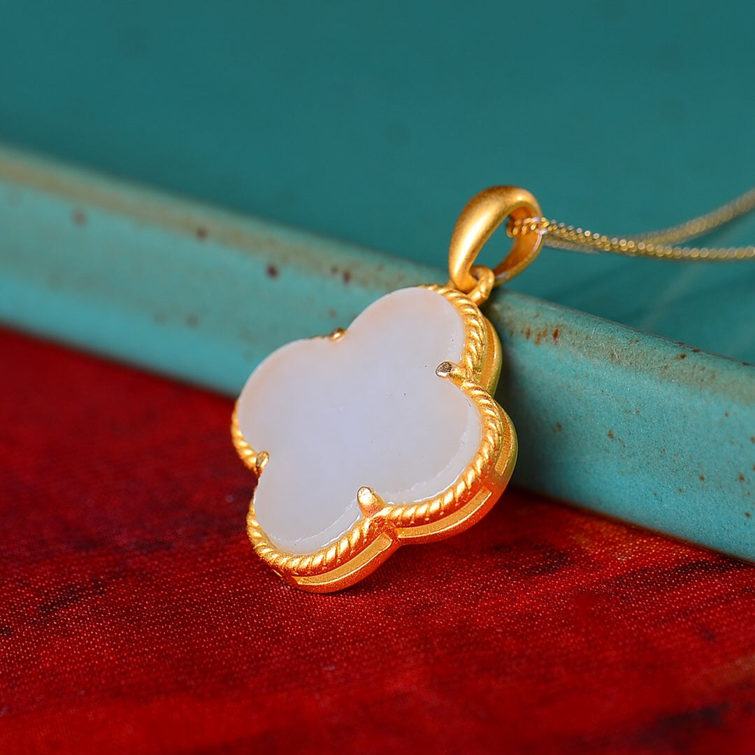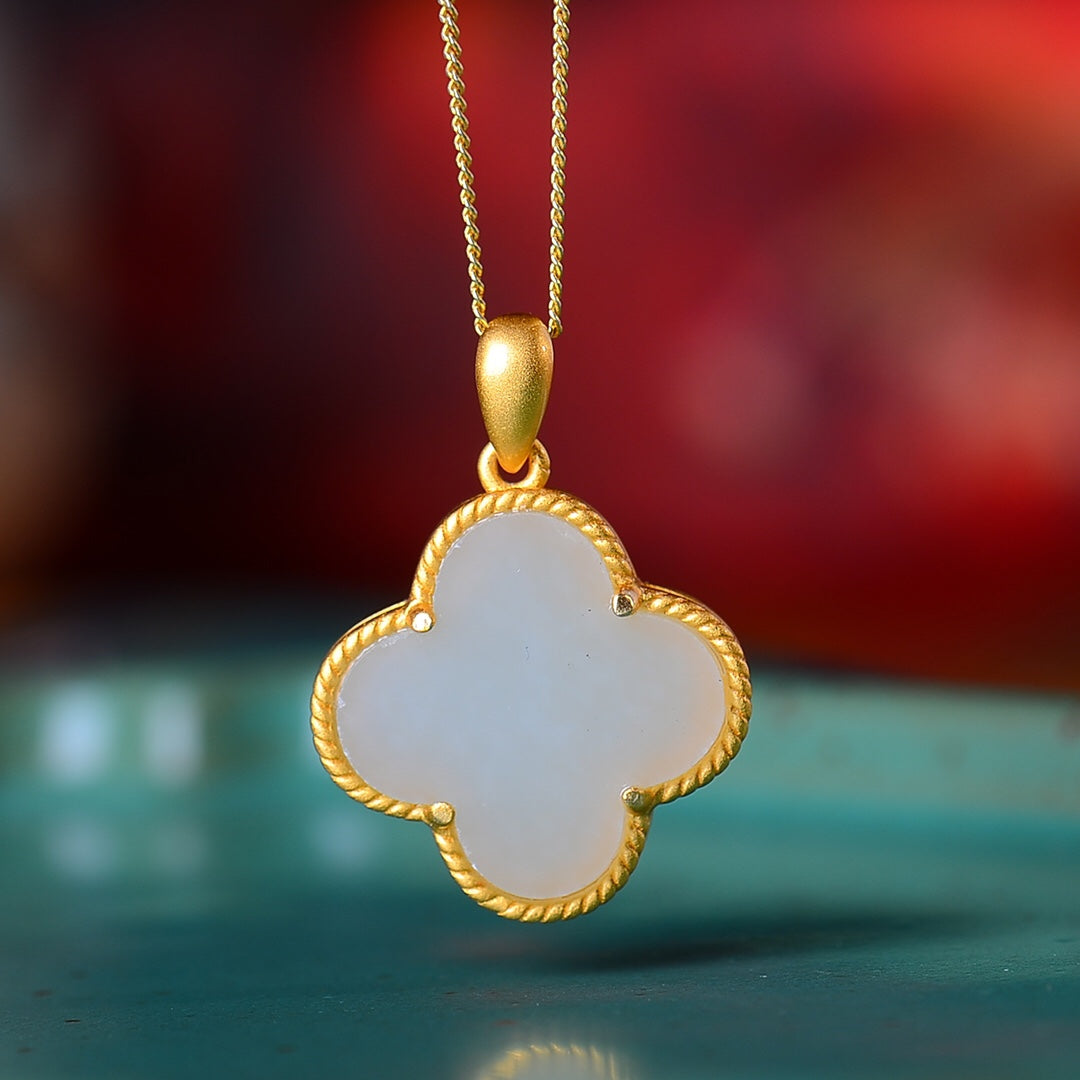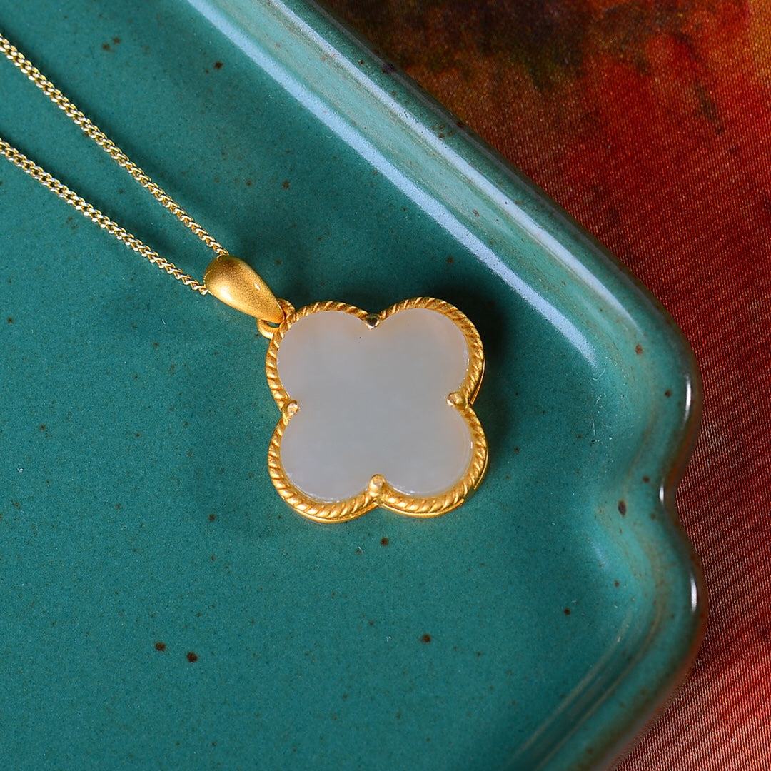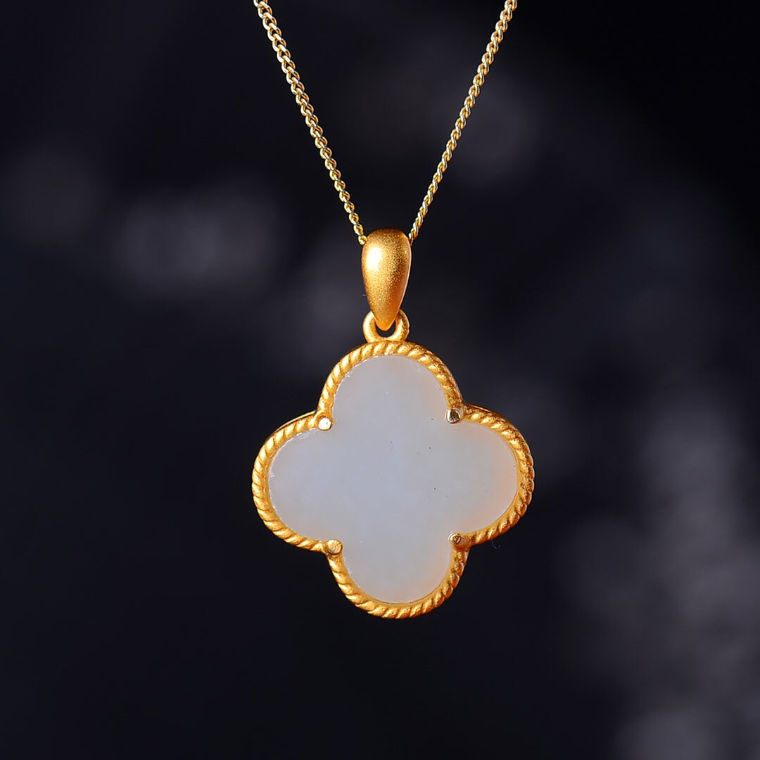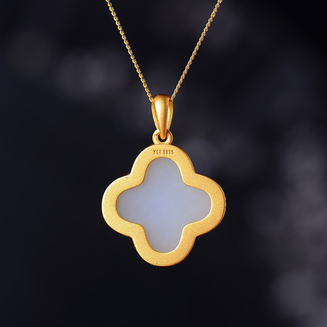 Silver gold-plated Hetian jade four-leaf clover pendant, jade size: 14mmx14mm  银镀金镶嵌和田玉四叶草吊坠