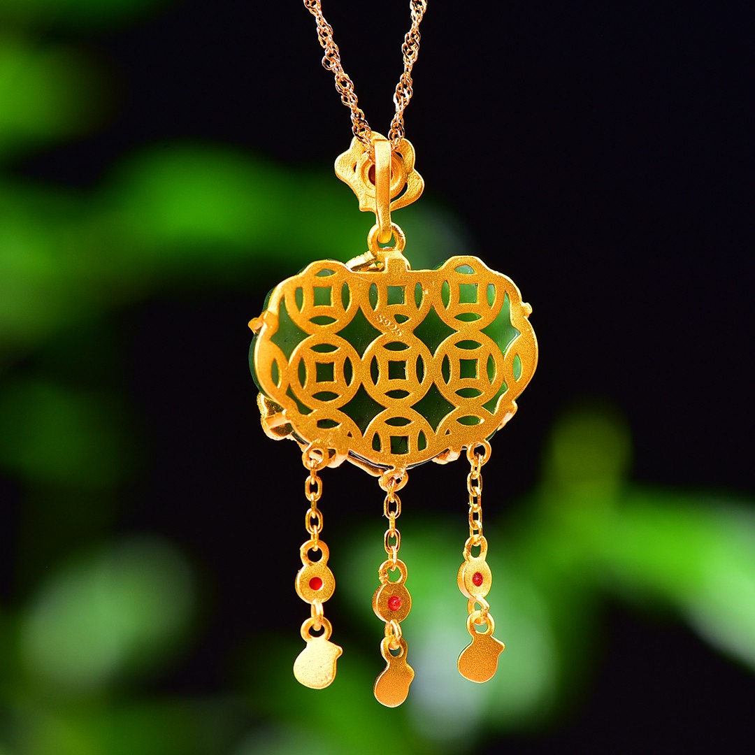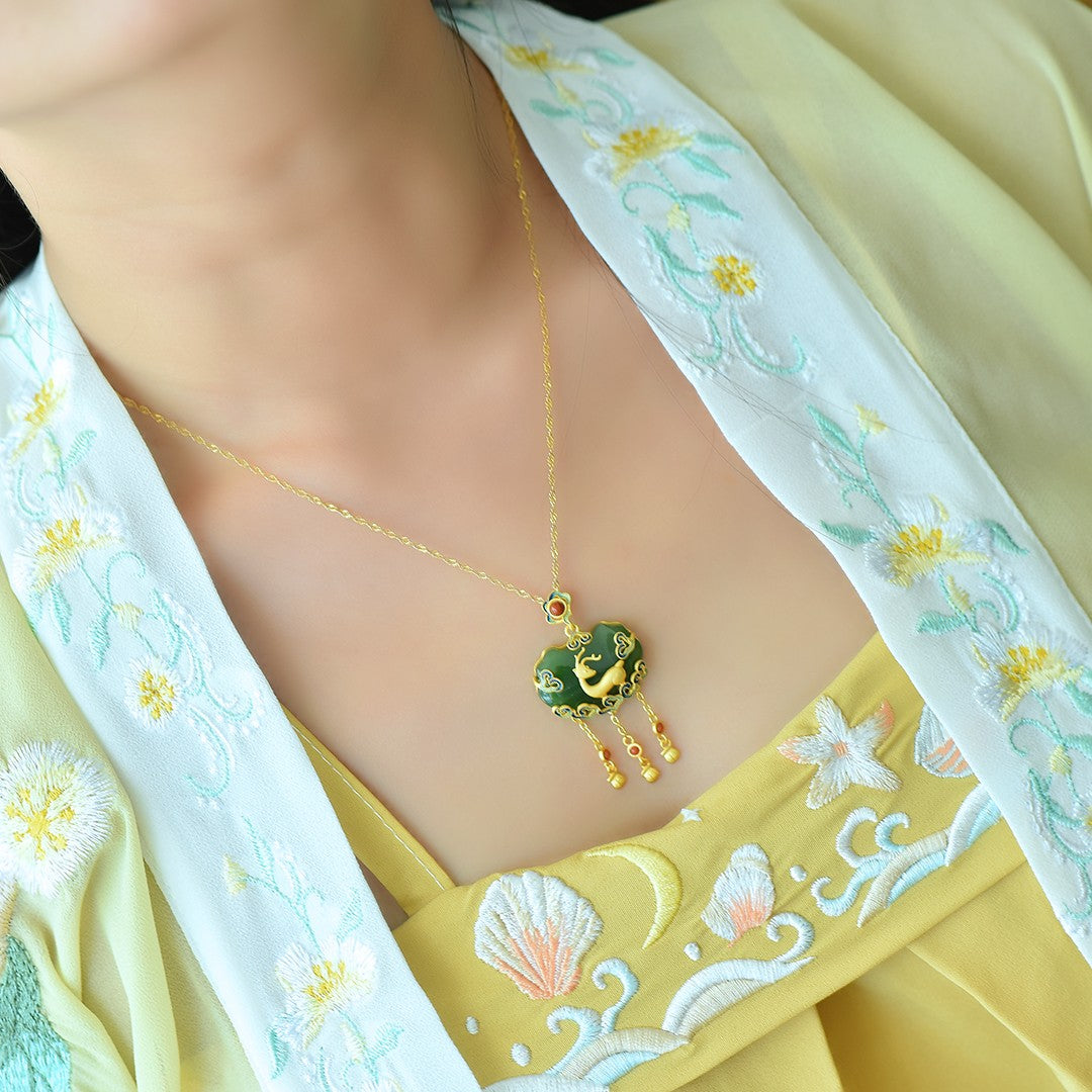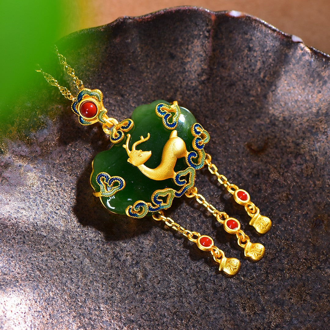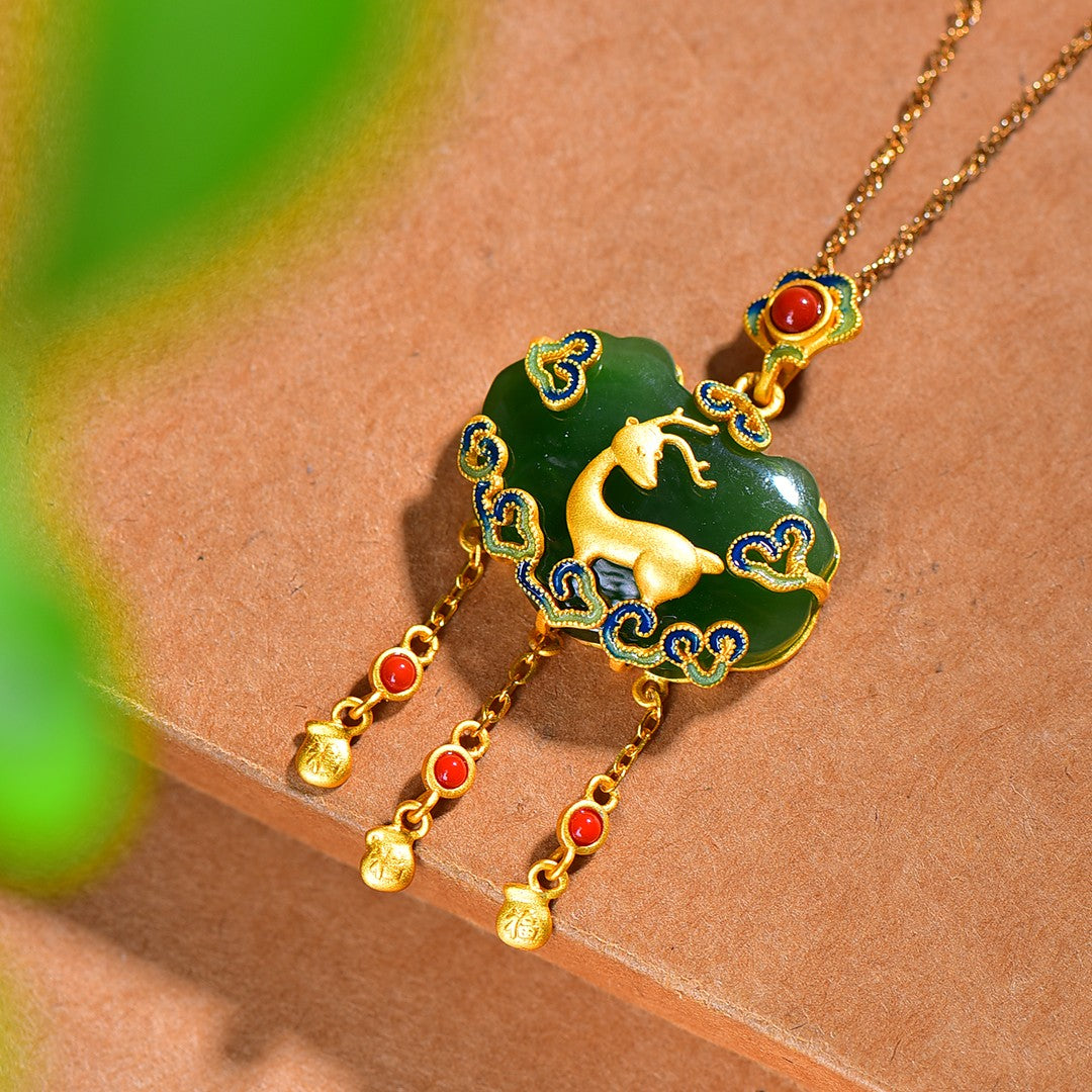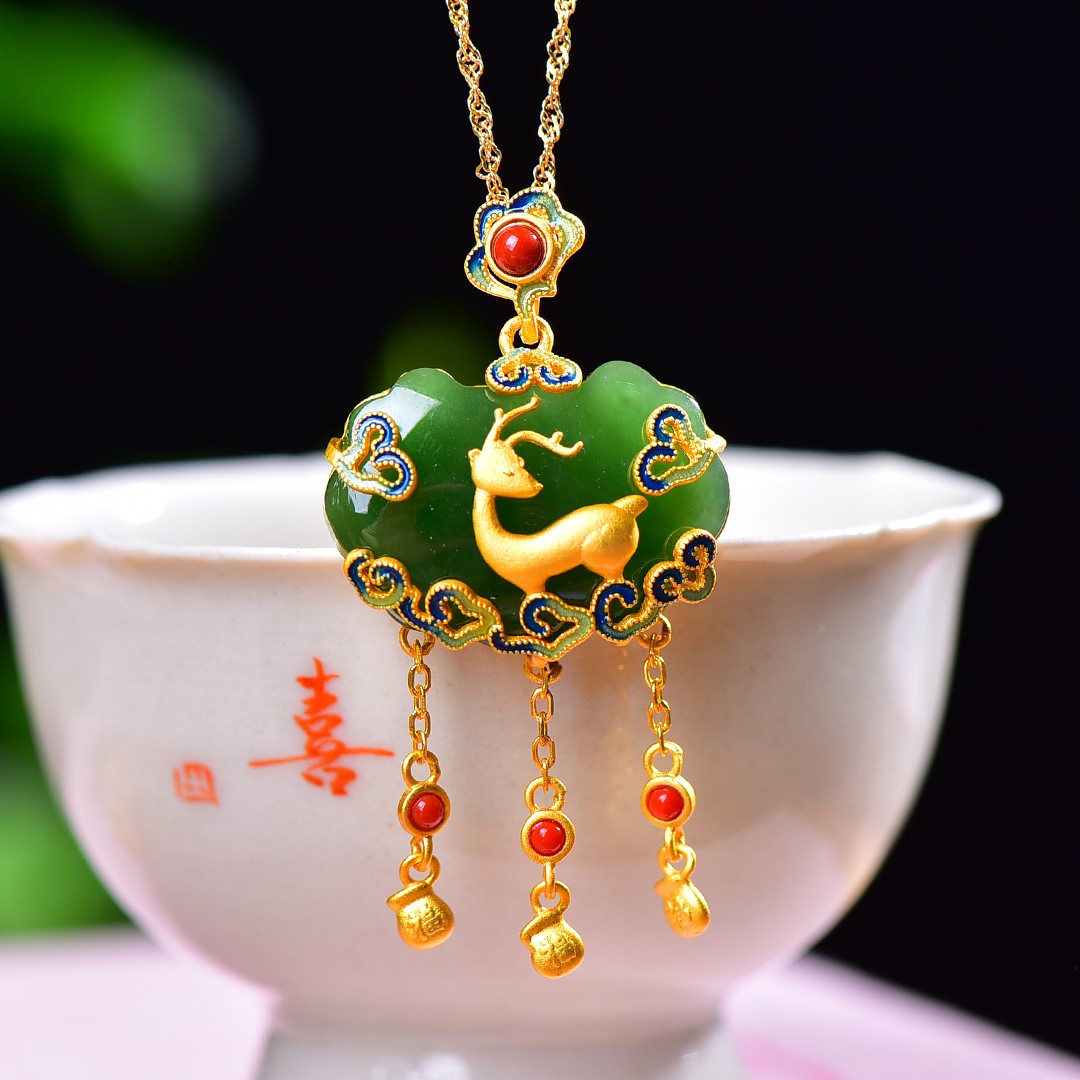Silver gold-plated Hetian Jasper One Deer You Pendant, jade size: 17mmx24mm   银镀金镶和田碧玉一鹿有你吊坠