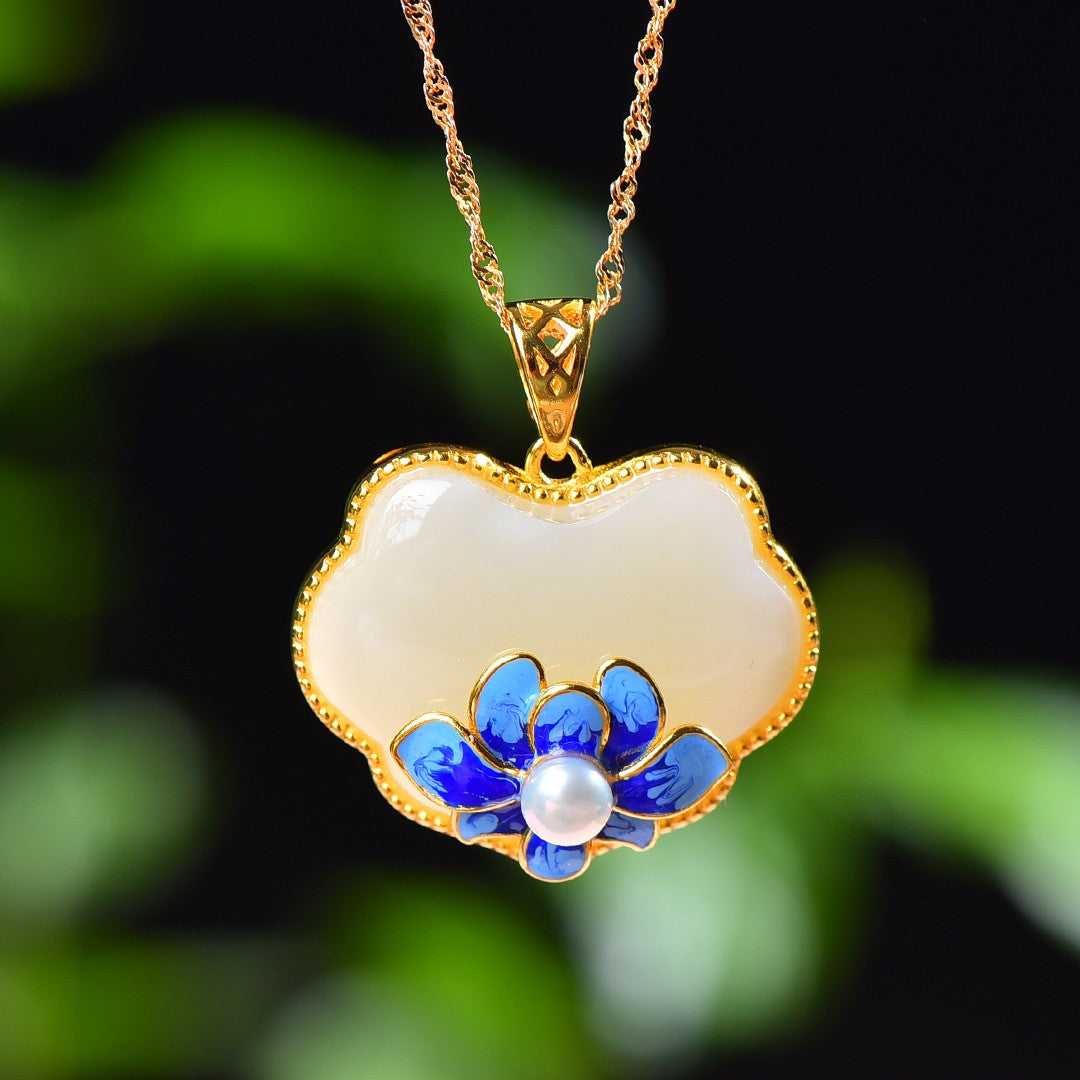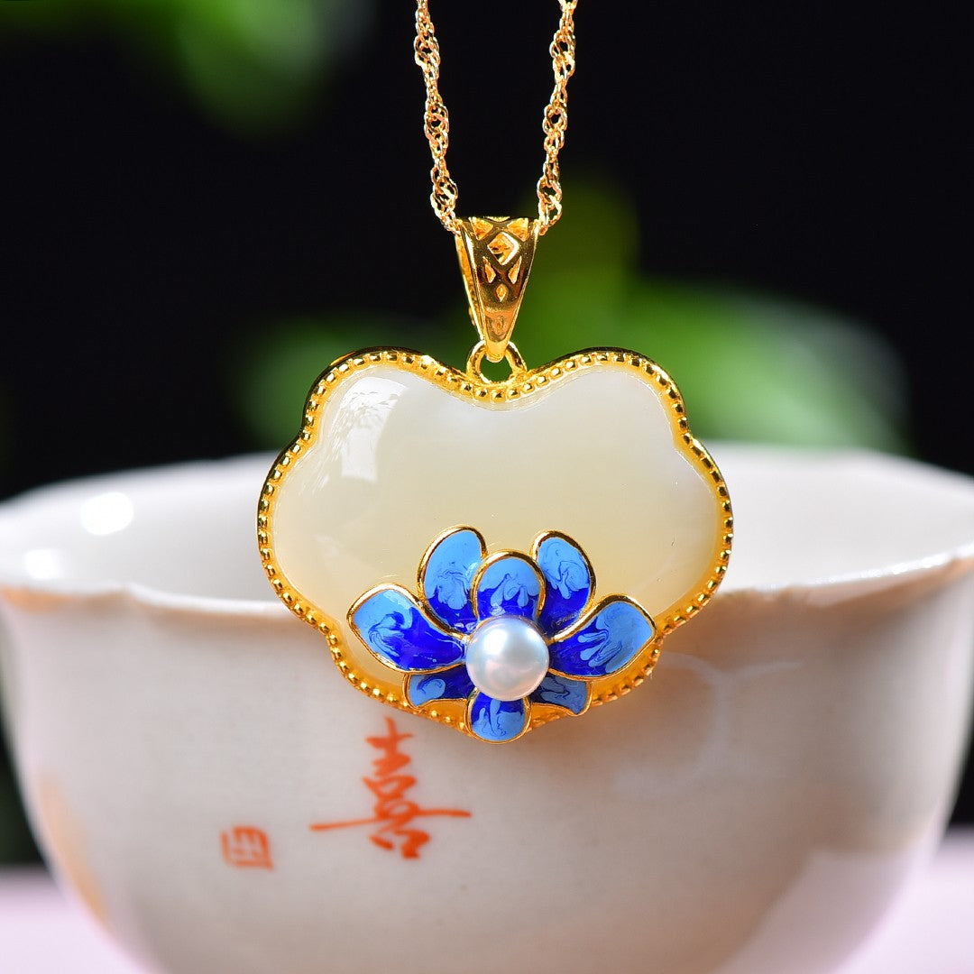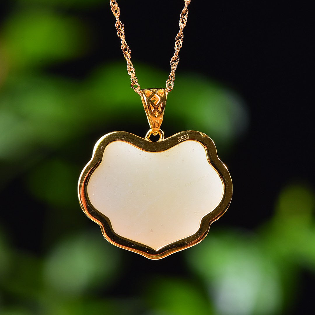 Silver gold plated Hetian white jade lotus Ruyi lock pendant, jade size: 20mmx25mm    银镀金镶和田白玉莲花如意锁吊坠