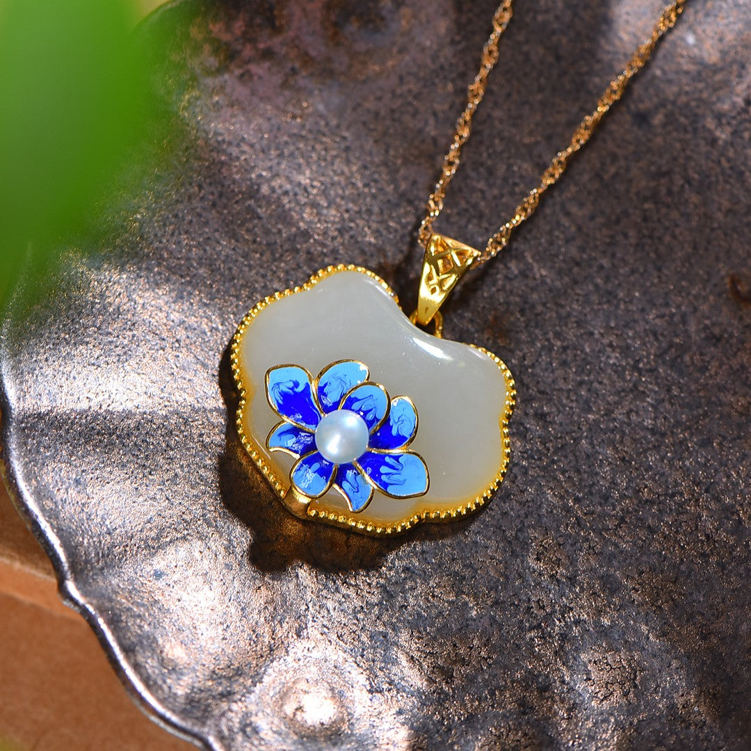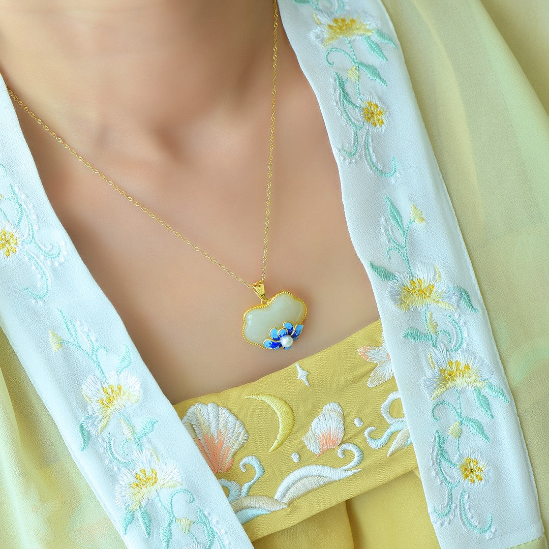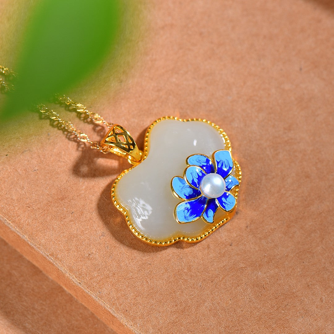 Silver gold plated Hetian white jade lotus Ruyi lock pendant, jade size: 20mmx25mm    银镀金镶和田白玉莲花如意锁吊坠