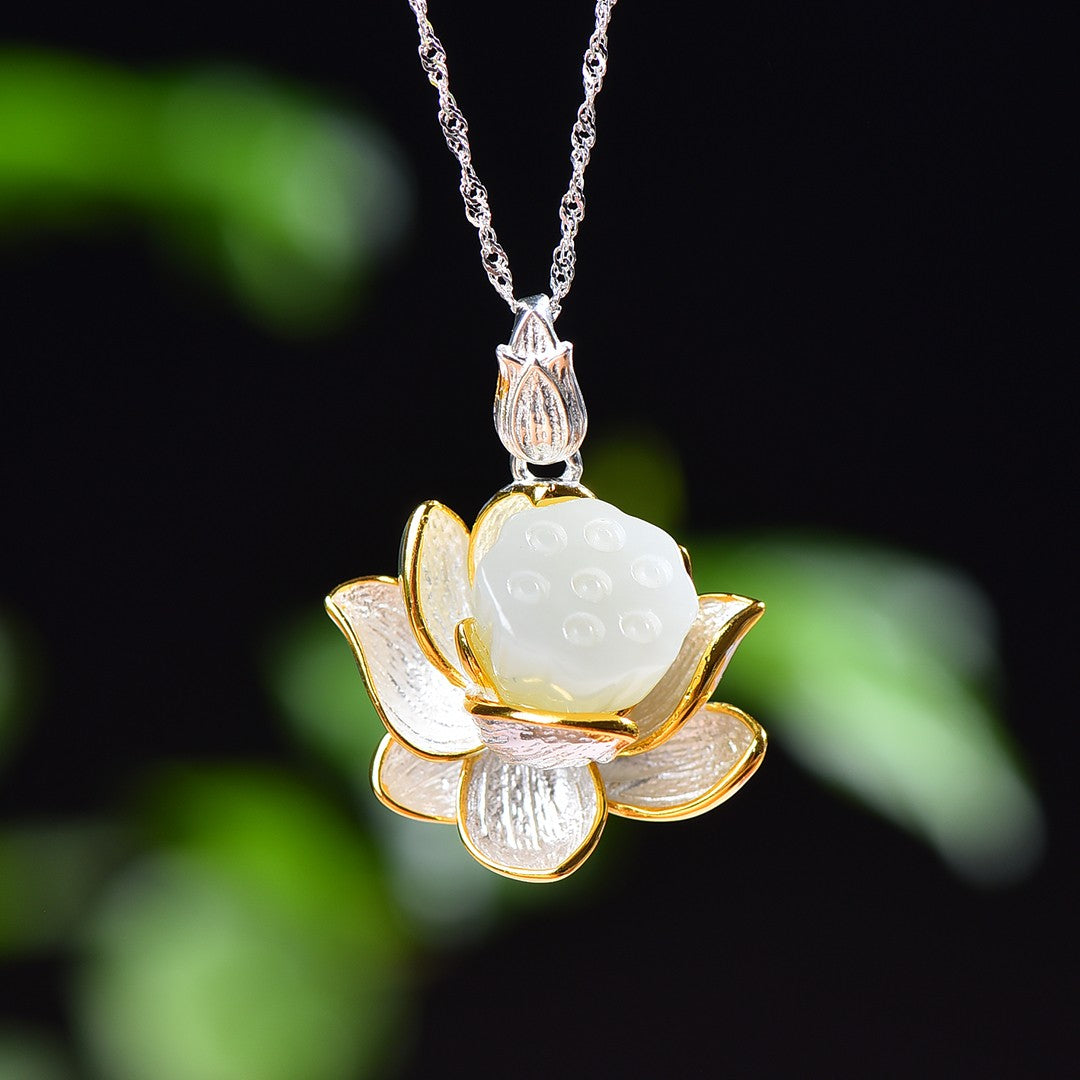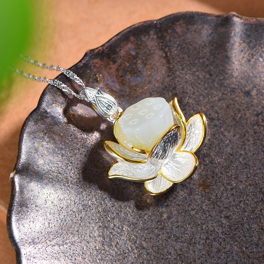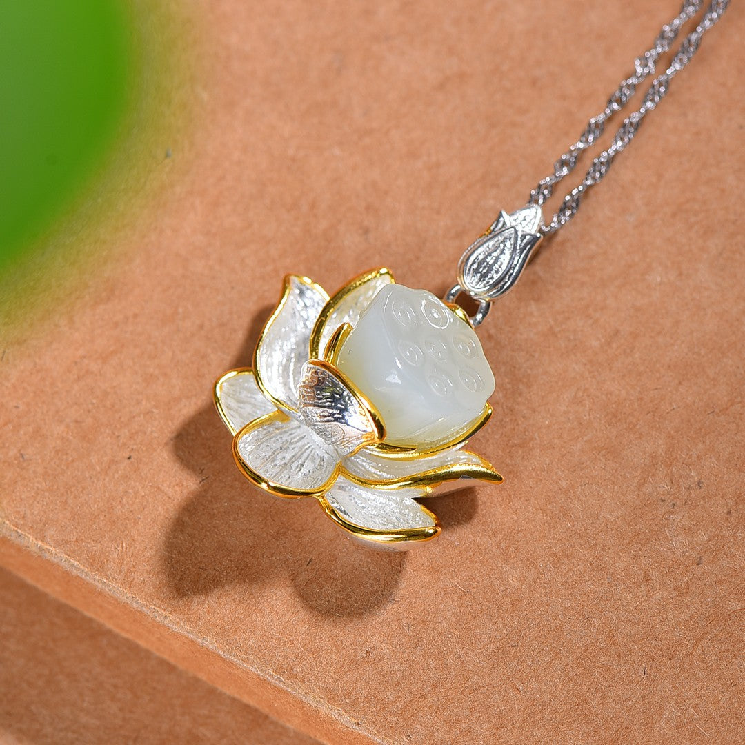 Silver gold-plated Hetian white jade lotus pendant with many children and many blessings., jade size: 12mmx12mm   银镀金镶和田白玉莲蓬多子多福吊坠