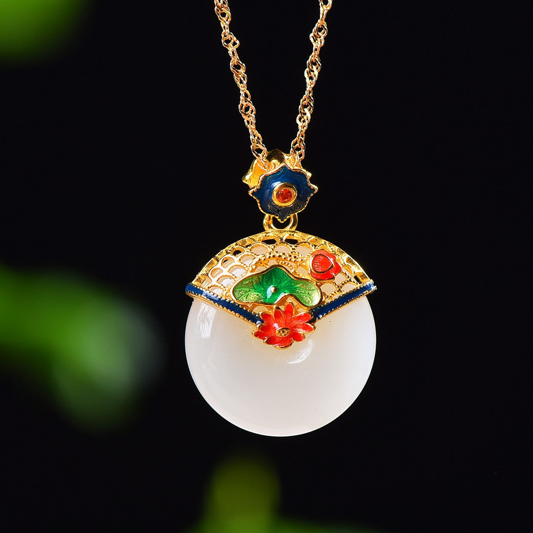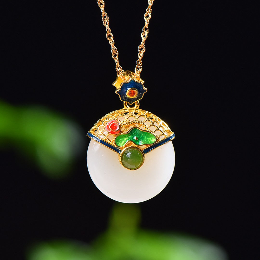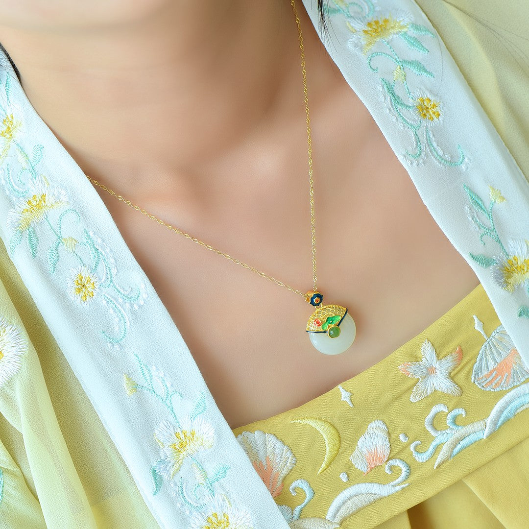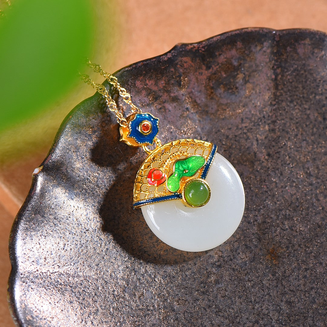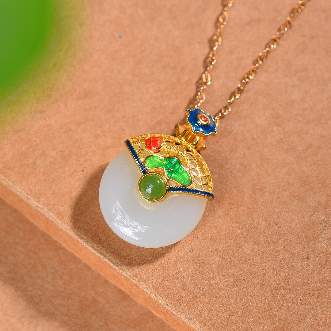 Silver gold-plated Hetian white jade safety buckle enamel pendant, jade size: 18mmx18mm   银镀金镶和田白玉平安扣珐琅吊坠
