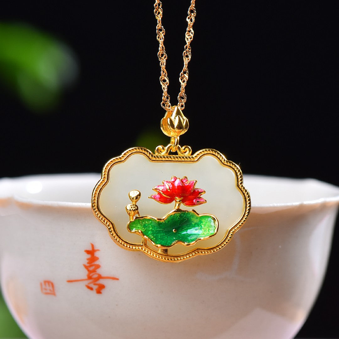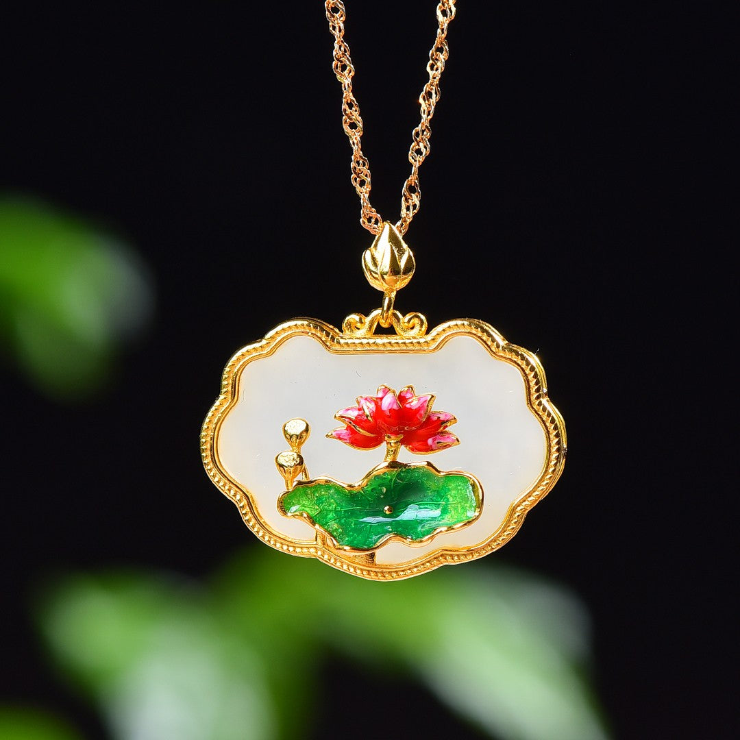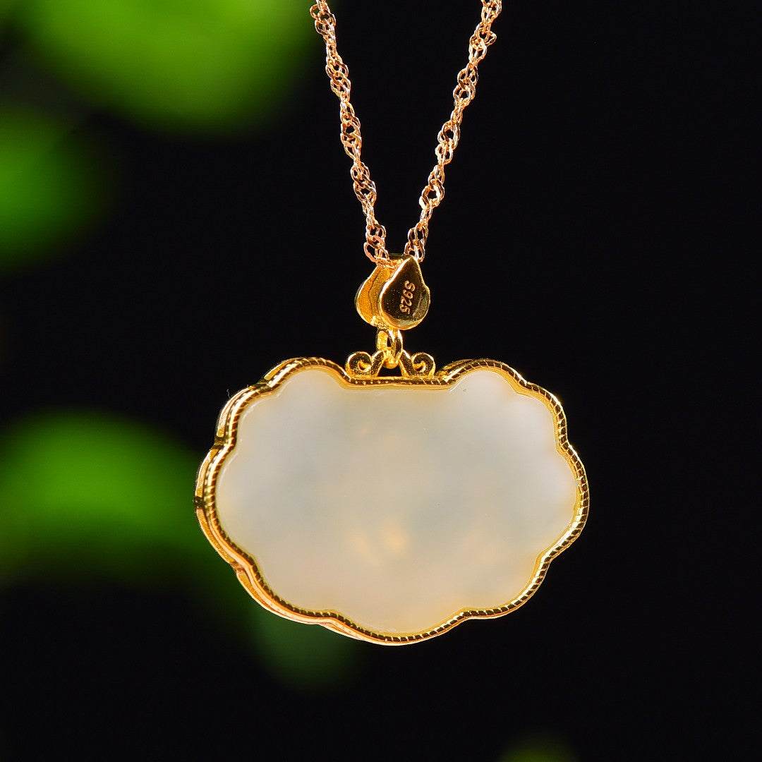 Silver gold plated Hetian white jade lotus Ruyi lock pendant, jade size: 24mmx17mm    银镀金镶和田白玉荷花如意锁吊坠