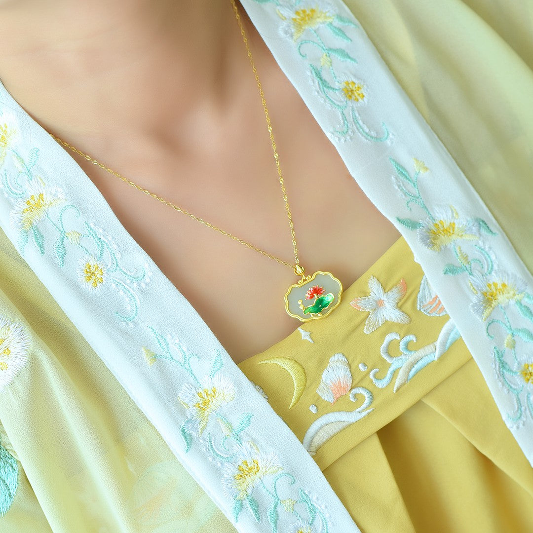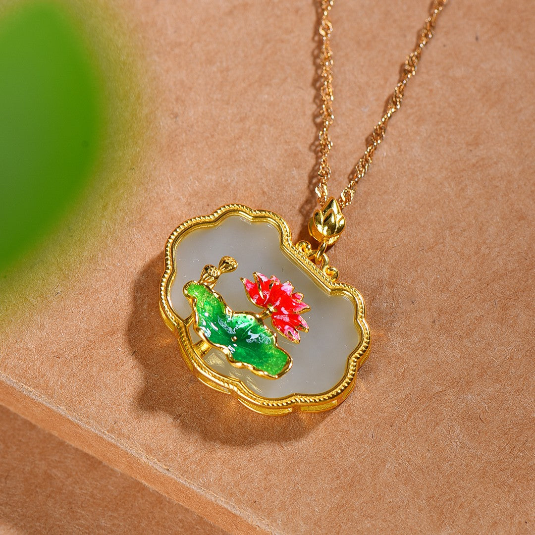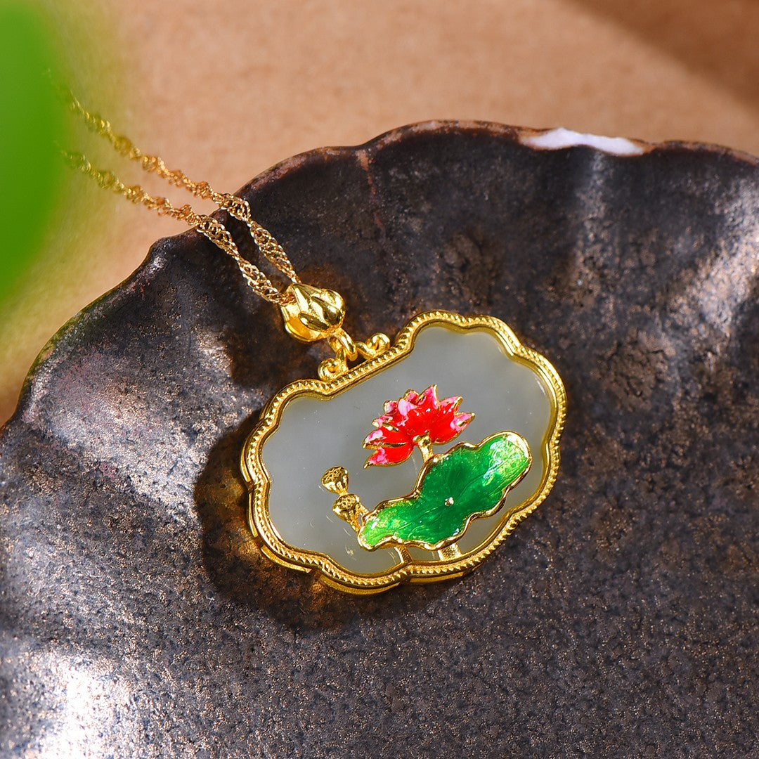 Silver gold plated Hetian white jade lotus Ruyi lock pendant, jade size: 24mmx17mm    银镀金镶和田白玉荷花如意锁吊坠