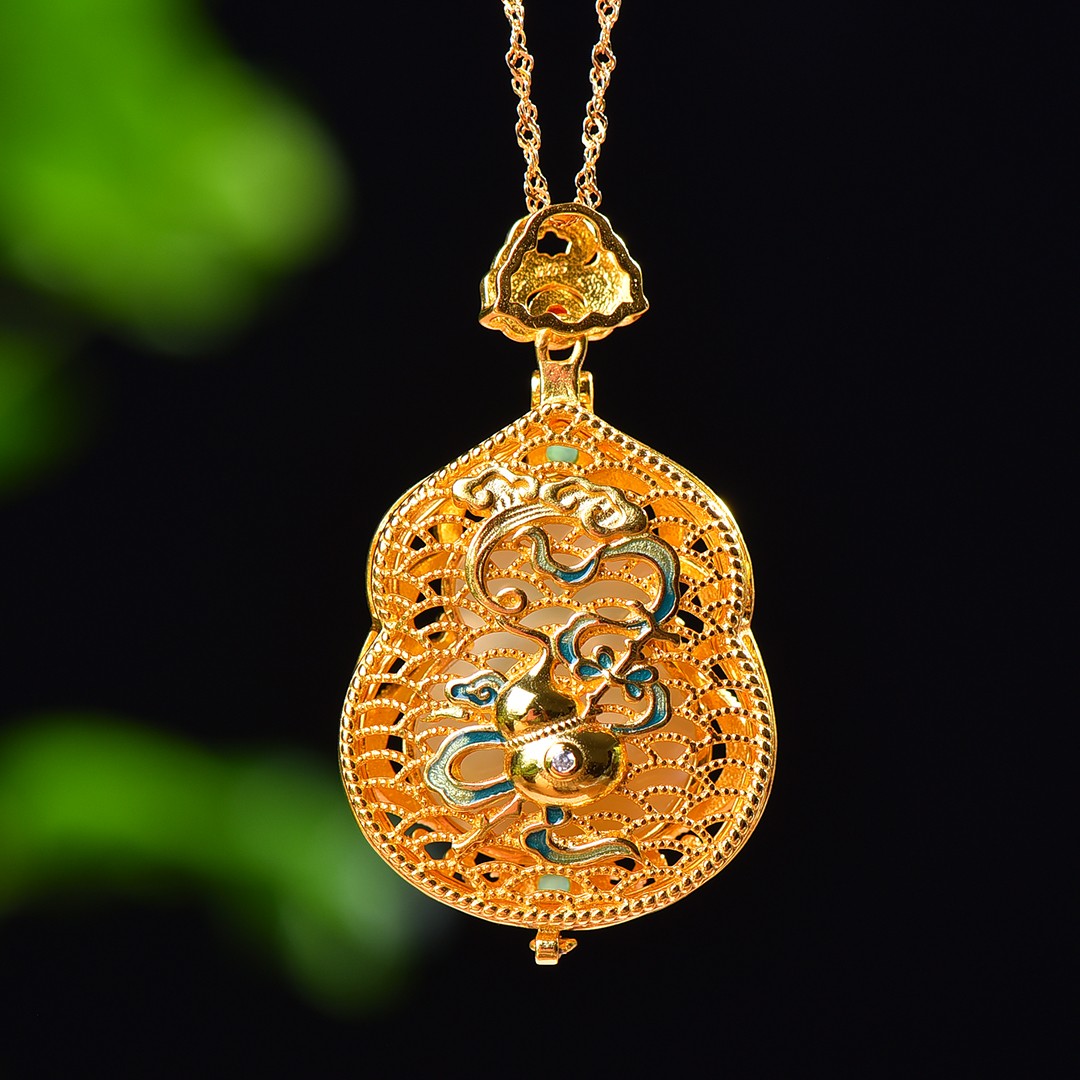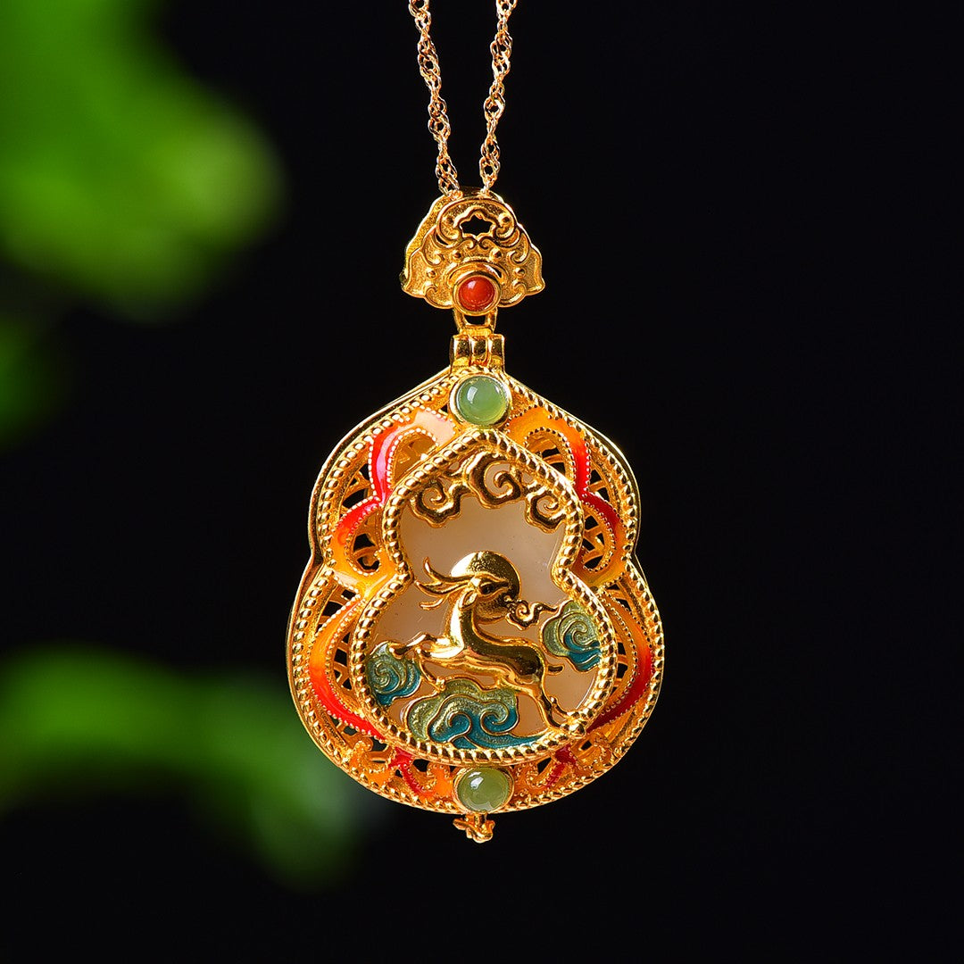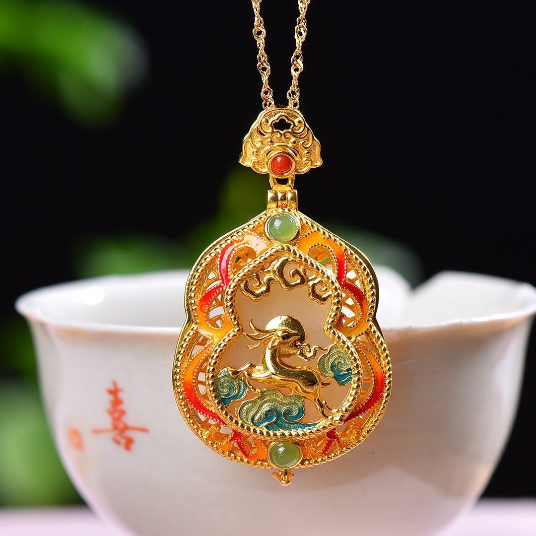 Silver gold-plated inlaid with Hetian white jade hollow enamel gourd Yi Lu You Ni sachet pendant, jade size: 16mmx20mm    银镀金镶和田白玉镂空珐琅葫芦一鹿有你香囊吊坠