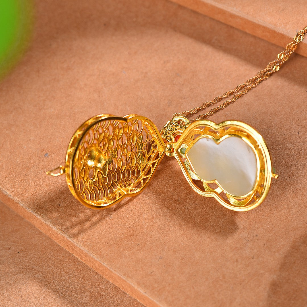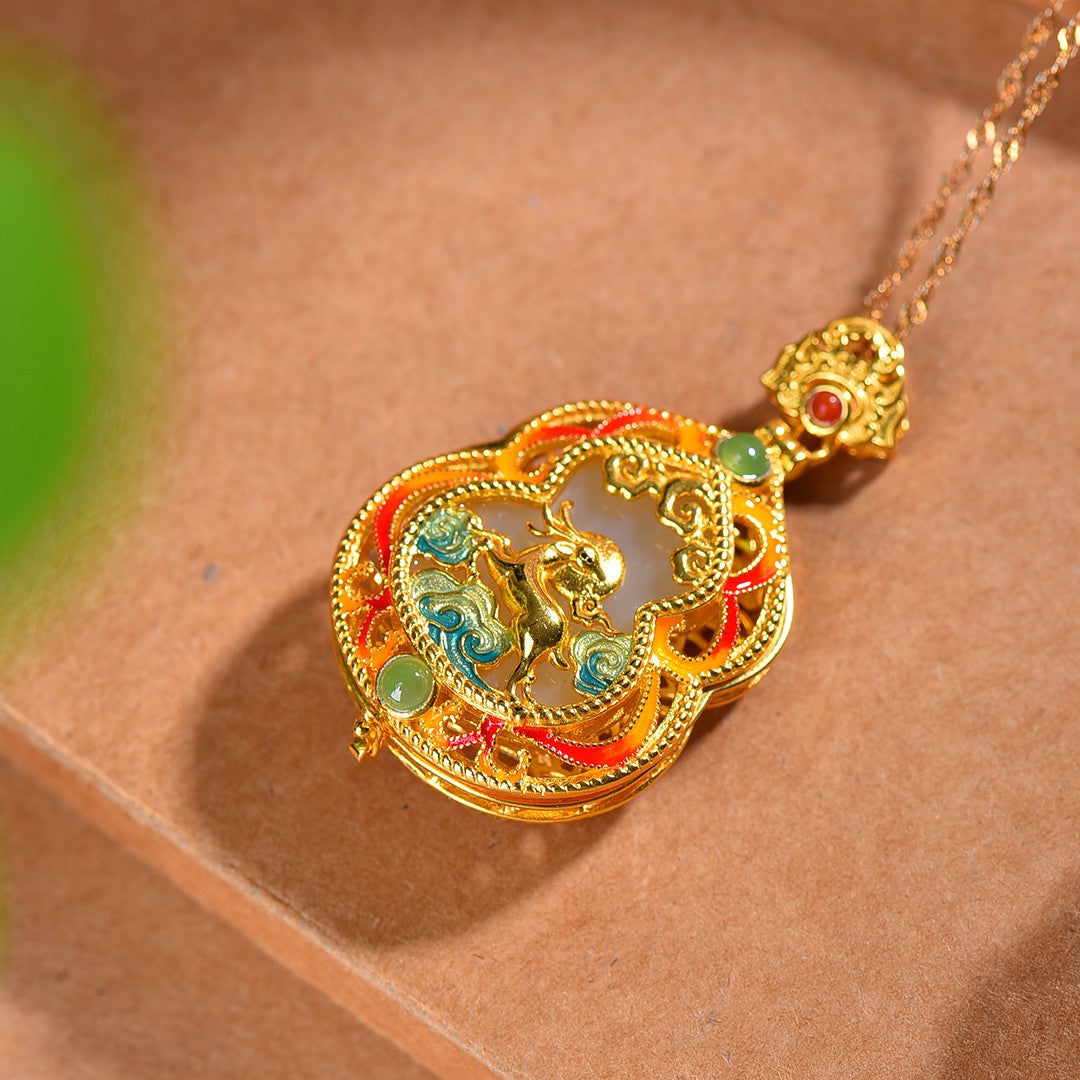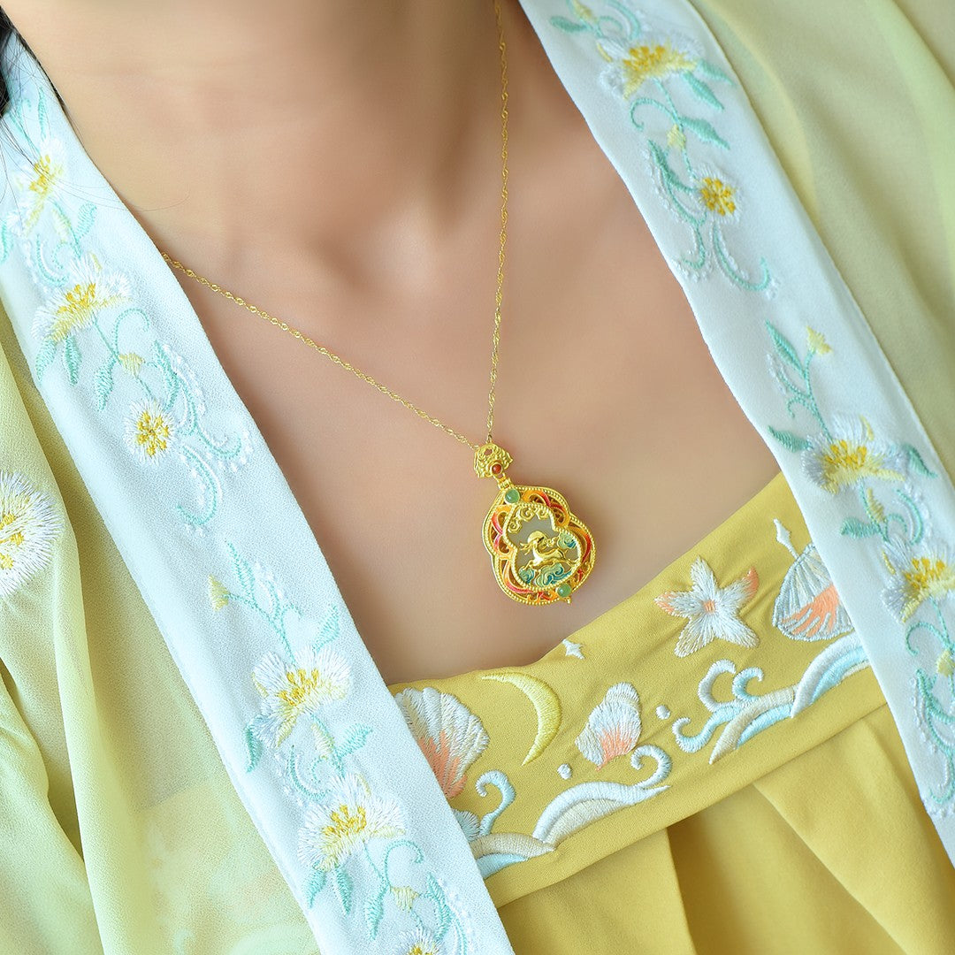 Silver gold-plated inlaid with Hetian white jade hollow enamel gourd Yi Lu You Ni sachet pendant, jade size: 16mmx20mm    银镀金镶和田白玉镂空珐琅葫芦一鹿有你香囊吊坠