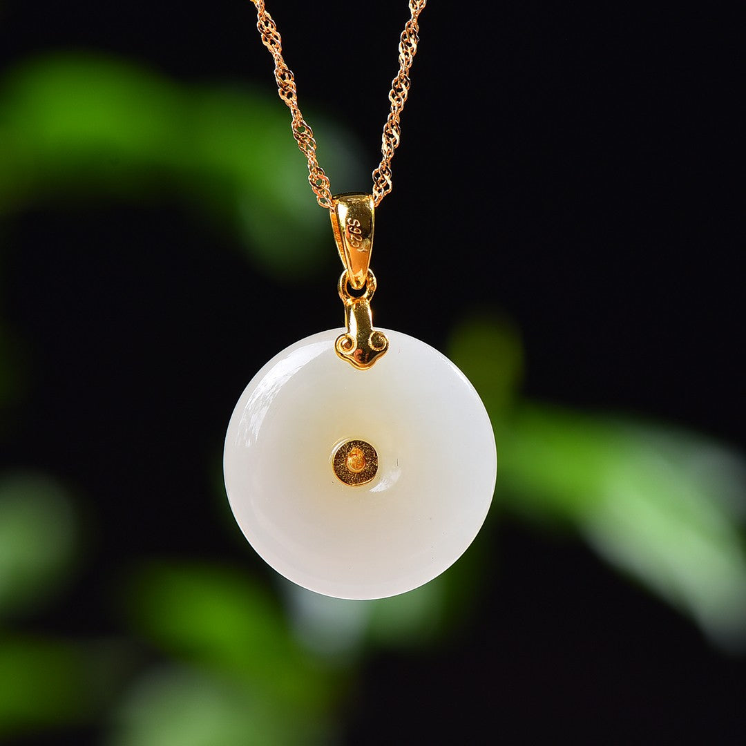 Silver gold plated Hetian white jade peace buckle pendant, jade size: 20mmx20mm    银镀金镶和田白玉平安扣吊坠