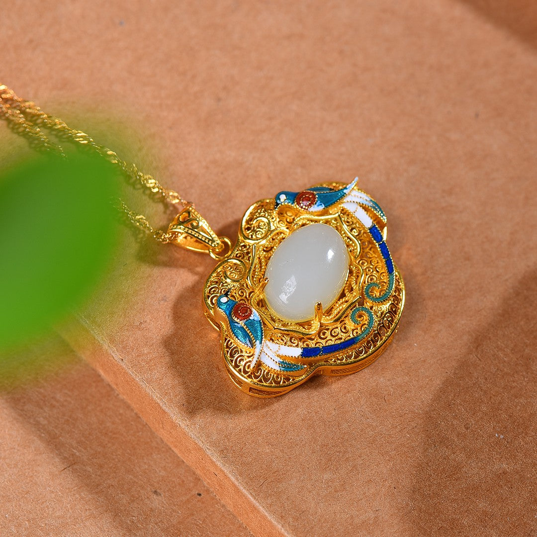 Silver gold plated Hetian white jade egg surface enamel Ruyi lock pendant, jade size: 10mmx14mm    银镀金镶和田白玉蛋面珐琅如意锁吊坠