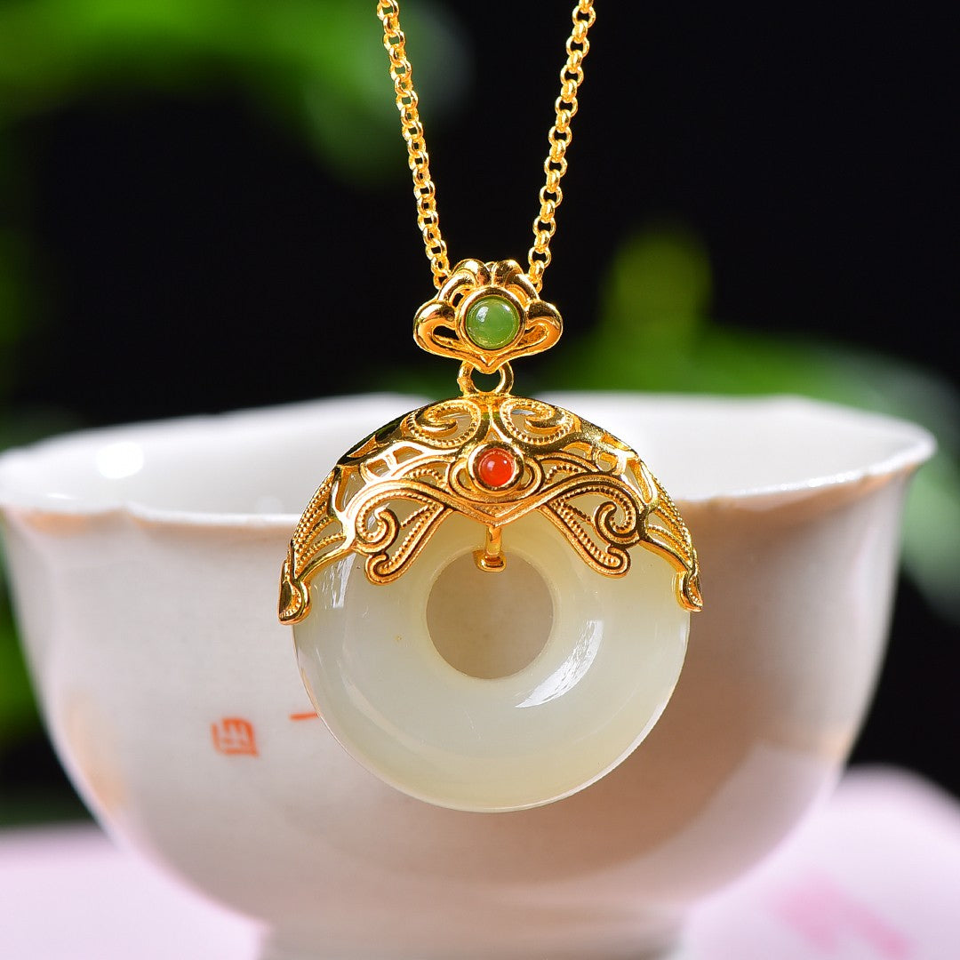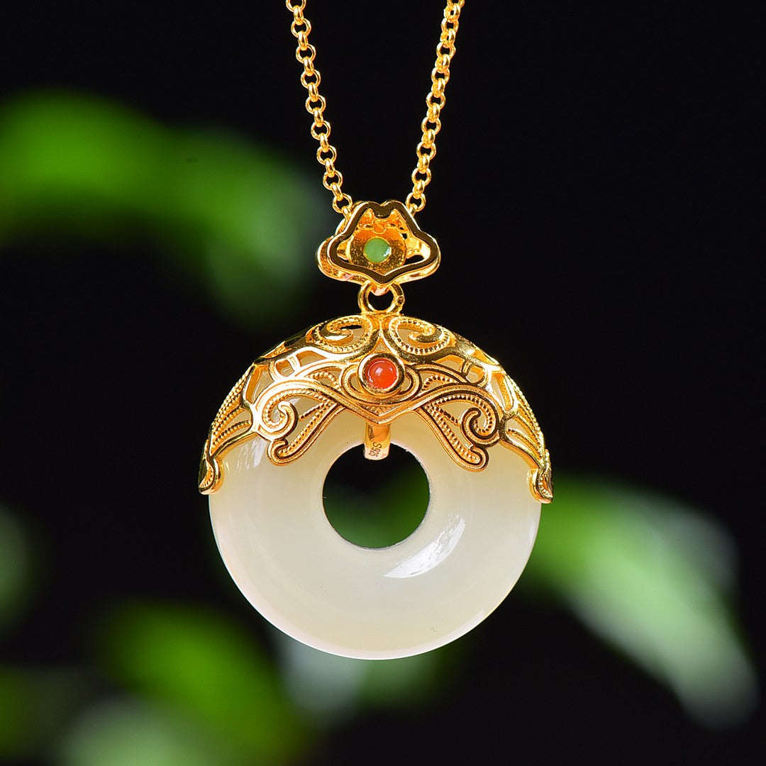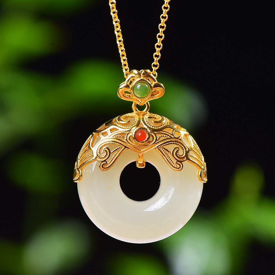Silver gold plated Hetian white jade peace ring pendant, jade size: 25mmx25mm    银镀金镶和田白玉平安环吊坠
