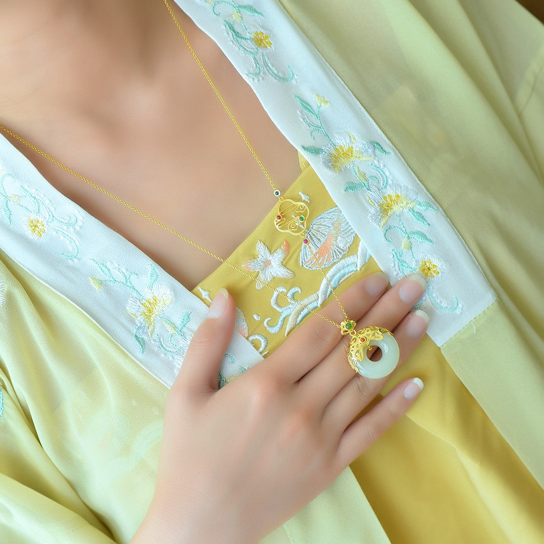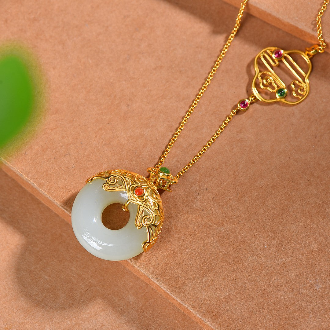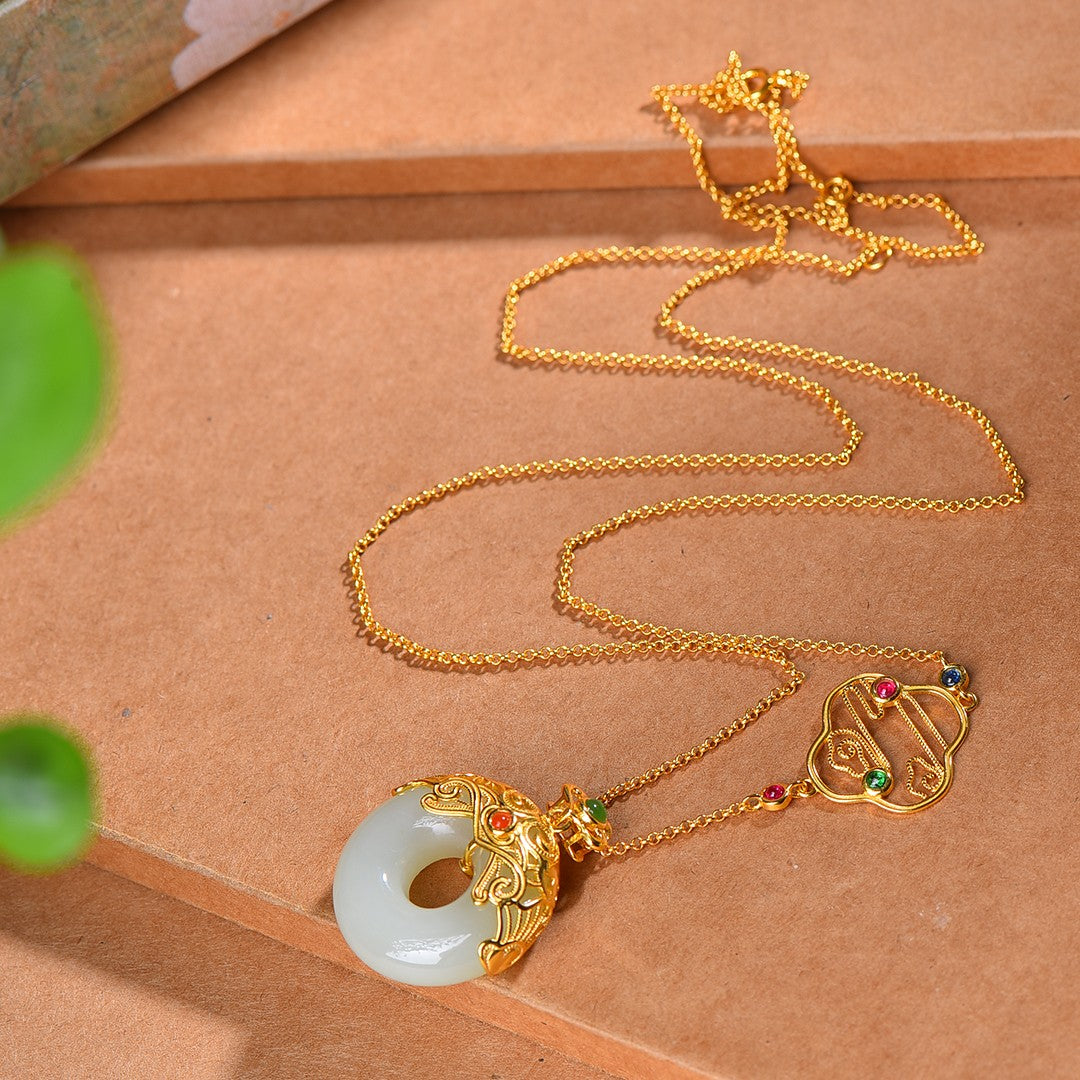 Silver gold plated Hetian white jade peace ring pendant, jade size: 25mmx25mm    银镀金镶和田白玉平安环吊坠