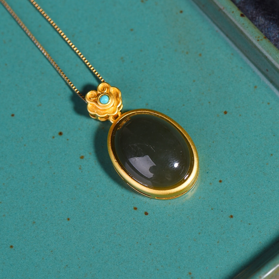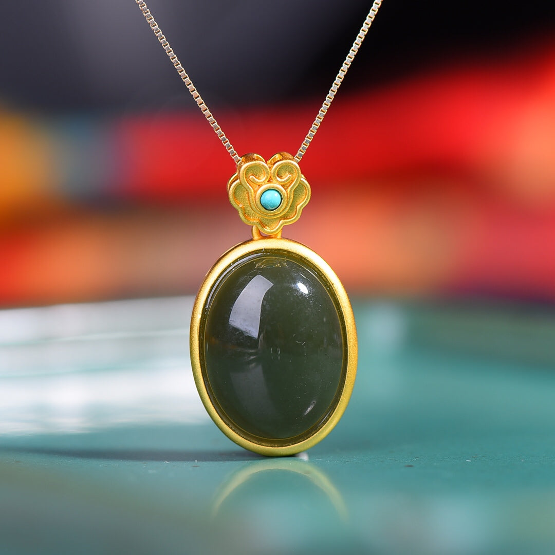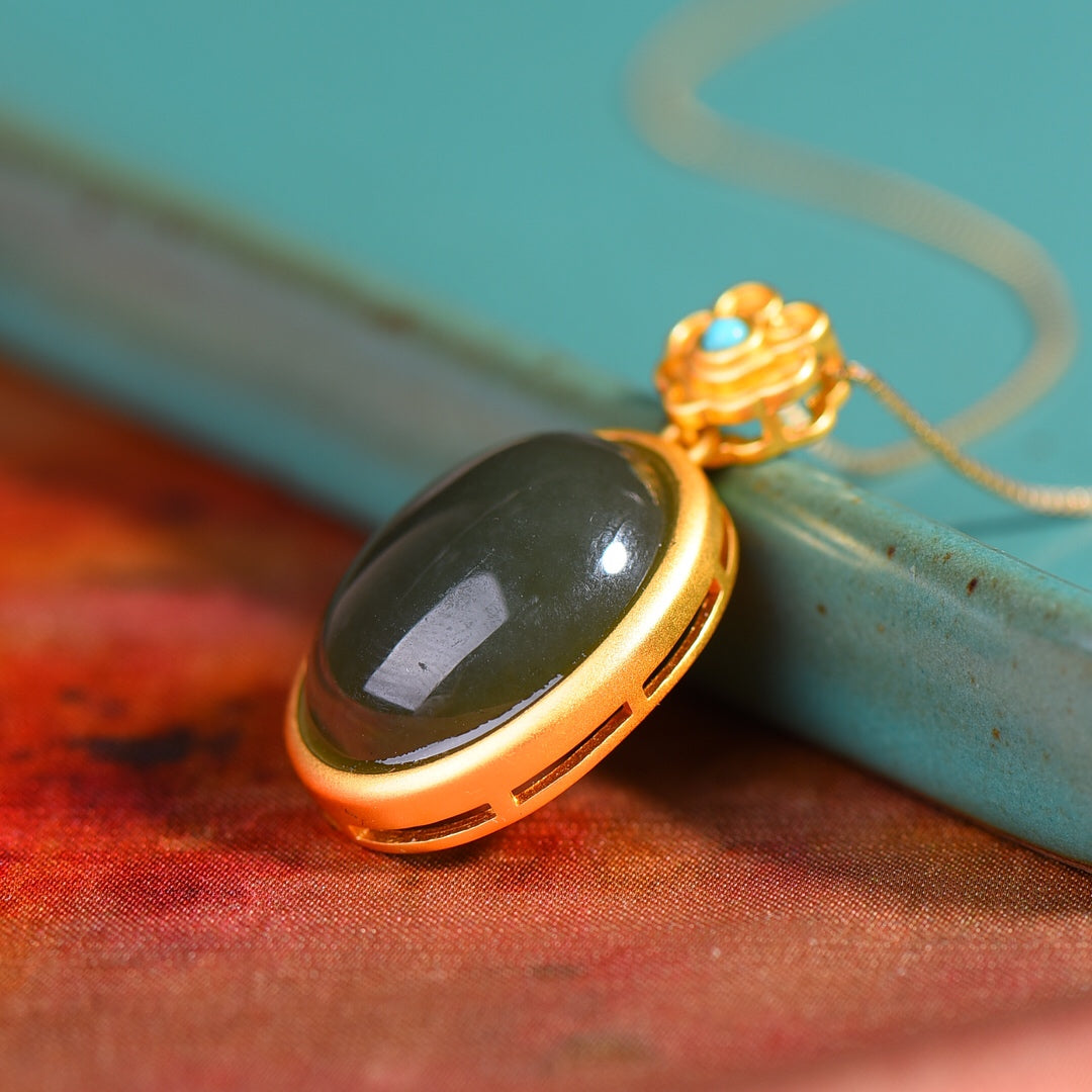Silver gold plated Hetian jade duck egg green egg noodles with turquoise pendant, jade size: 15mmx20mm    银镀金镶和田玉鸭蛋青蛋面配绿松石吊坠