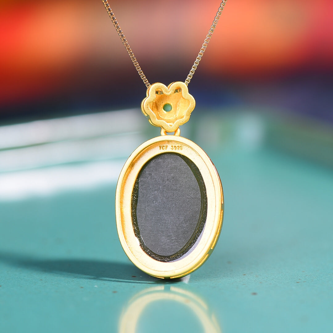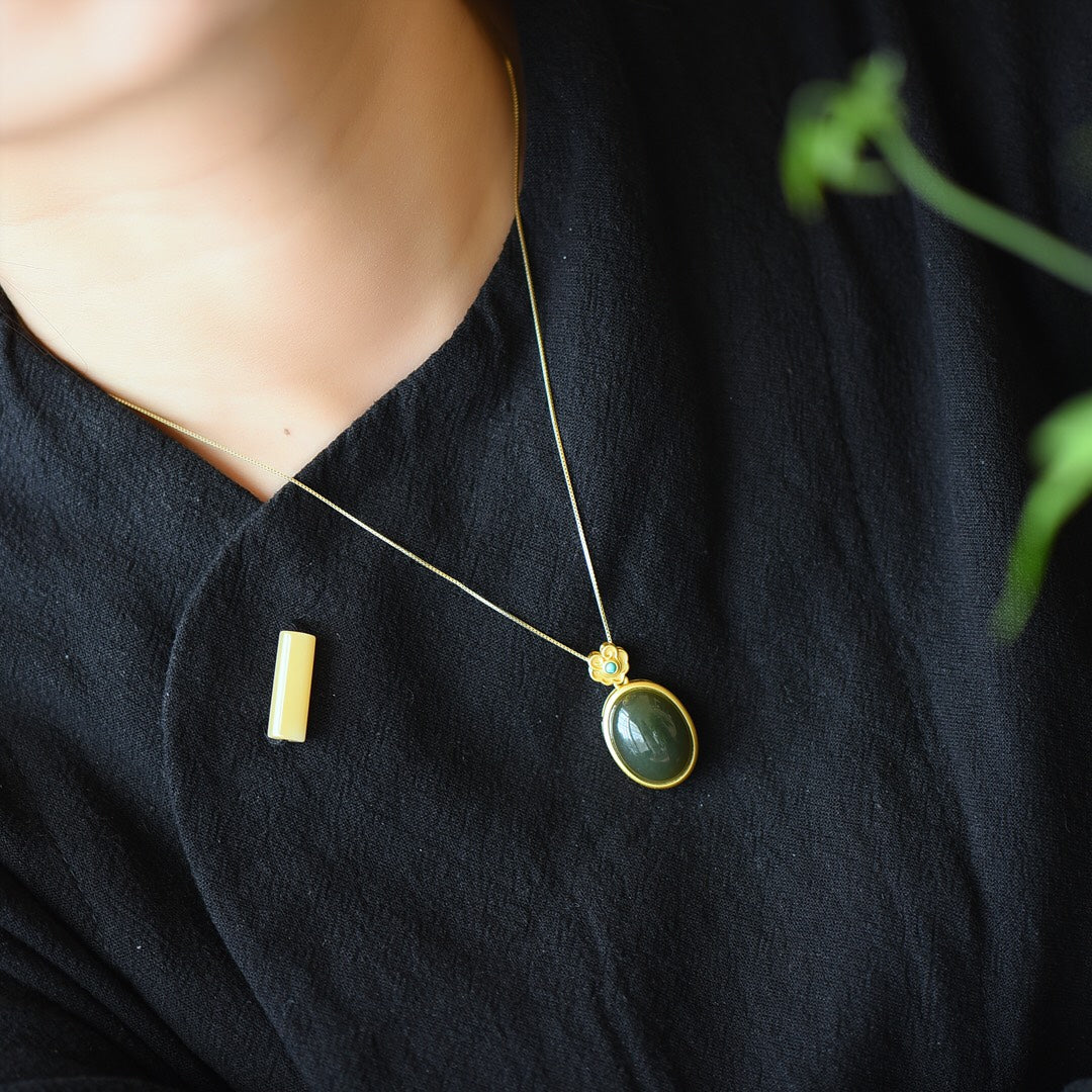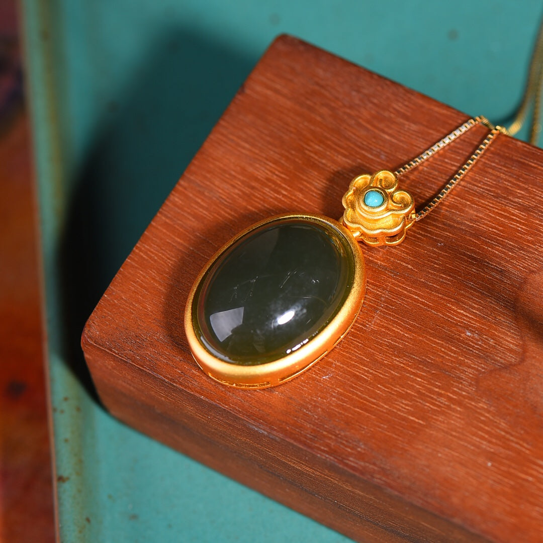 Silver gold plated Hetian jade duck egg green egg noodles with turquoise pendant, jade size: 15mmx20mm    银镀金镶和田玉鸭蛋青蛋面配绿松石吊坠