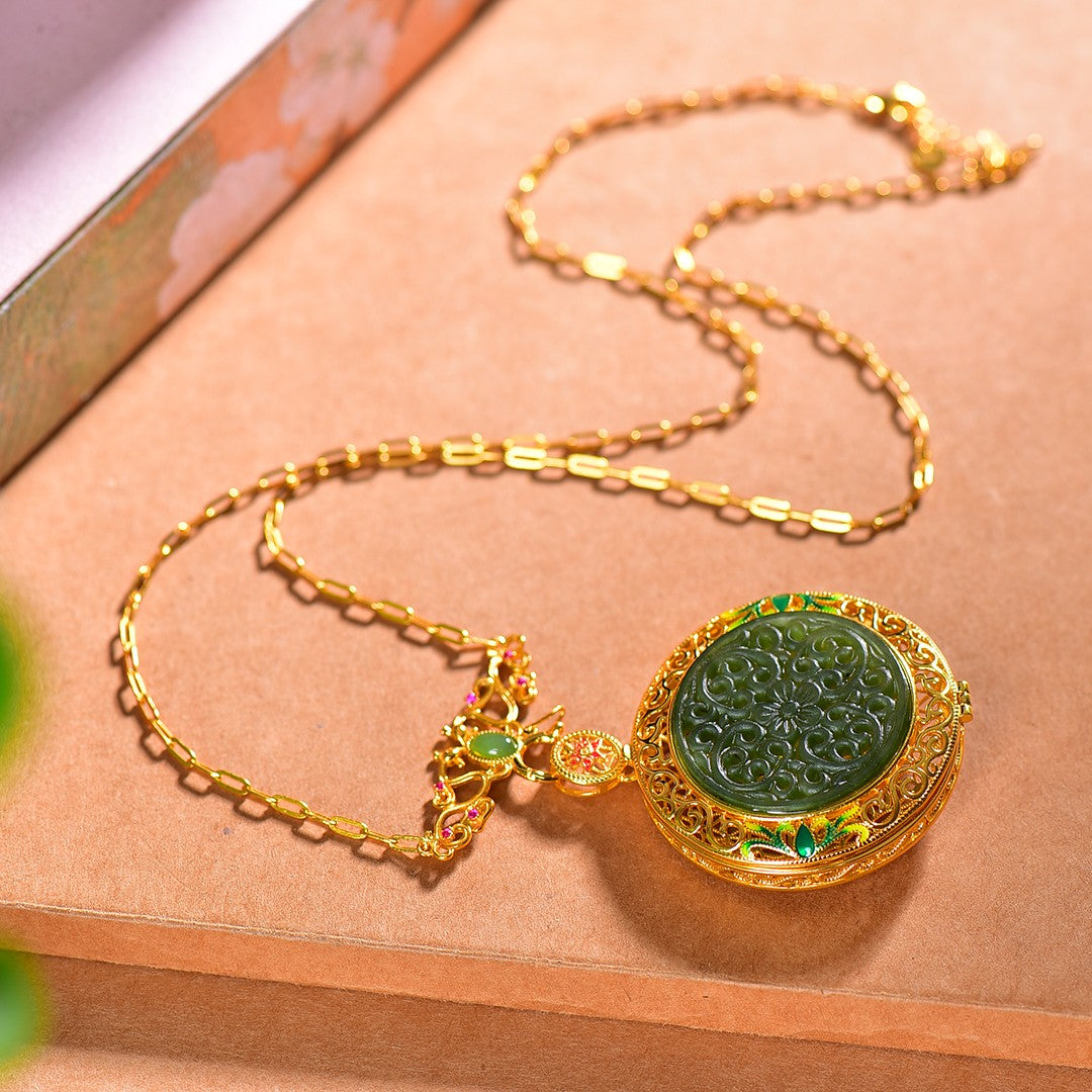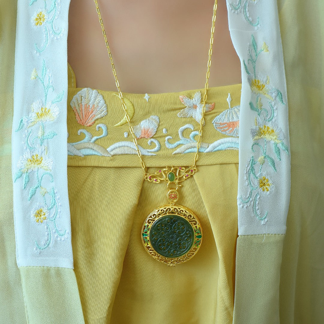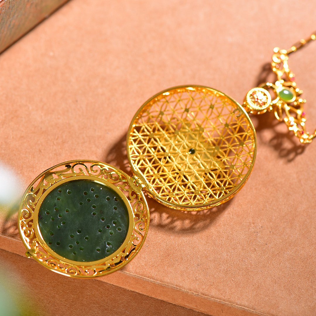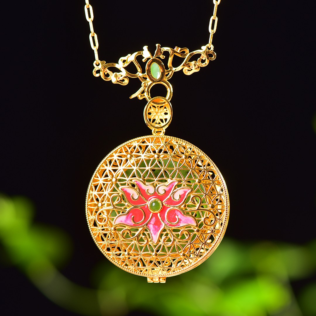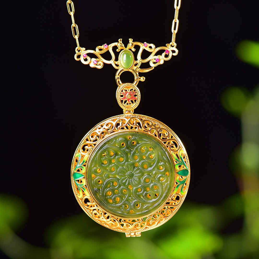 Silver gold-plated inlaid Hetian jade jasper hollow sachet enamel pendant, jade size: 31mmx31mm    银镀金镶嵌和田玉碧玉镂空香囊珐琅吊坠