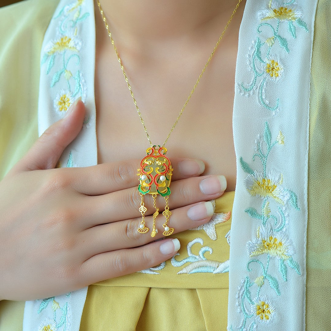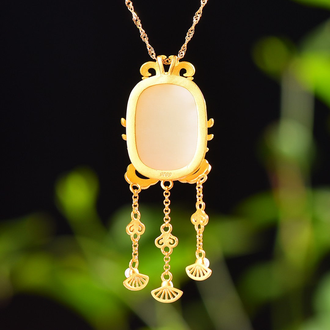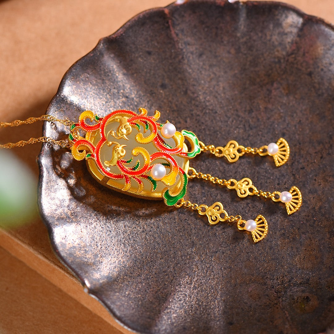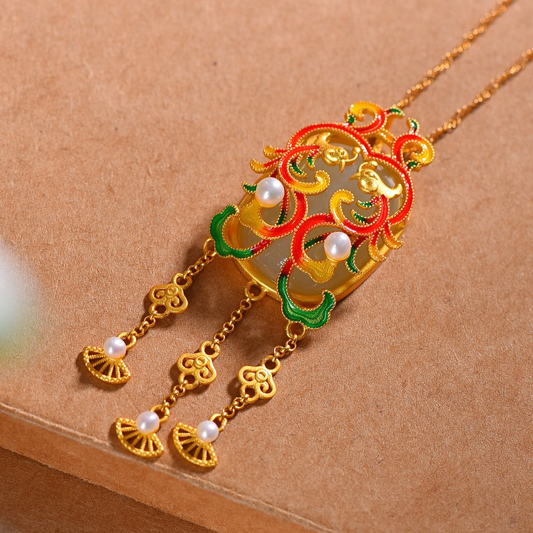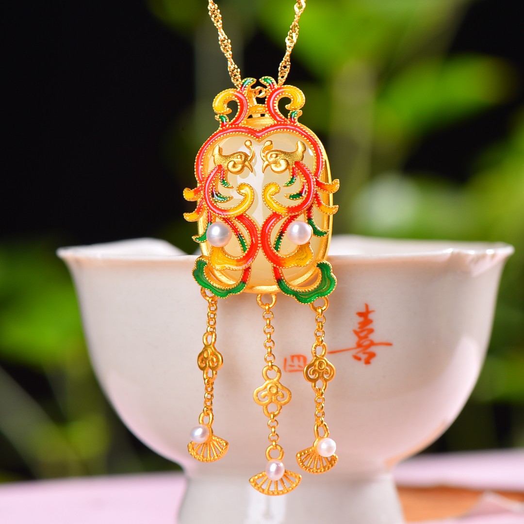 Silver gold plated Hetian jade enamel tassel pendant, jade size: 16mmx22mm    银镀金镶嵌和田玉珐琅流苏吊坠