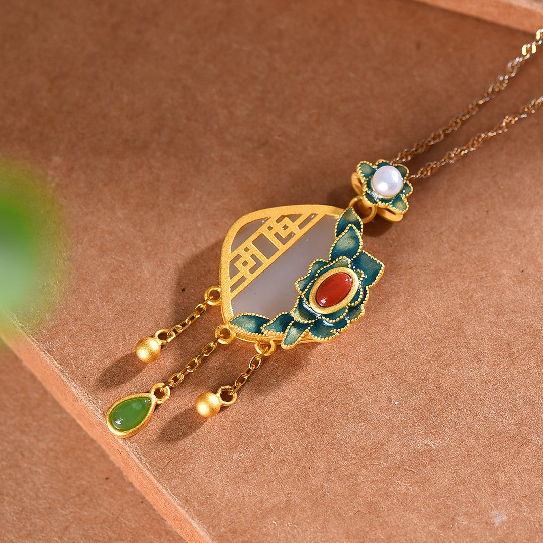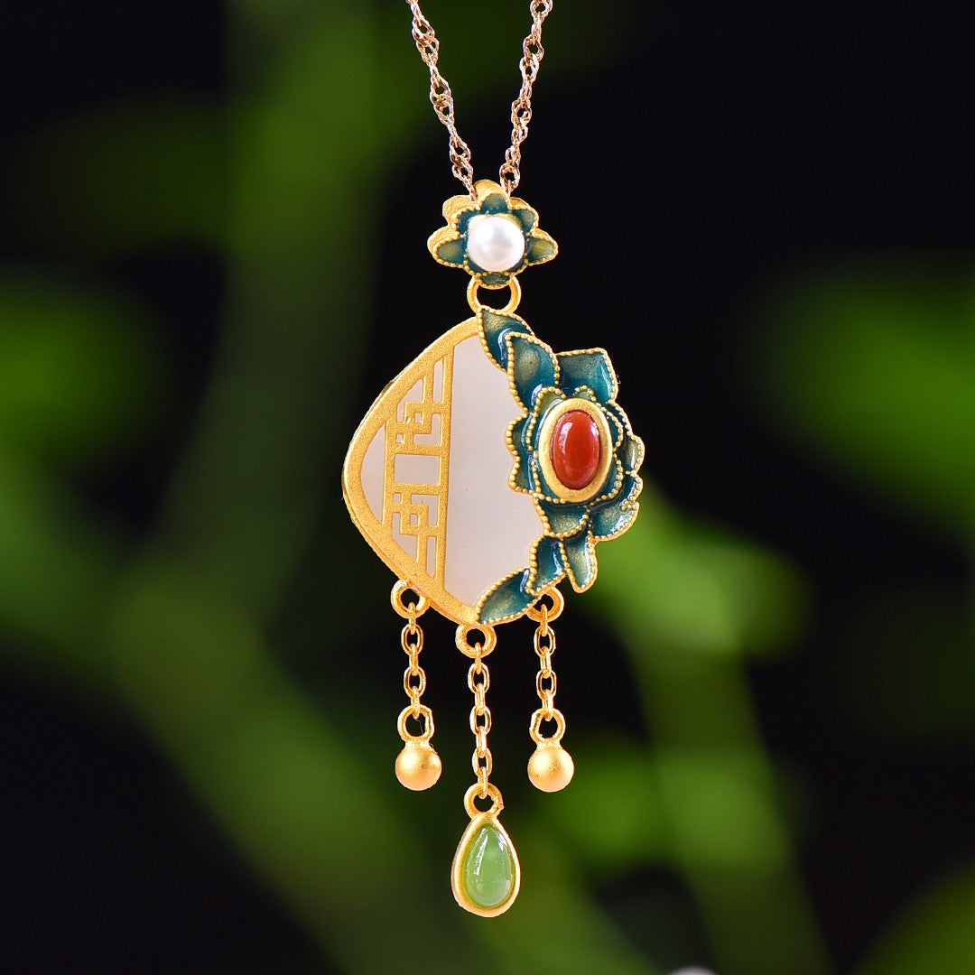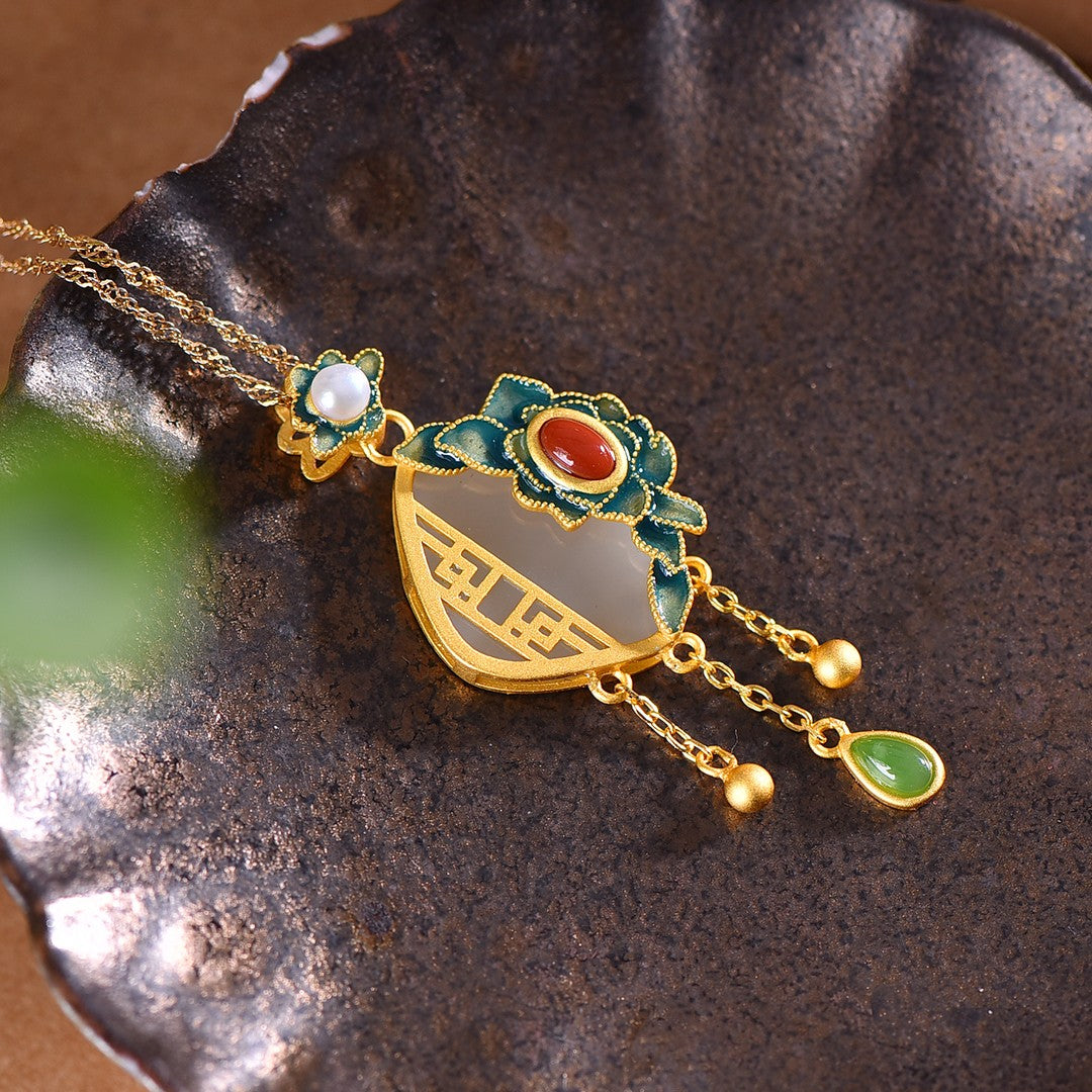 Silver-plated gold-plated Hetian jade special-shaped flat enamel with multi-treasure tassel pendant., jade size: 16mmx19mm   银镀金镶和田玉异形平面珐琅配多宝流苏吊坠