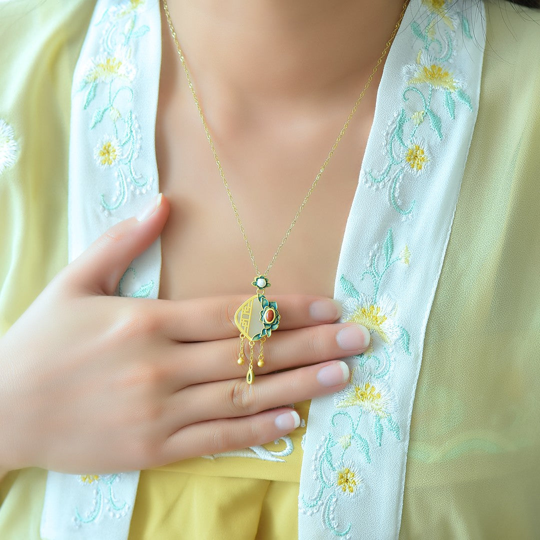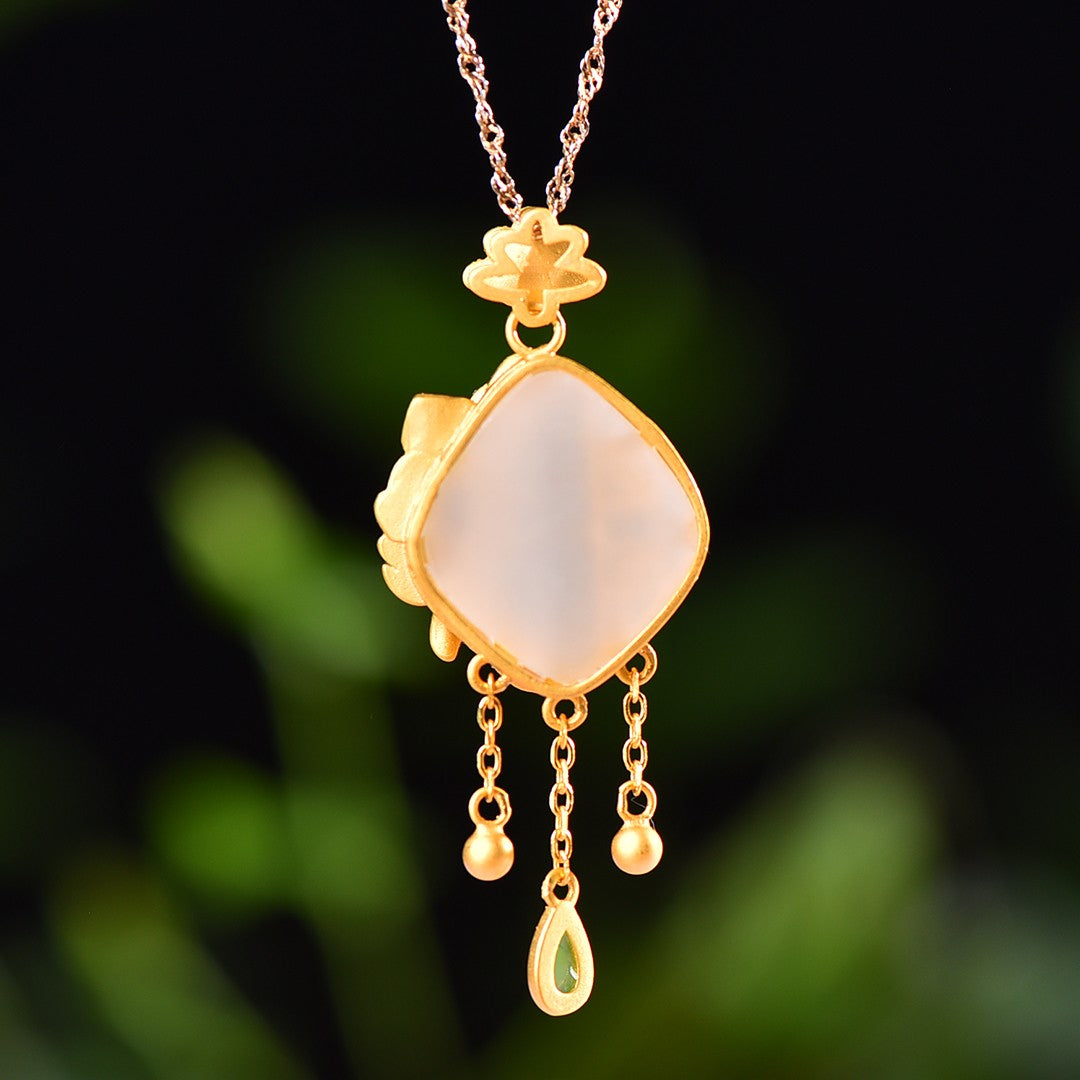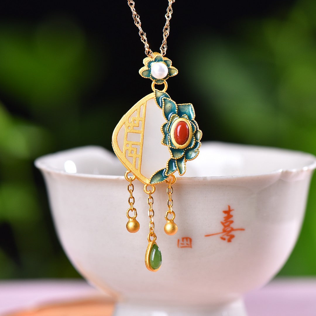 Silver-plated gold-plated Hetian jade special-shaped flat enamel with multi-treasure tassel pendant., jade size: 16mmx19mm   银镀金镶和田玉异形平面珐琅配多宝流苏吊坠
