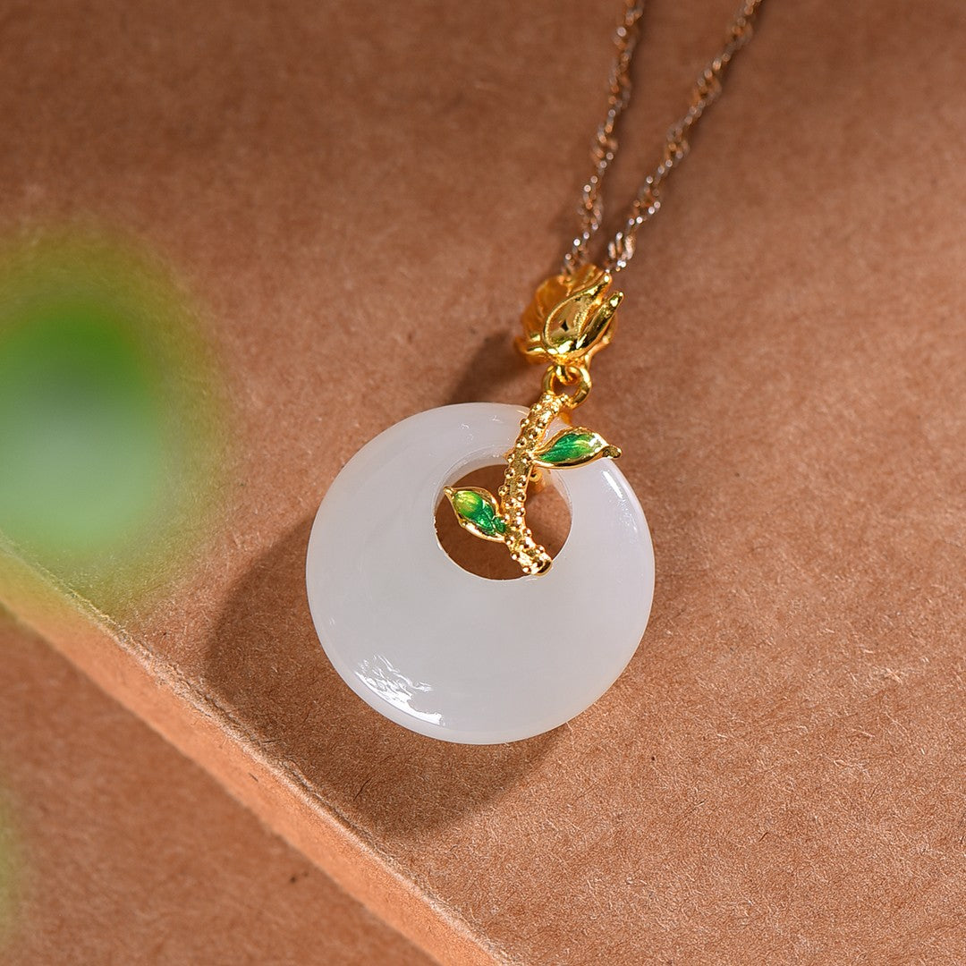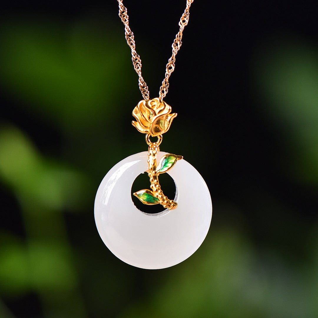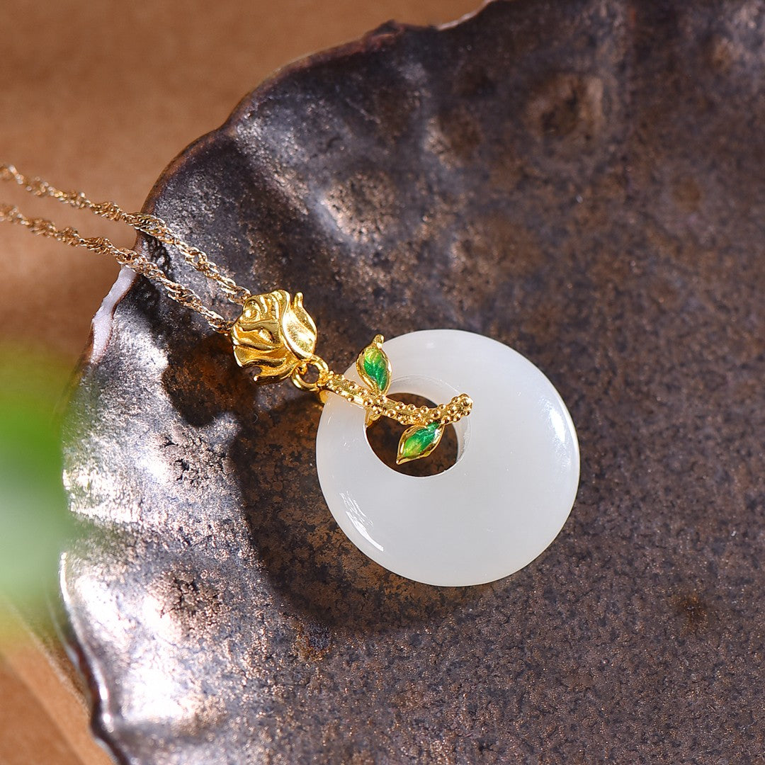 Silver gold plated Hetian jade peace ring with enamel pendant, jade size: 20mmx20mm   银镀金镶和田玉平安环配珐琅吊坠