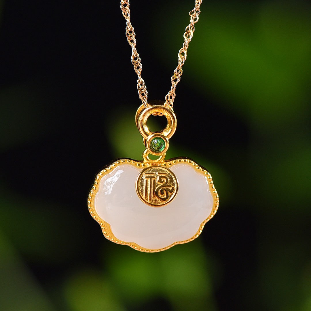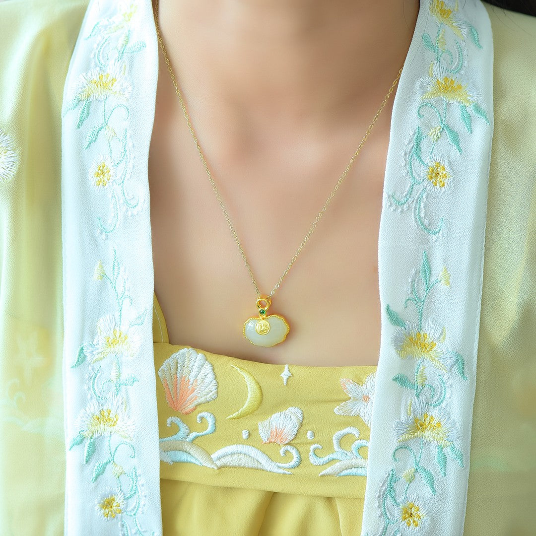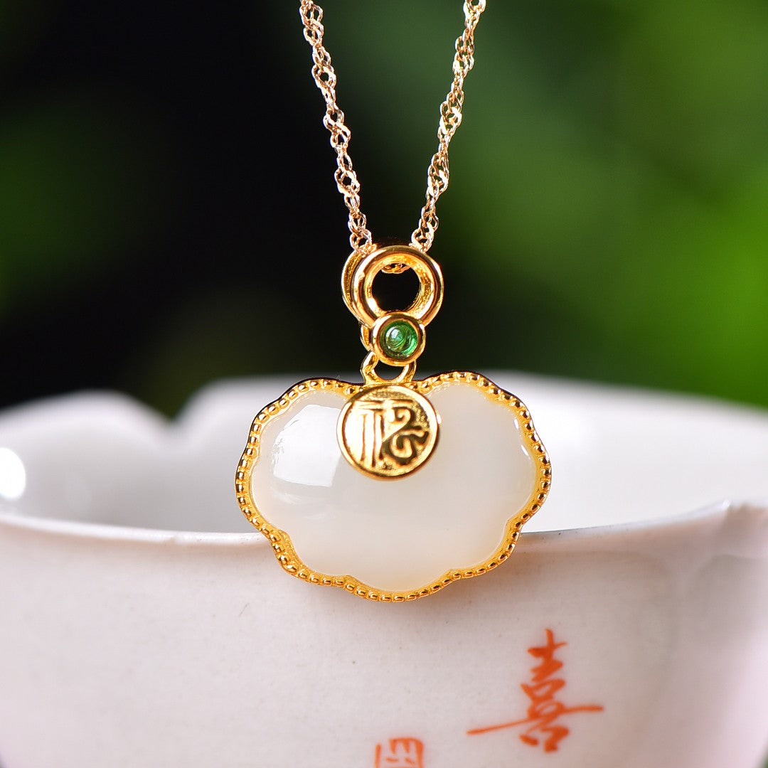 Silver gold-plated Hetian jade Ruyi lock with color manuscript blessing pendant, jade size: 13mmx18mm   银镀金镶和田玉如意锁配彩稿福字吊坠