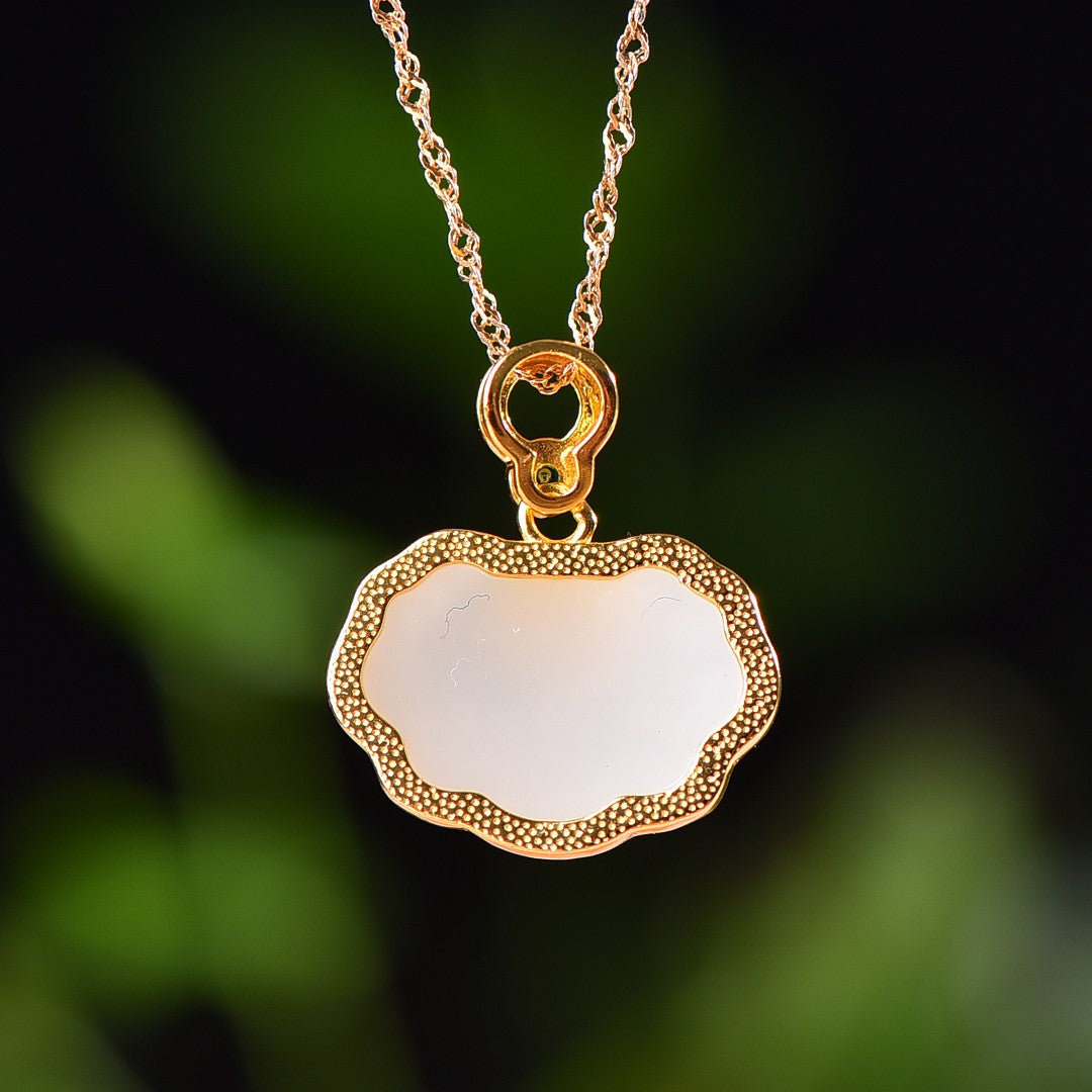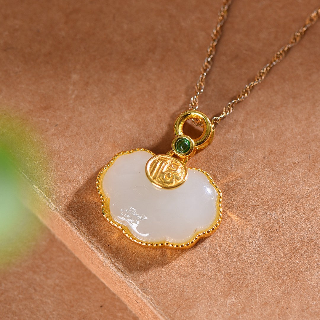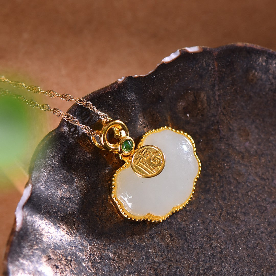 Silver gold-plated Hetian jade Ruyi lock with color manuscript blessing pendant, jade size: 13mmx18mm   银镀金镶和田玉如意锁配彩稿福字吊坠