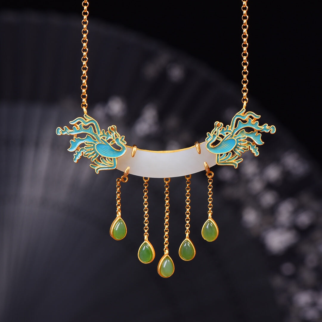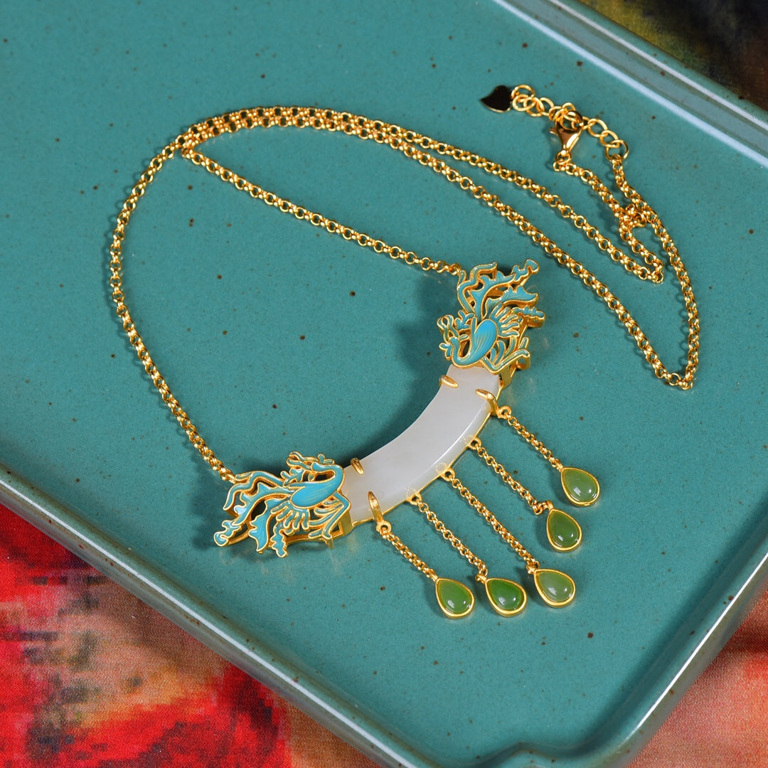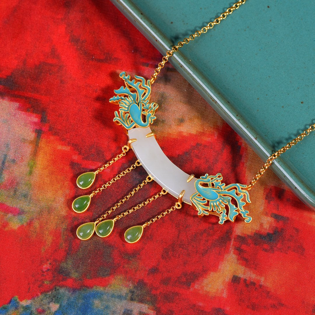Silver inlaid Hetian jade curved enamel pendant