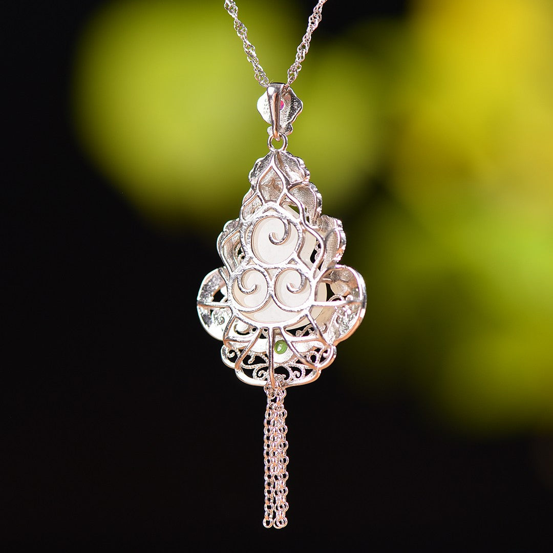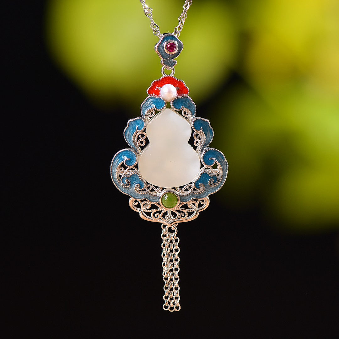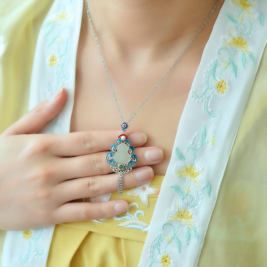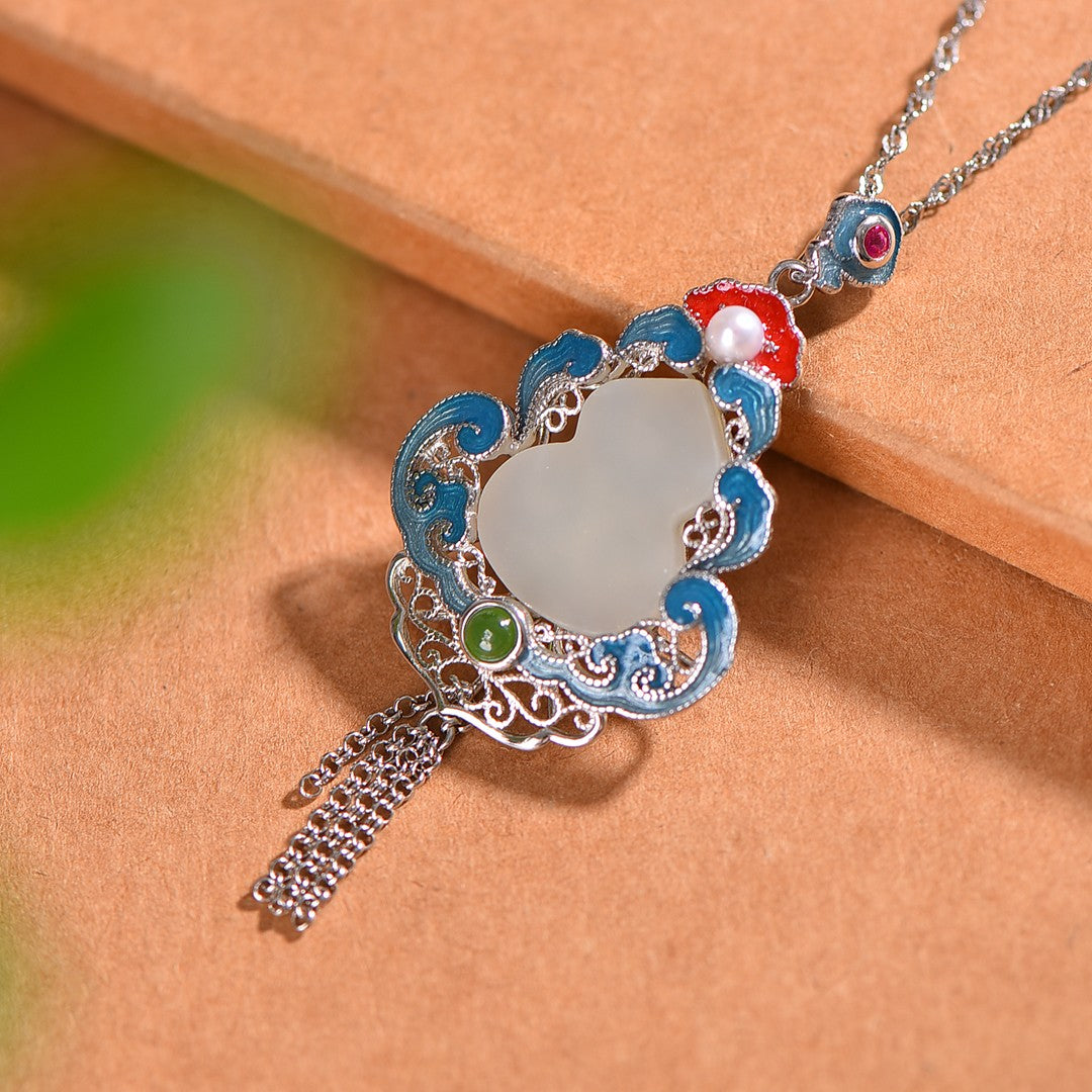 Silver inlaid Hetian jade enamel flat Fulu pendant