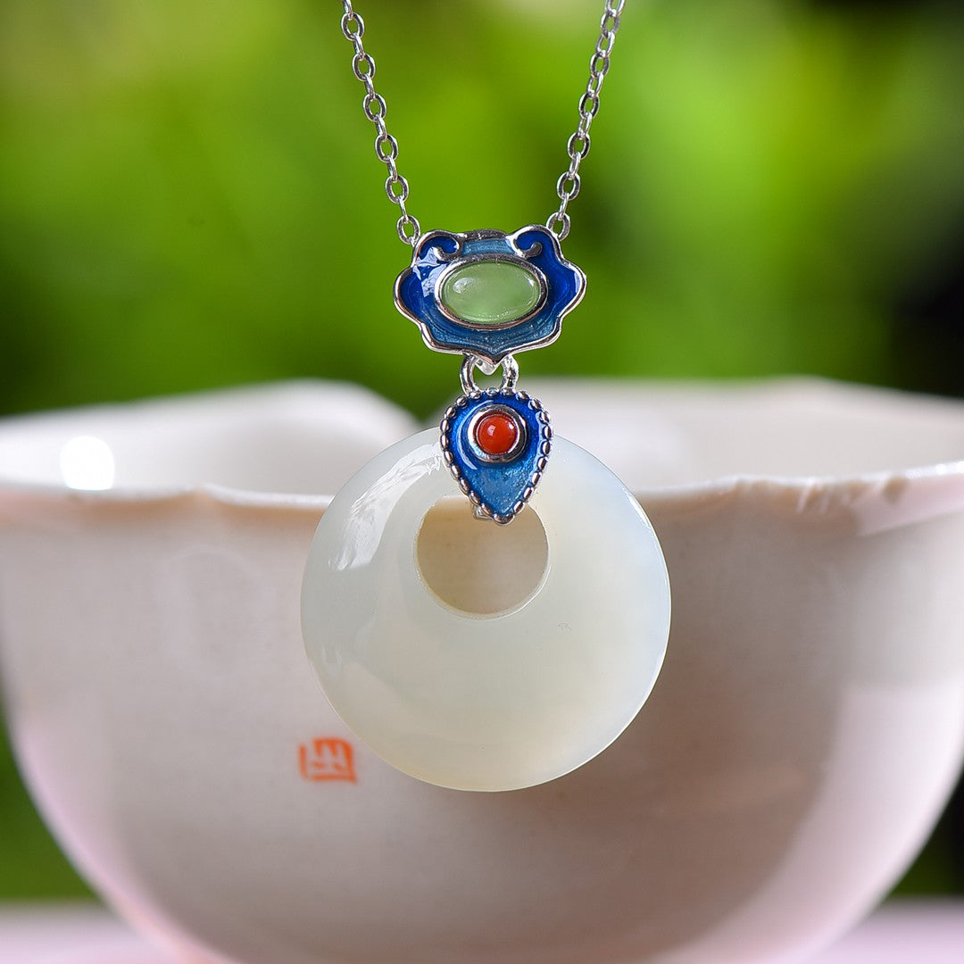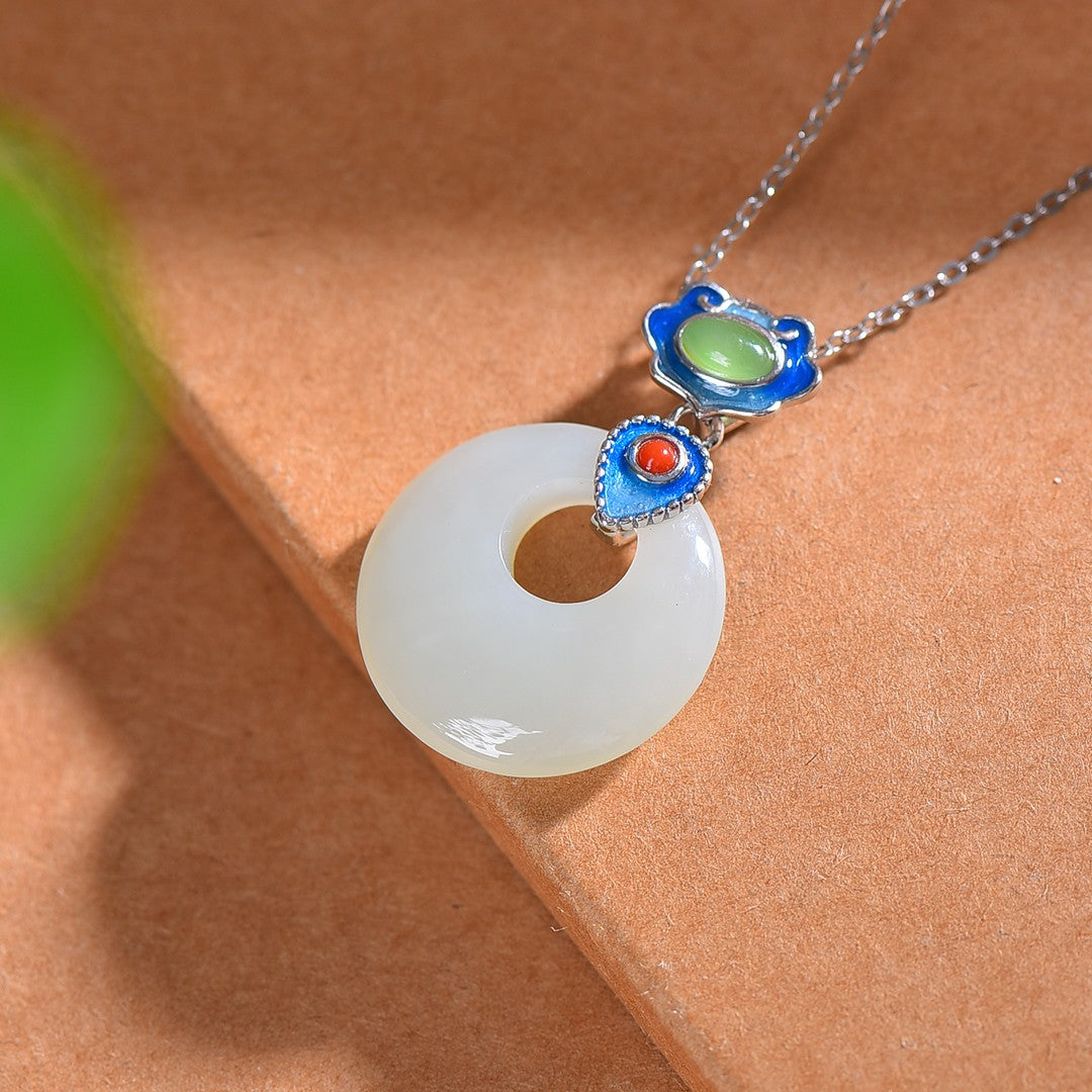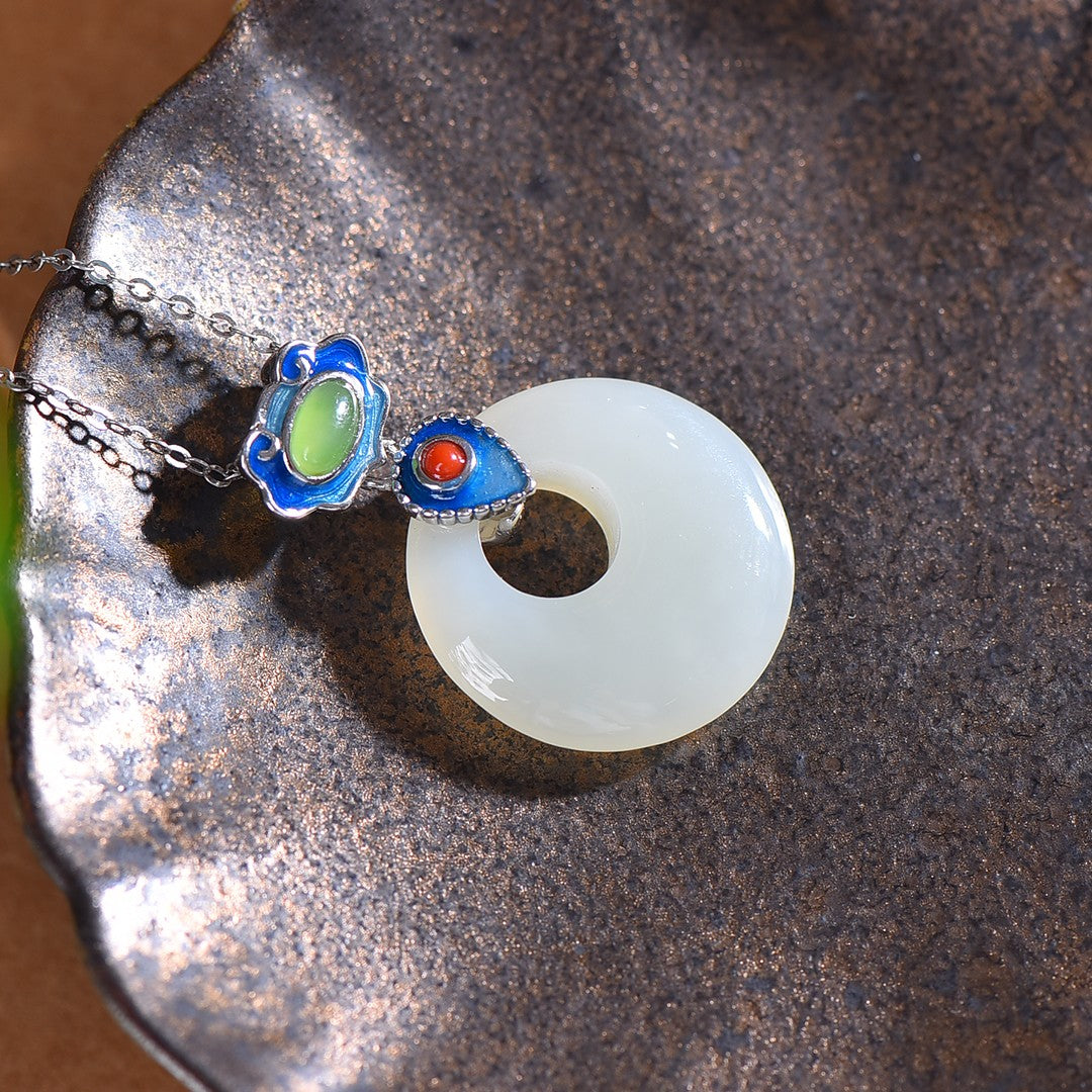Silver inlaid Hetian jade enamel peace ring pendant, jade size: 20mmx20mm         银镶嵌和田玉珐琅平安环吊坠,玉石尺寸:20mmx20mm