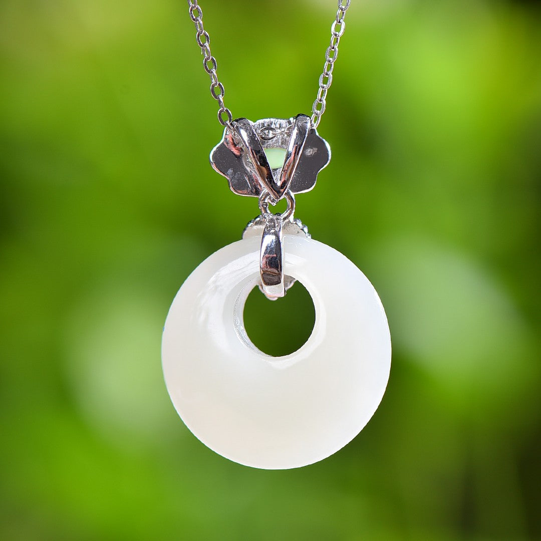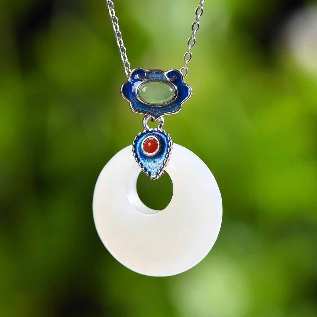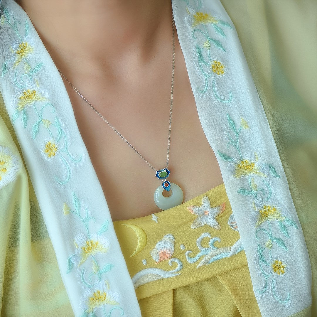 Silver inlaid Hetian jade enamel peace ring pendant, jade size: 20mmx20mm         银镶嵌和田玉珐琅平安环吊坠,玉石尺寸:20mmx20mm