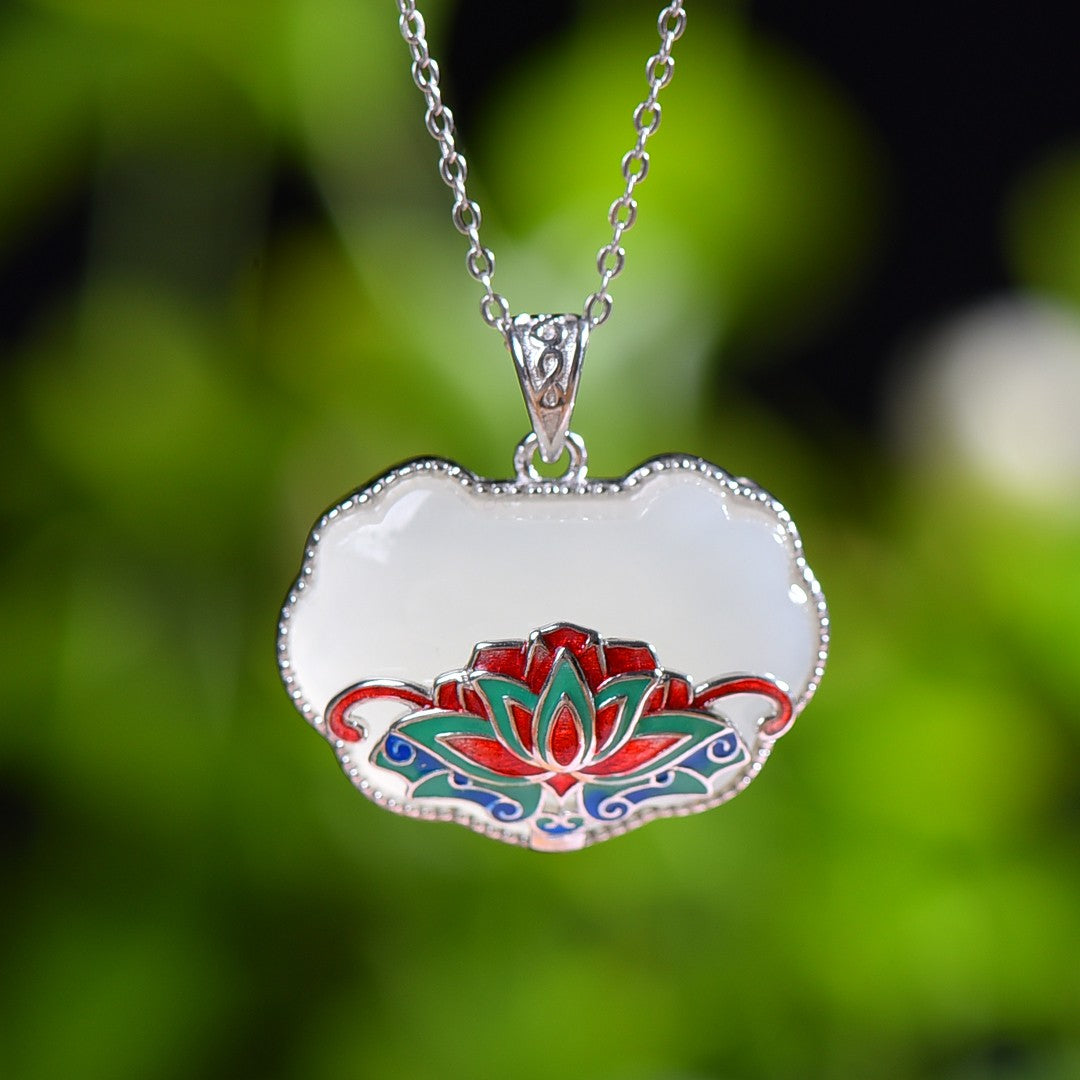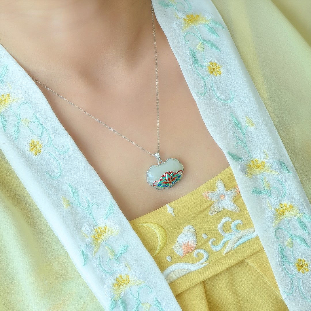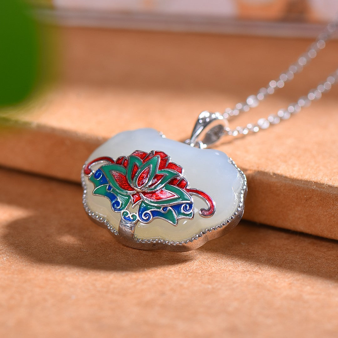 Silver inlaid Hetian jade enamel Ruyi lock pendant