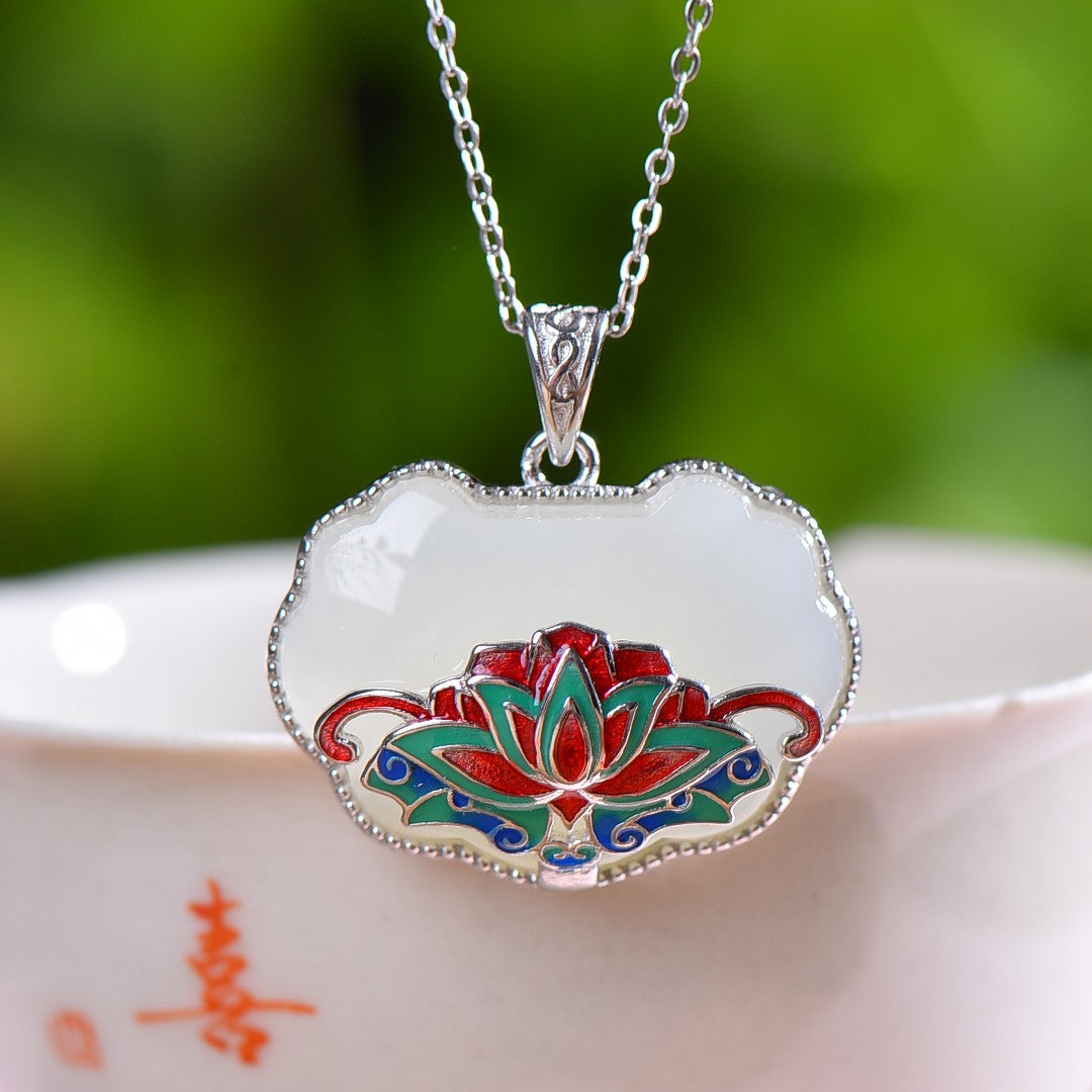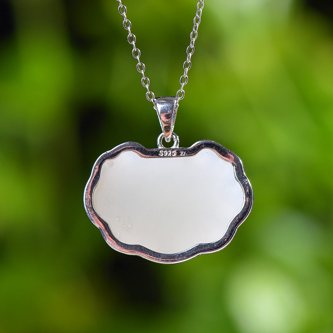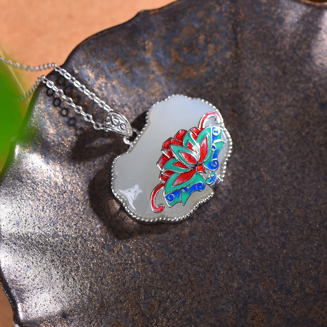 Silver inlaid Hetian jade enamel Ruyi lock pendant