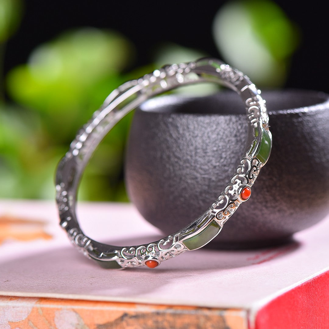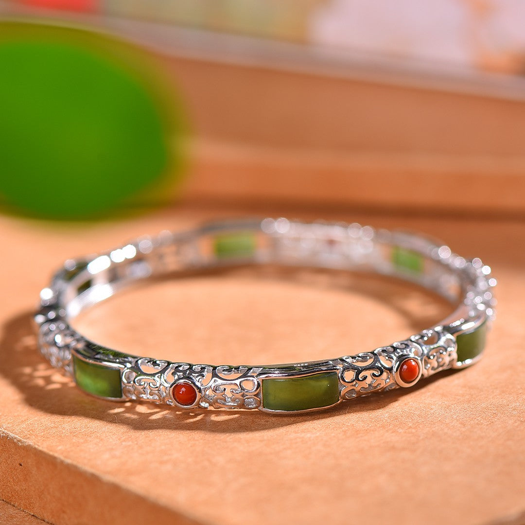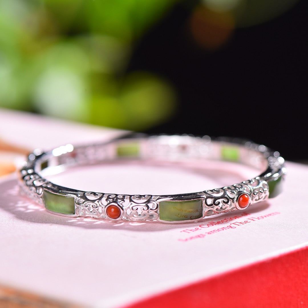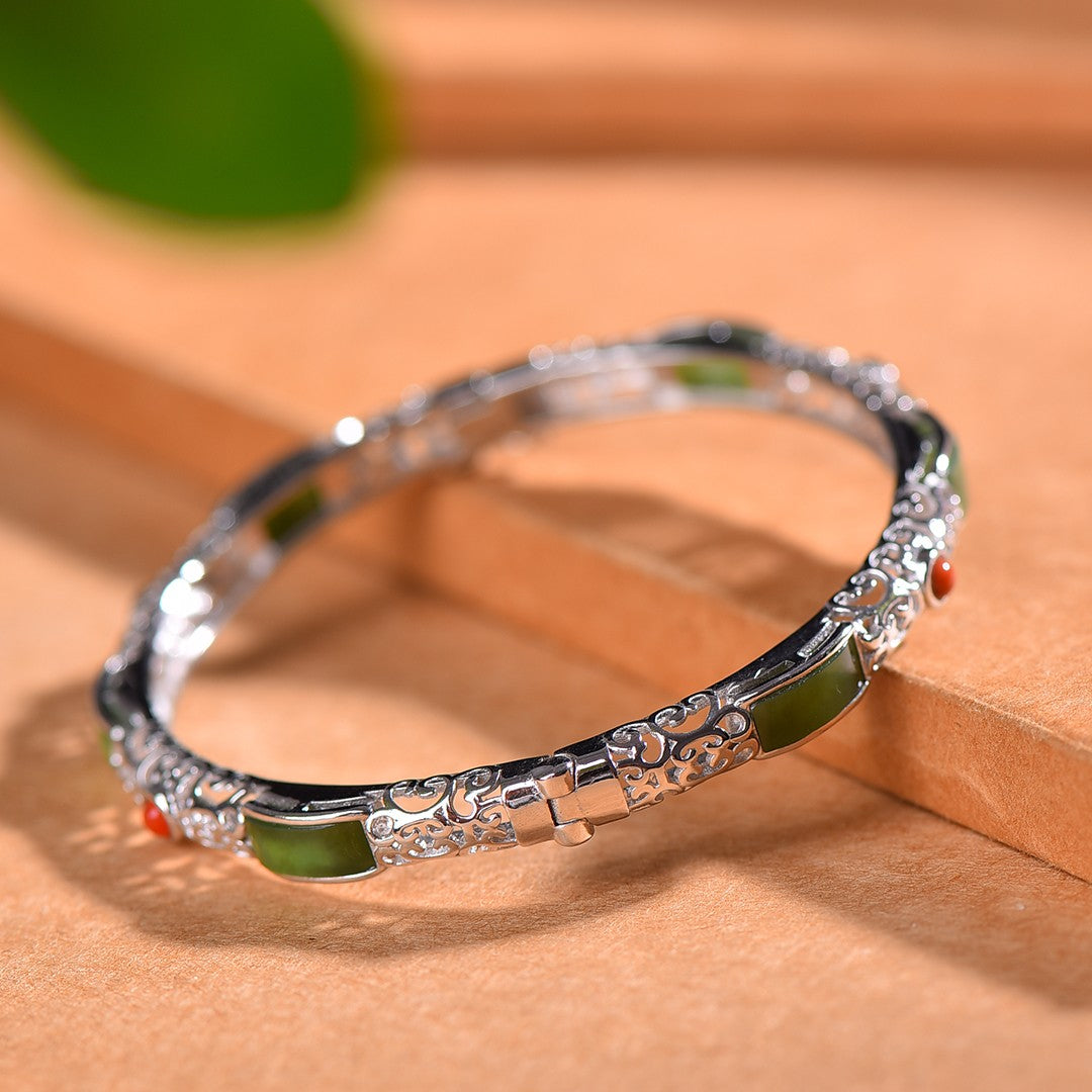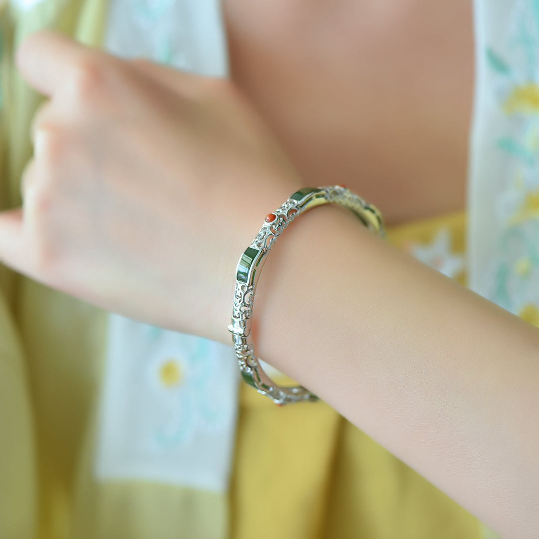 Silver gold plated Hetian jade jasper hollow enamel bracelet, jade size: 10mmx14mm    银镀金镶嵌和田玉碧玉镂空珐琅手镯