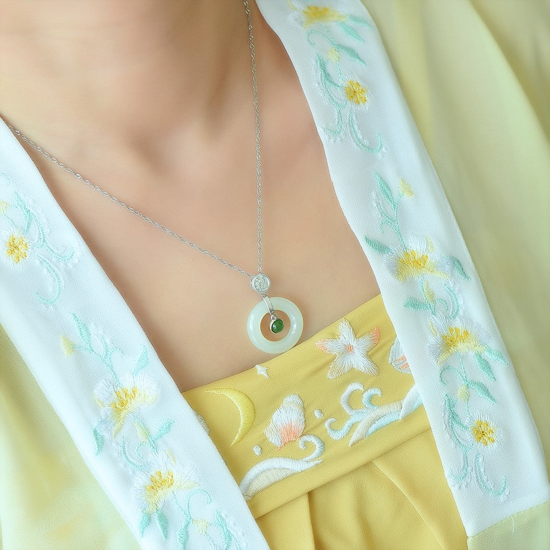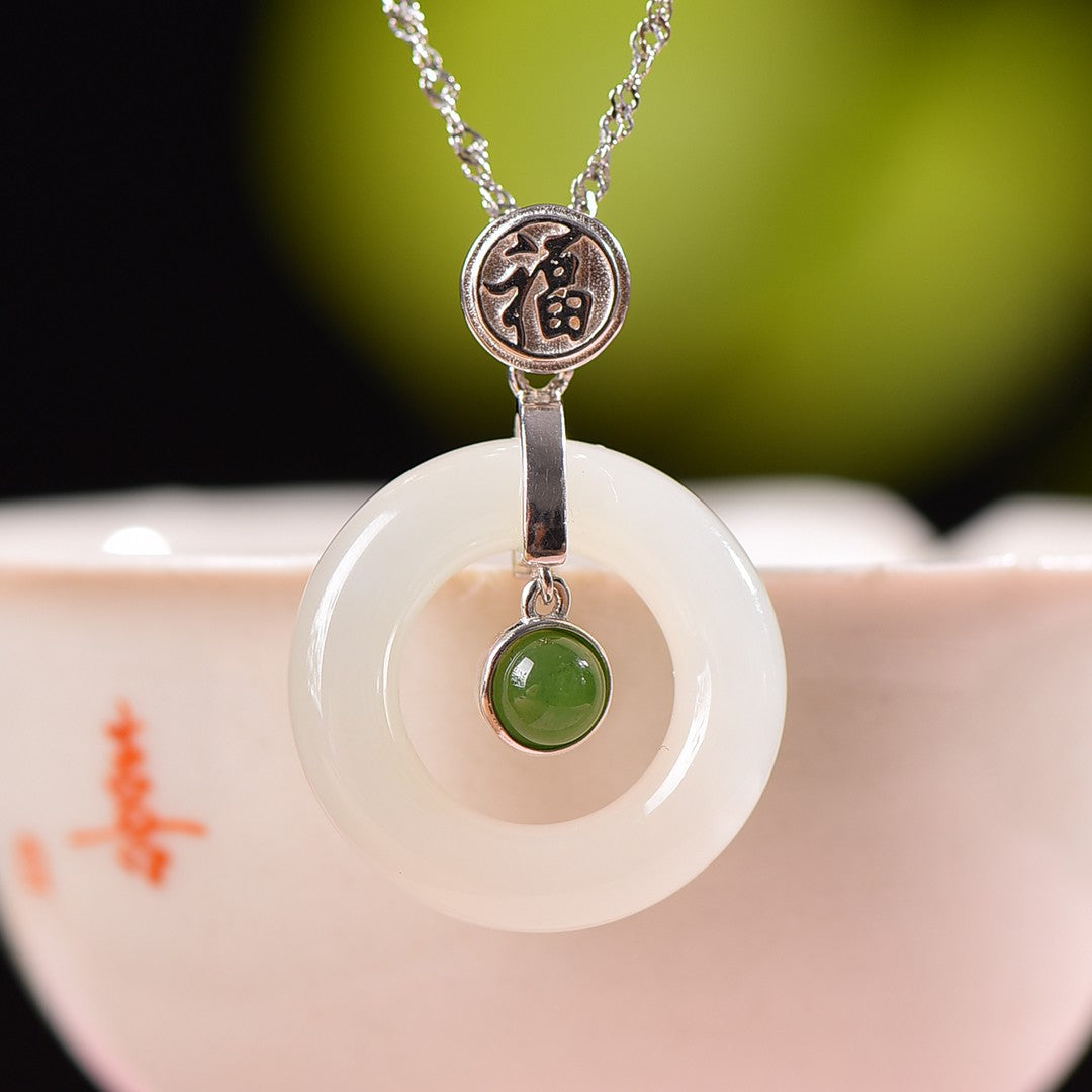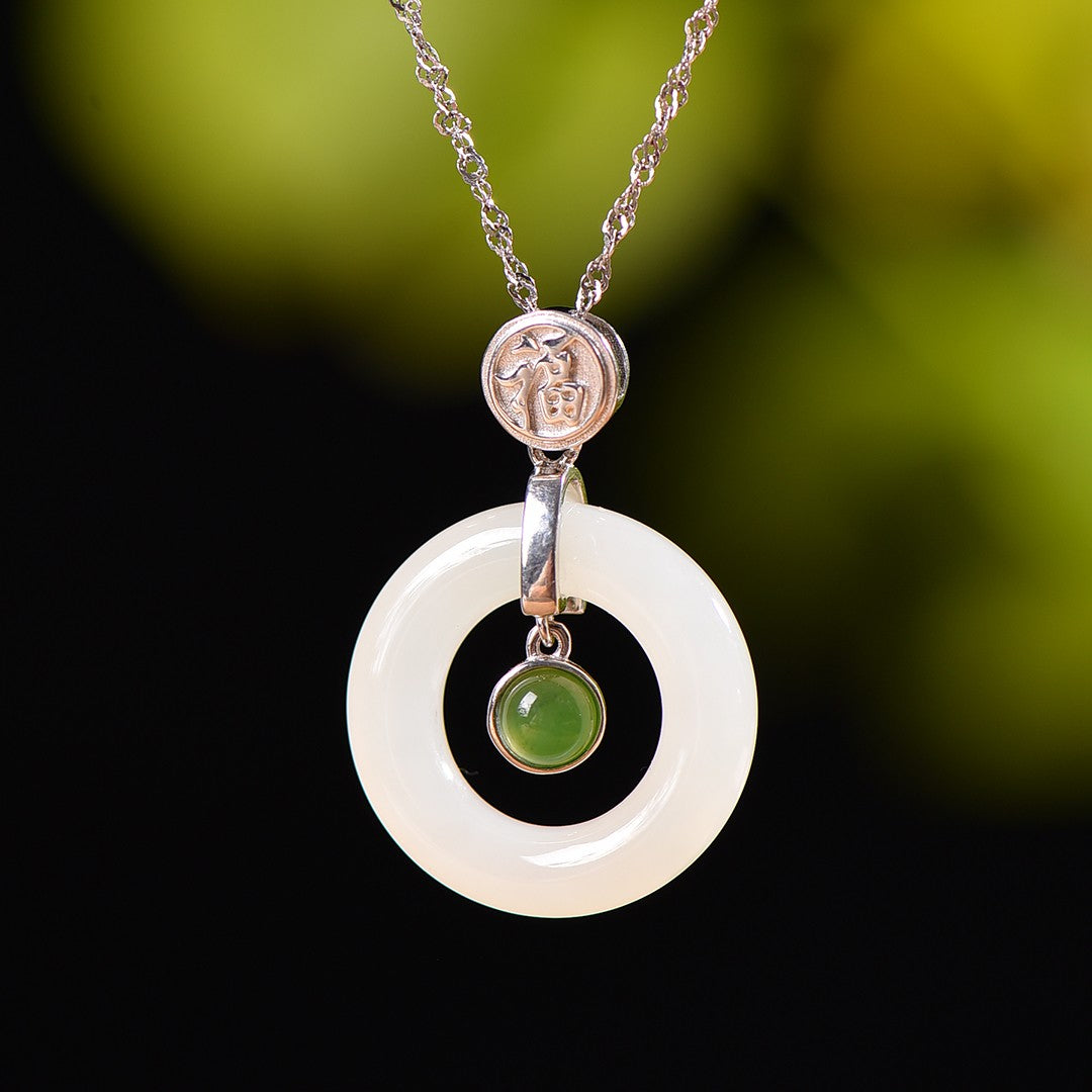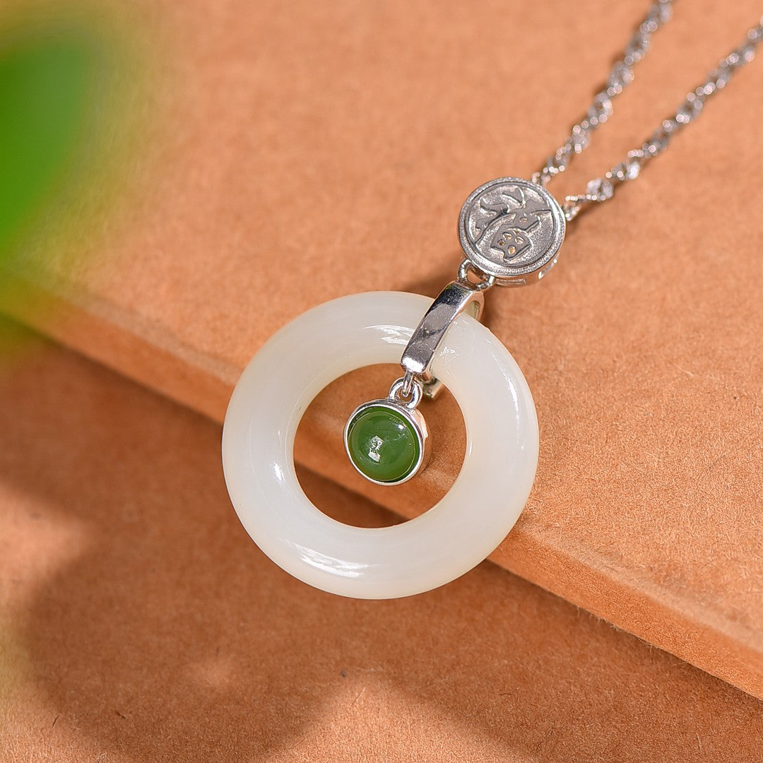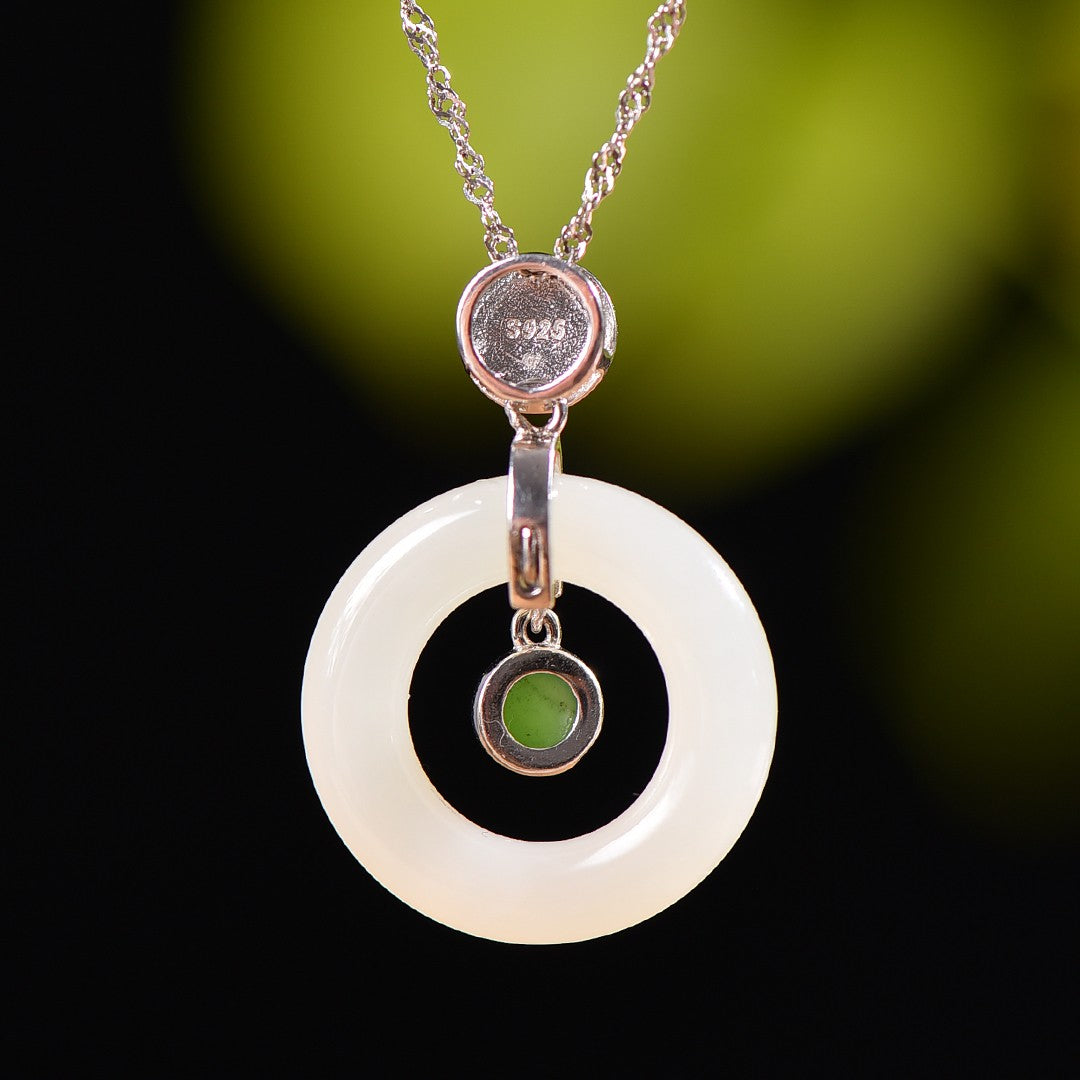 Silver inlaid Hetian jade peace ring pendant