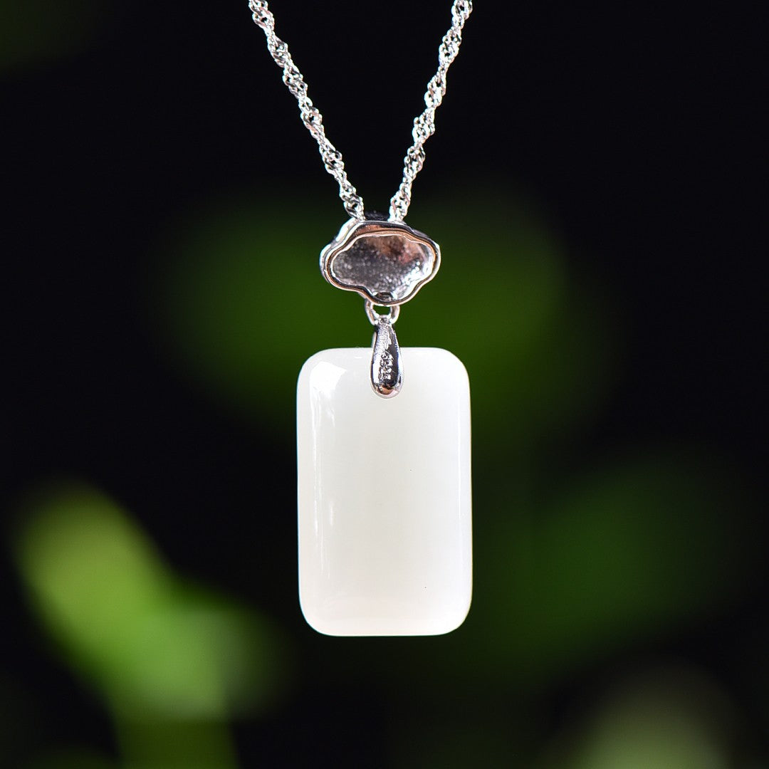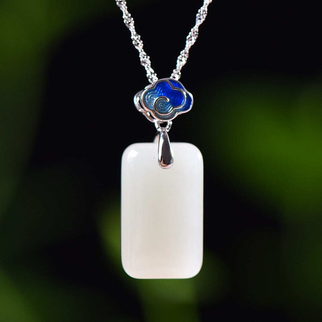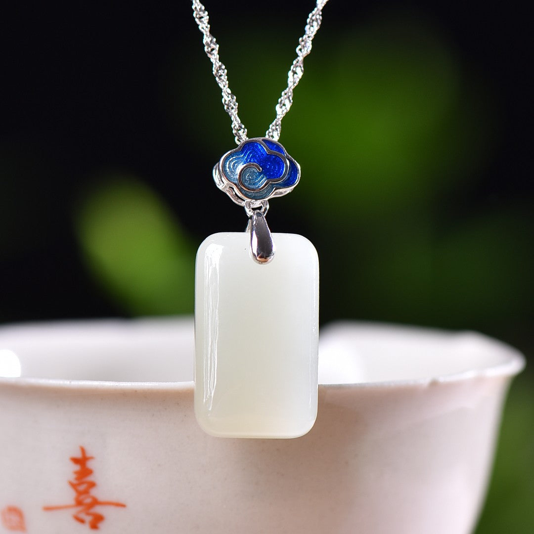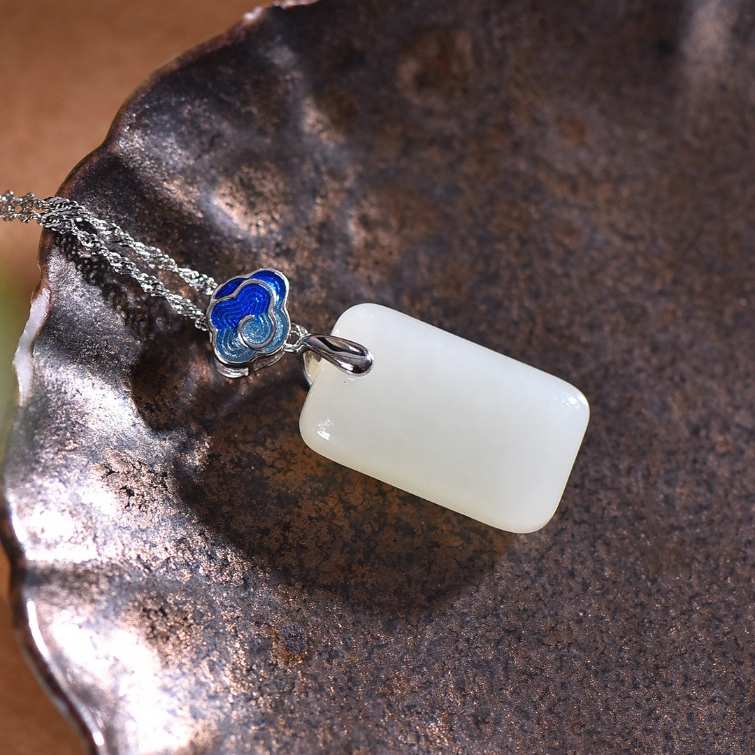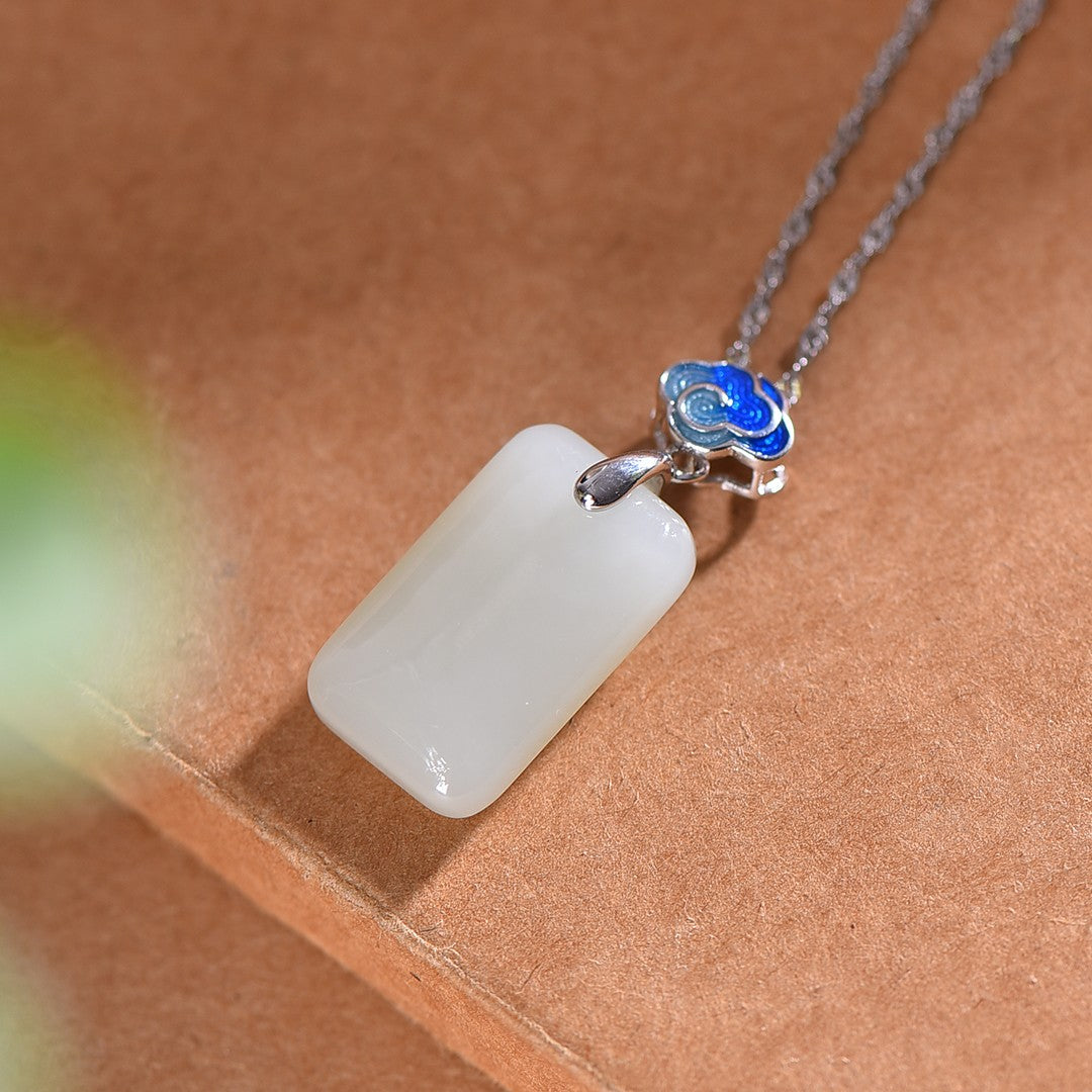 Silver-plated Hetian jade Ping An enamel pendant, jade size: 12mmx20mm       银镶和田玉平安牌珐琅吊坠
