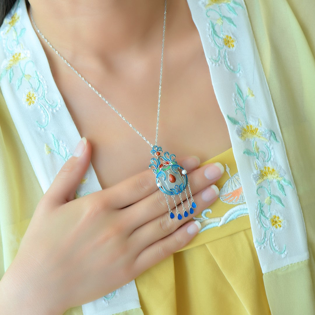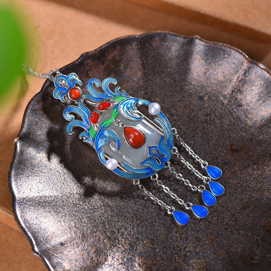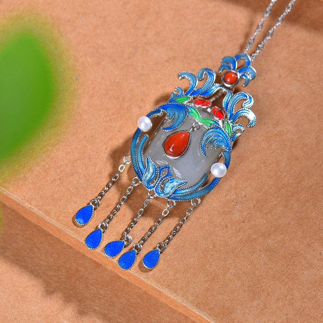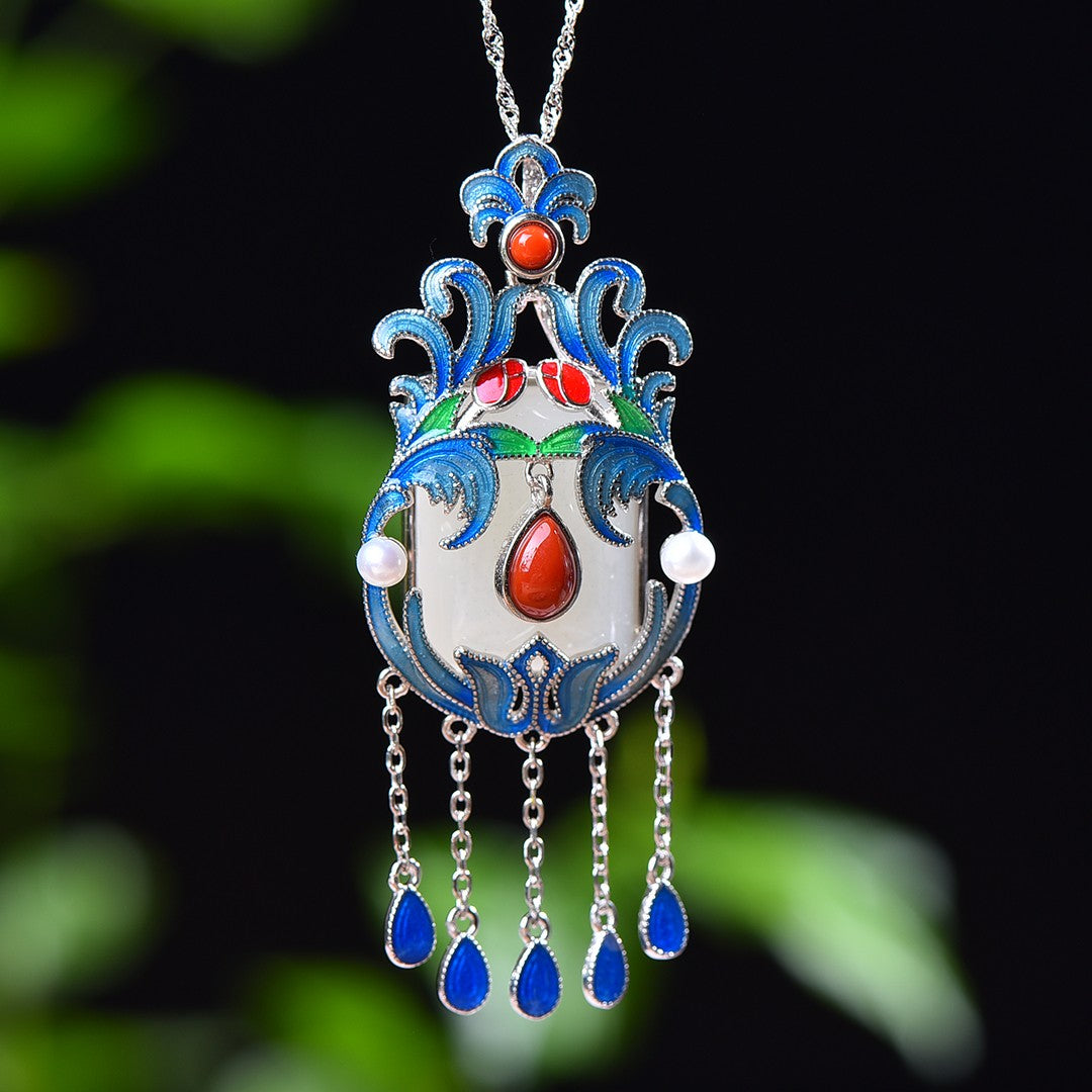 Silver-plated Hetian white jade square enamel with multi-treasure tassel pendant, jade size: 15mmx20mm   银镶和田白玉方形珐琅配多宝流苏吊坠