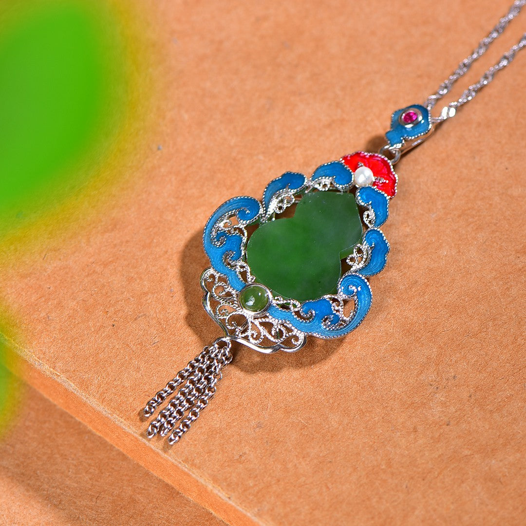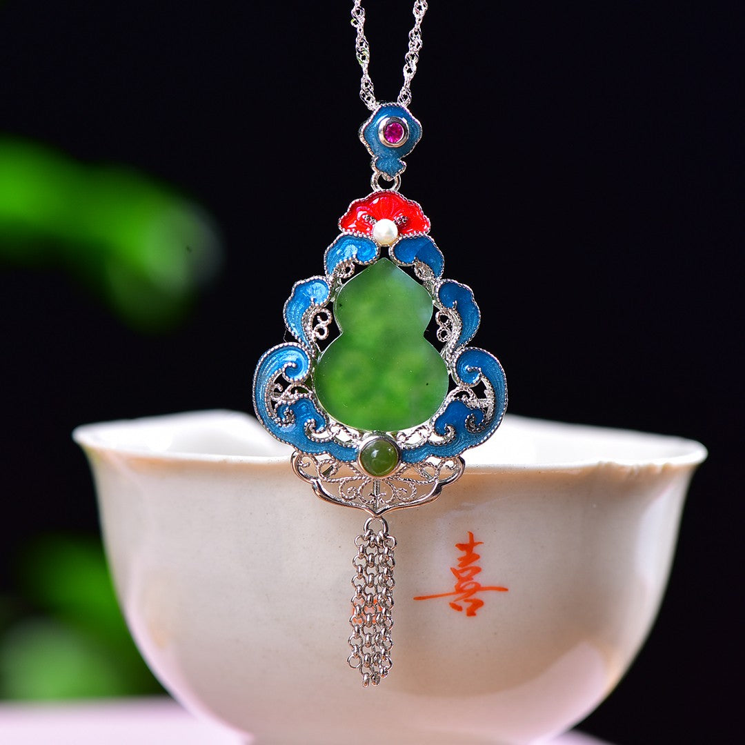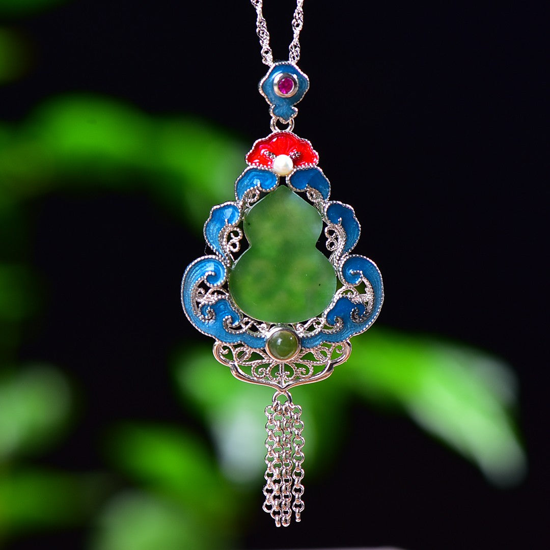 Silver-plated Hetian Jasper enamel gourd tassel pendant, jade size: 13mmx17mm   银镶和田碧玉珐琅葫芦流苏吊坠