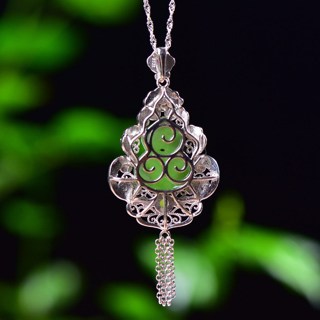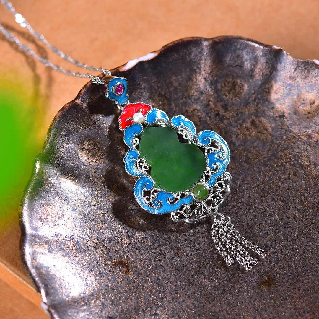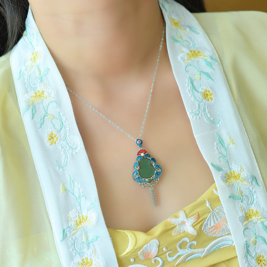 Silver-plated Hetian Jasper enamel gourd tassel pendant, jade size: 13mmx17mm   银镶和田碧玉珐琅葫芦流苏吊坠